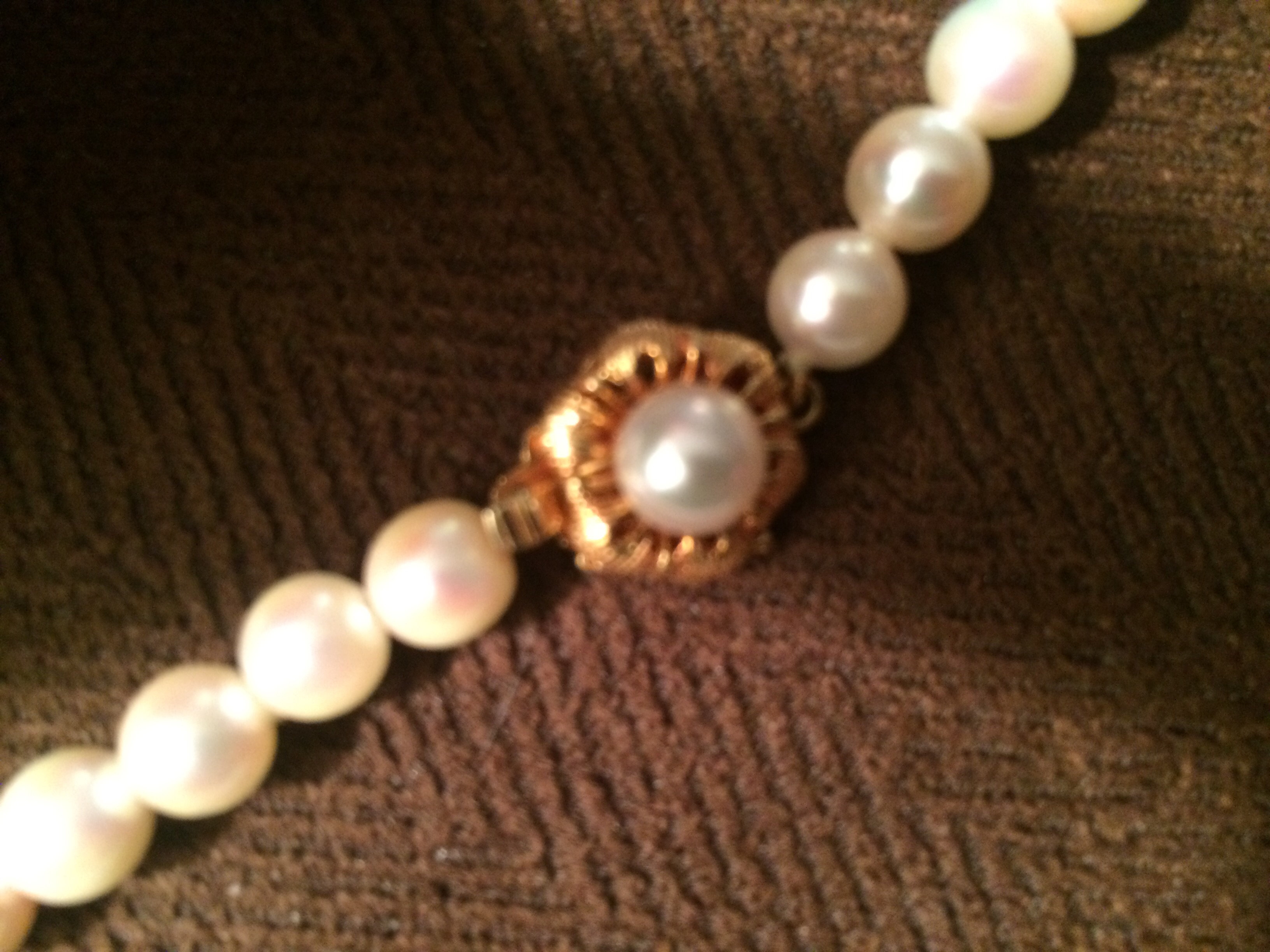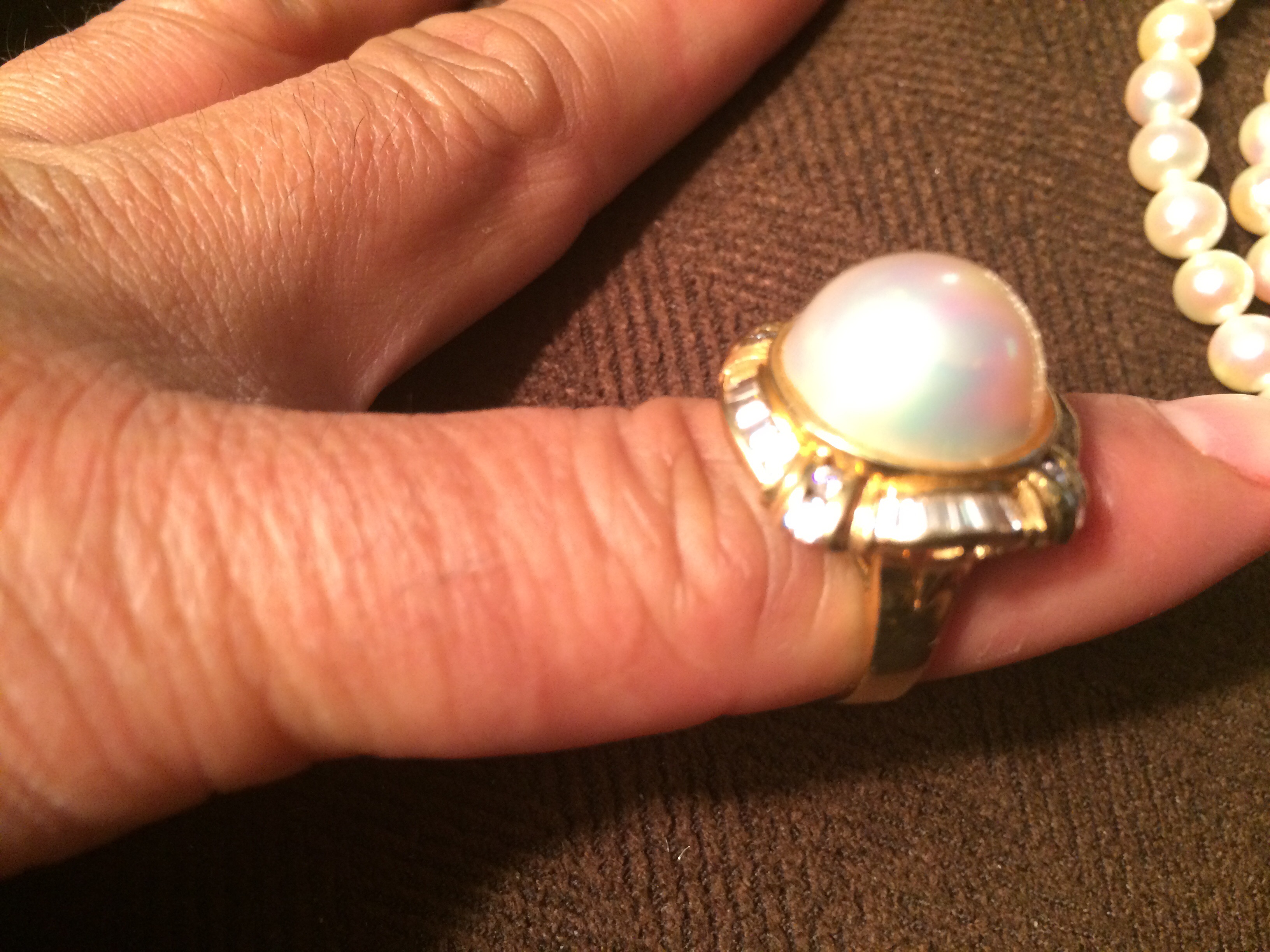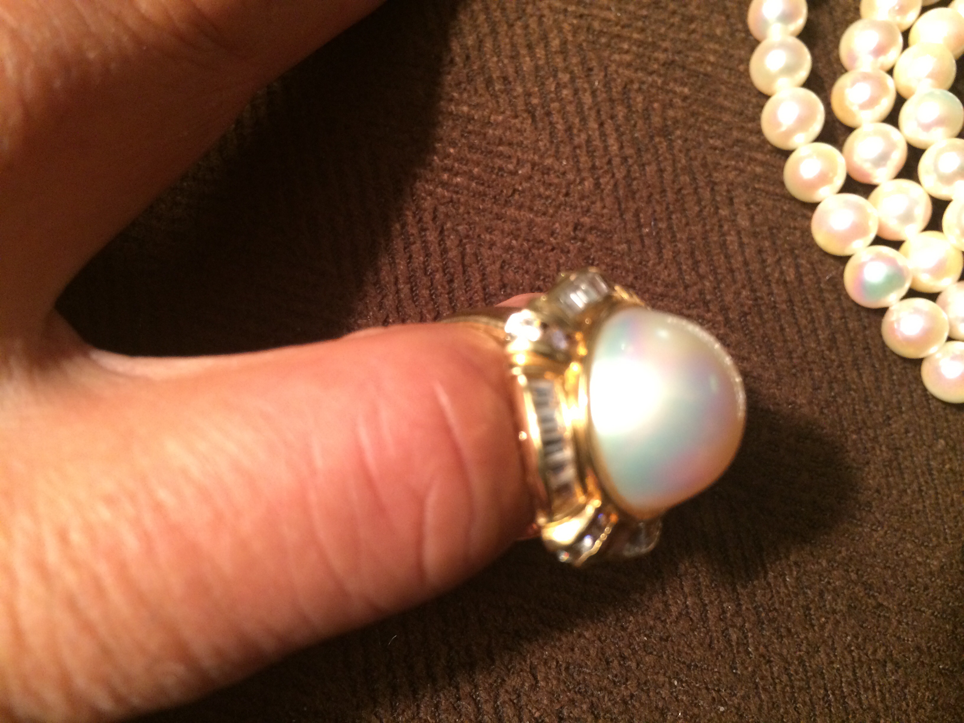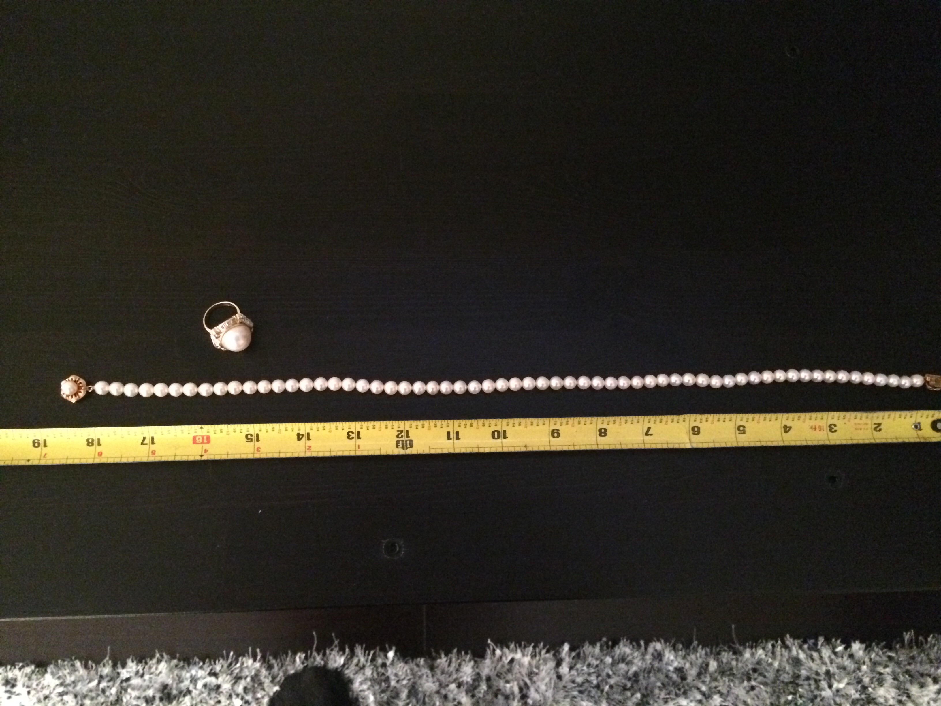 19 inchs long pearls with 18 k gold and ring with one big pearl and diamons in 18 k gold