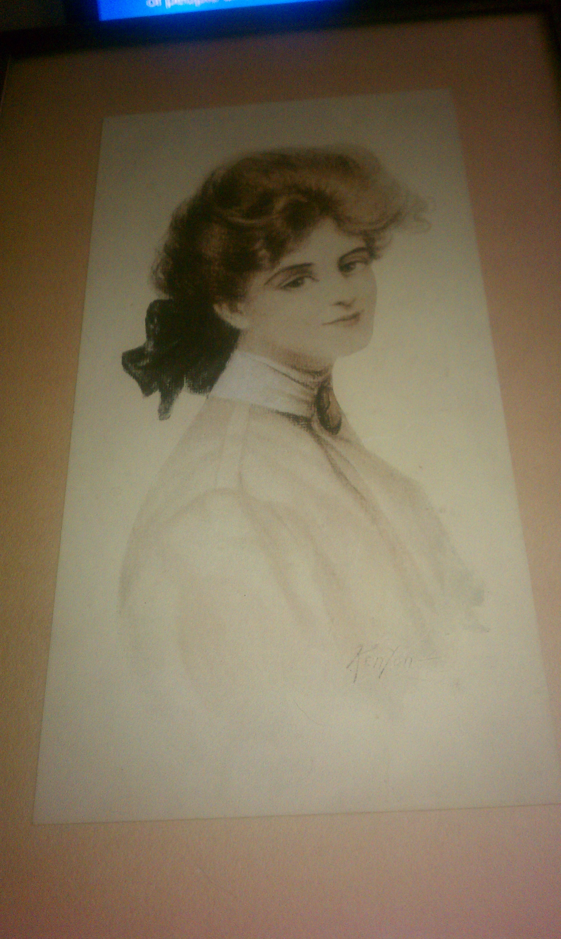 It looks to be a pencil drawing of a woman from the early 1900's. The signature in the right hand corner says Kenyon with a illegible marking next to the signature.
