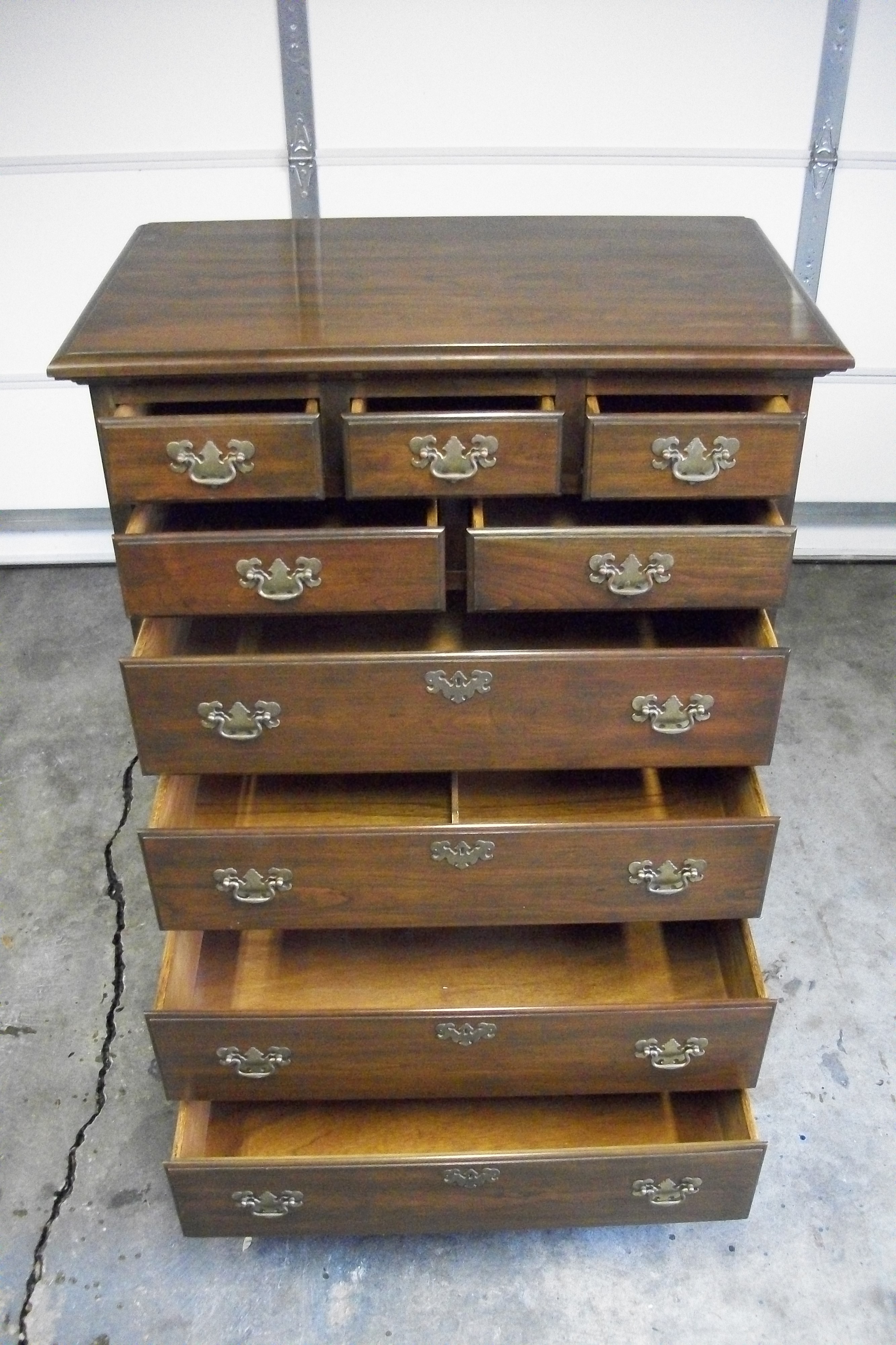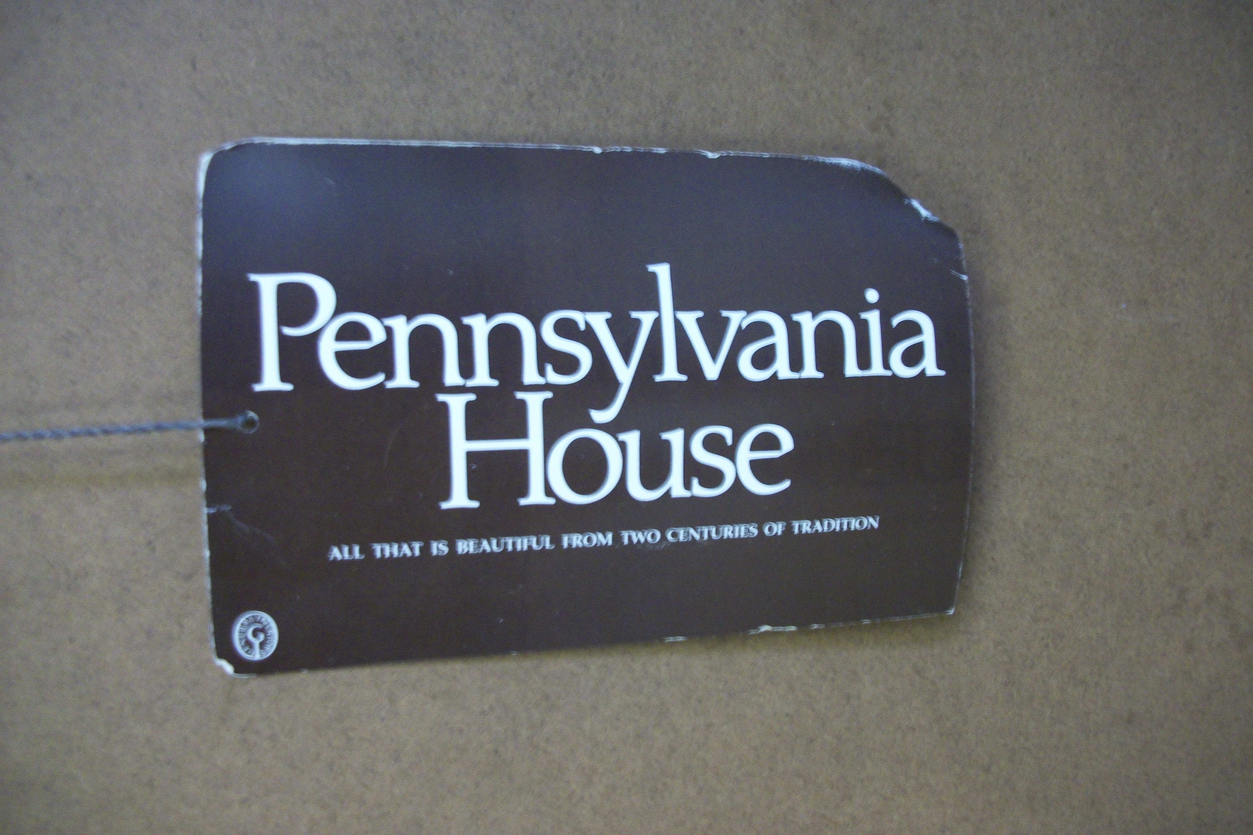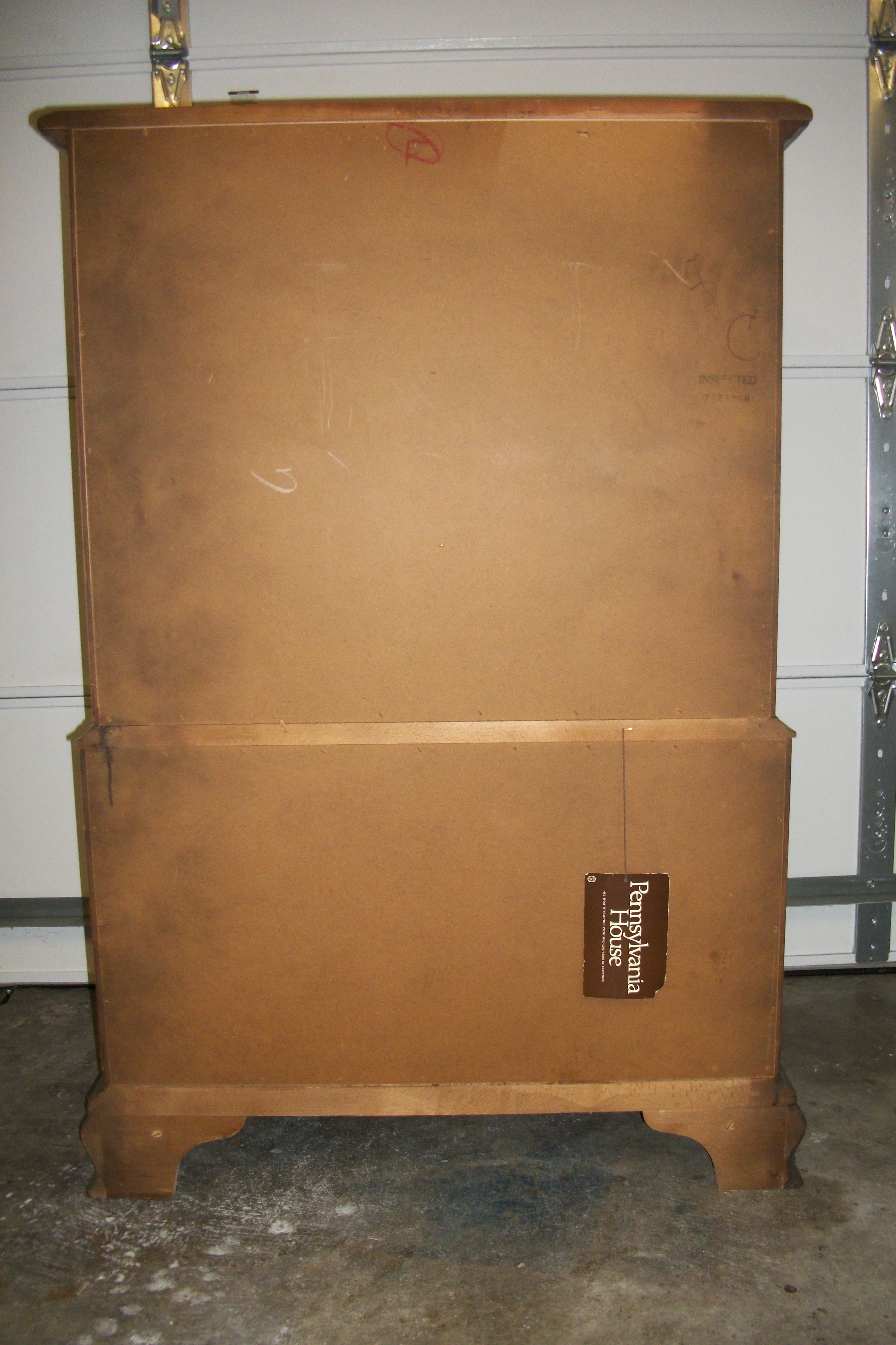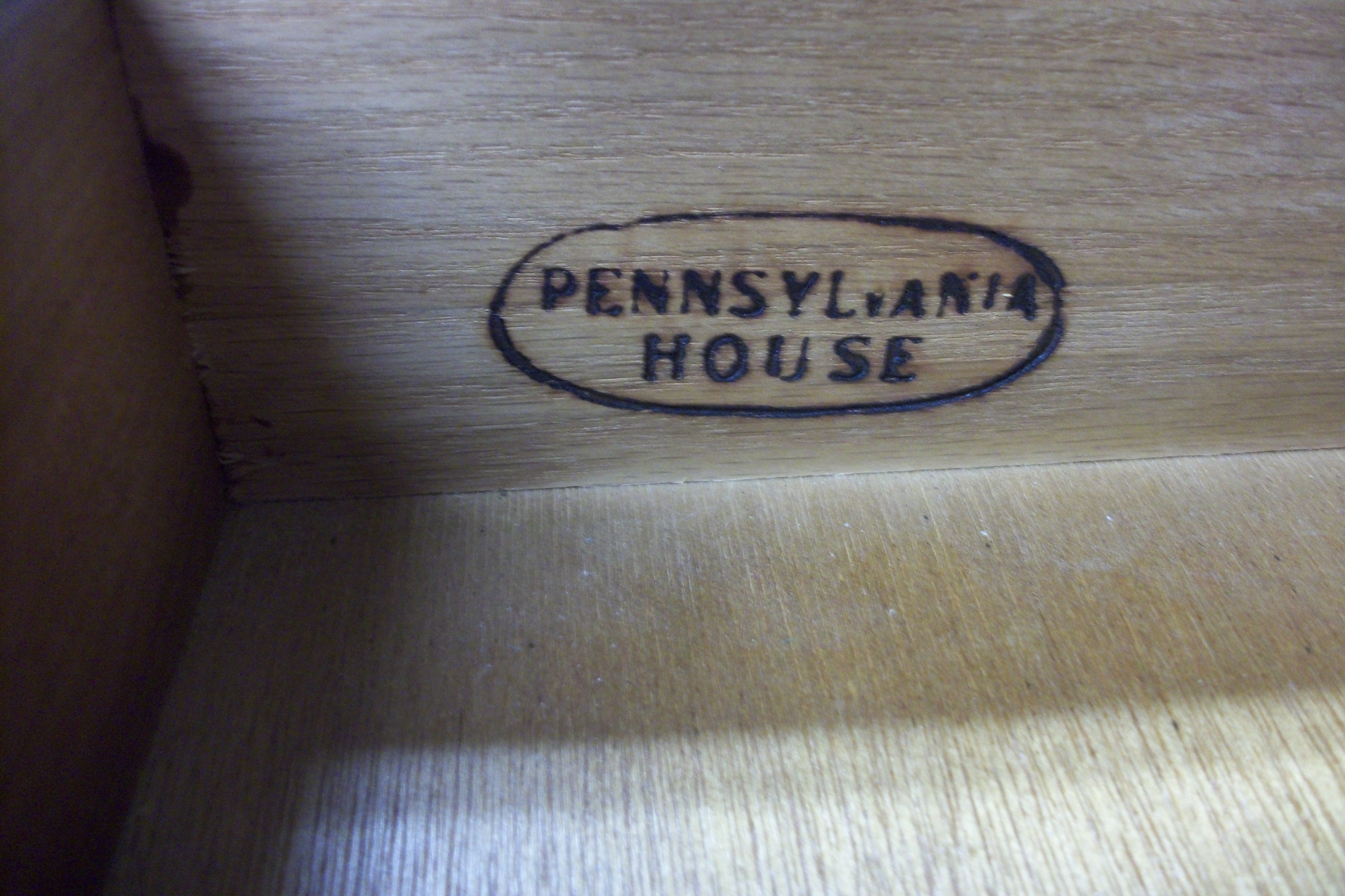 9-Drawer Chest. 35 1/2" wide at the base, and is 20 1/4" deep at the base. Is 33 3/4" wide at the top, and is 19 1/2" deep at the top. Stands 51" tall. Stamped Pennsylvania House in one drawer and has an original tag on the back side that also says Pennsylvania house on one side and Independence Hall Collection on the other side of tag. Backside is stamped 7 7 75 or 7 17 75. All drawers have dovetail joints. One of the large drawers has a wooden divider. What is the value as-is? Would it be more desirable if I touched up some of the scratches, knicks, bare wood, or should it be left alone? Can you tell the species of wood from the photos? Thanks!