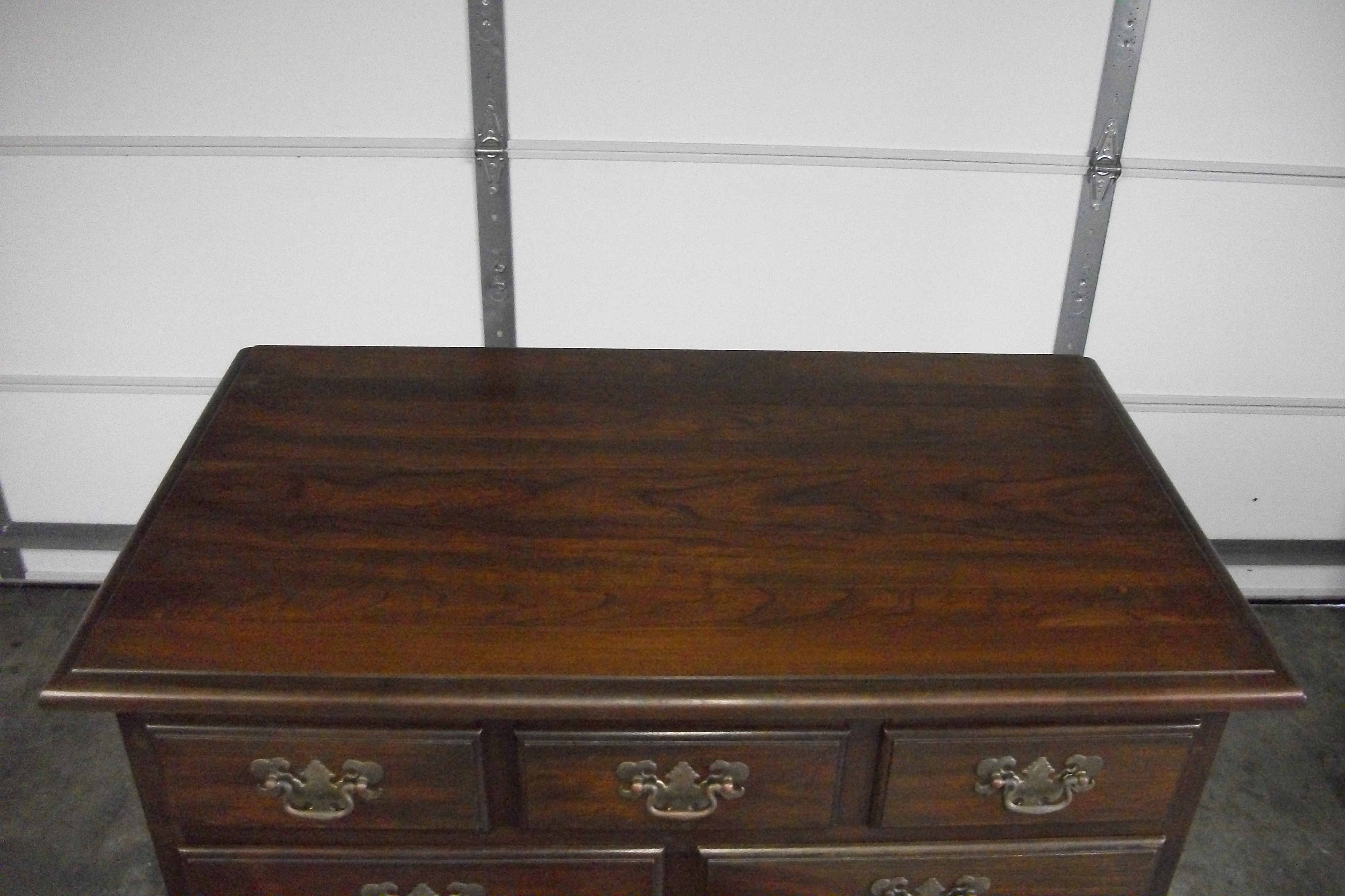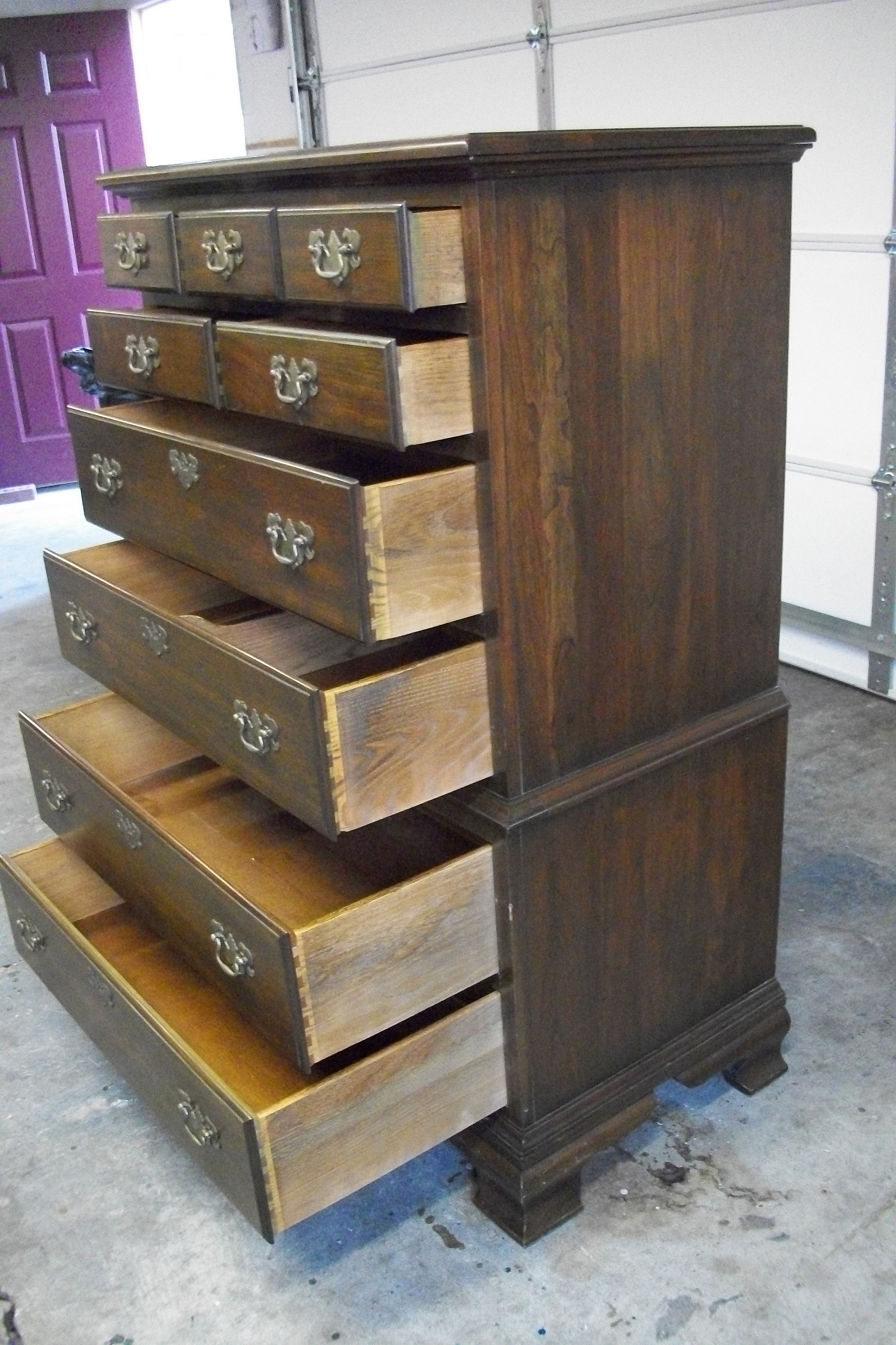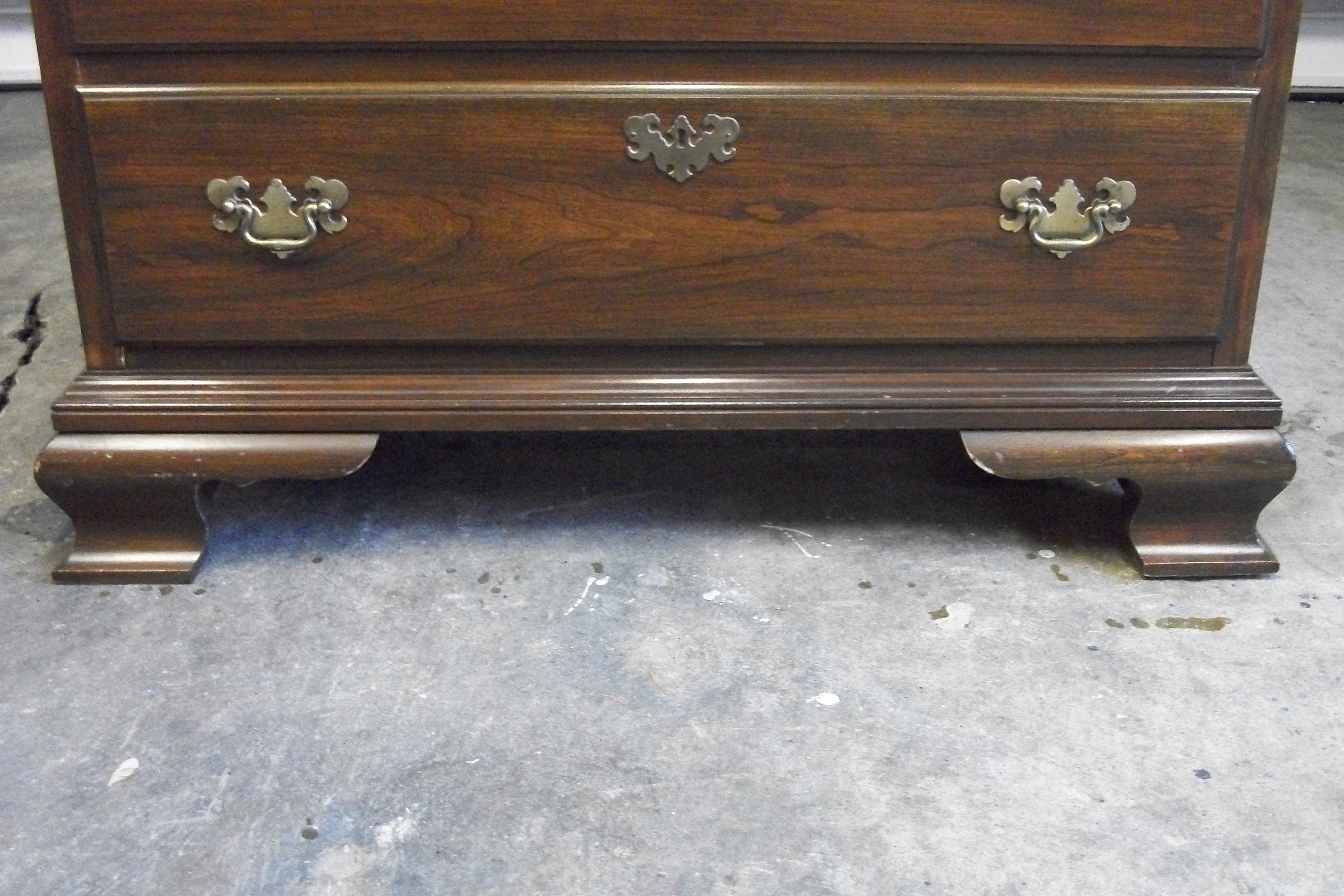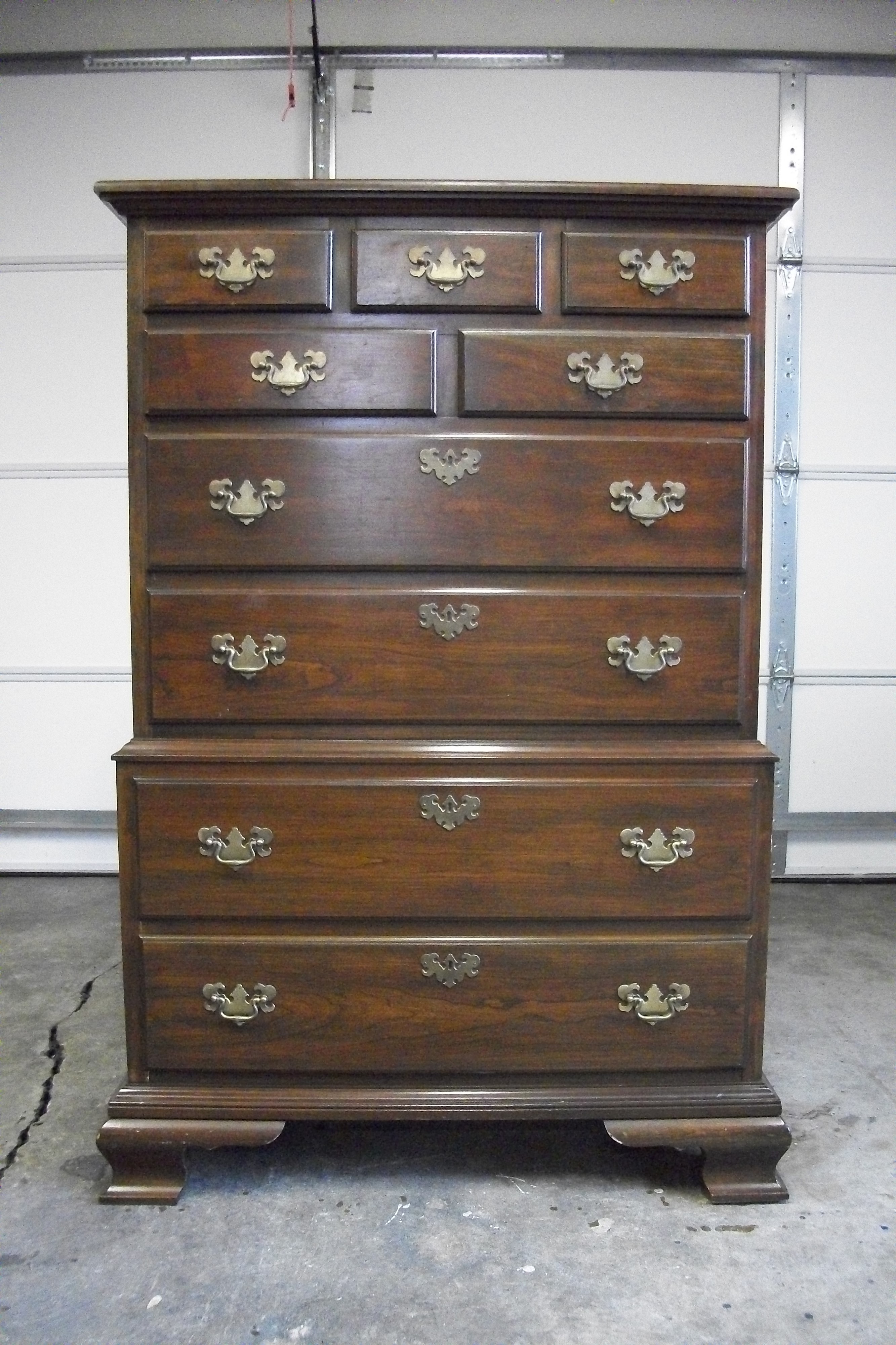9-Drawer Chest. 35 1/2" wide at the base, and is 20 1/4" deep at the base. Is 33 3/4" wide at the top, and is 19 1/2" deep at the top. Stands 51" tall. Stamped Pennsylvania House in one drawer and has an original tag on the back side that also says Pennsylvania house on one side and Independence Hall Collection on the other side of tag. Backside is stamped 7 7 75 or 7 17 75. All drawers have dovetail joints. One of the large drawers has a wooden divider. What is the value as-is? Would it be more desirable if I touched up some of the scratches, knicks, bare wood, or should it be left alone? Can you tell the species of wood from the photos? Thanks!