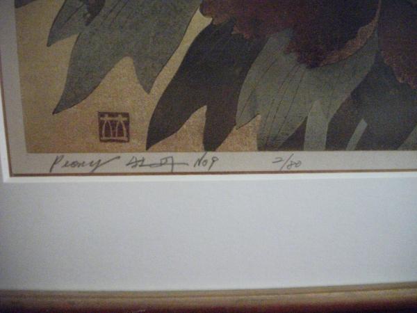 The work is signed, dated '88, title is "Peony" lot number 9 and numbered 2 of 80. The signature line is done in pencil, and actually is signed into the gold leaf. When he signed, the artist etched off some of the gold leaf with his signature.