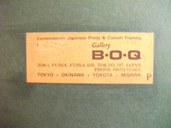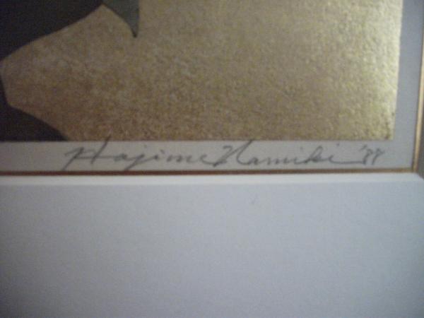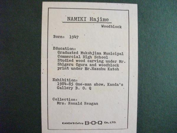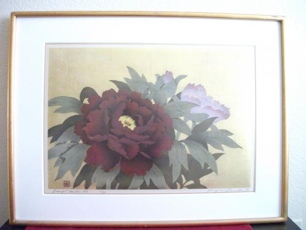 This is an original Namiki Hajime woodblock print. Red peony flower and leaves over 24k gold leaf sheets. It is 24x18 with original frame; the painted area is 12x18 and has a gold leaf trim around the print, and the back of the painting is green with a center tag that gives a brief history of the artist, born 1947, and says that the work was for the Mrs. Ronald Reagan collection. It also has in the lower right hand corner an orangish tag from the gallery, BOQ with the address and an area that looks like it may have been a signature stamp on the tag.