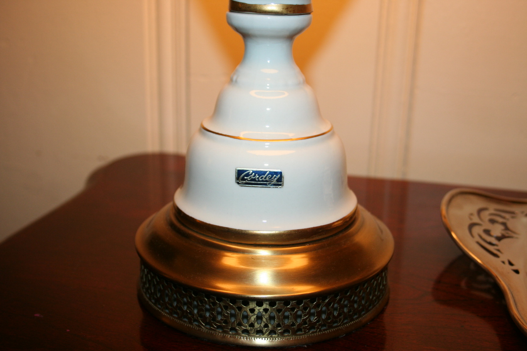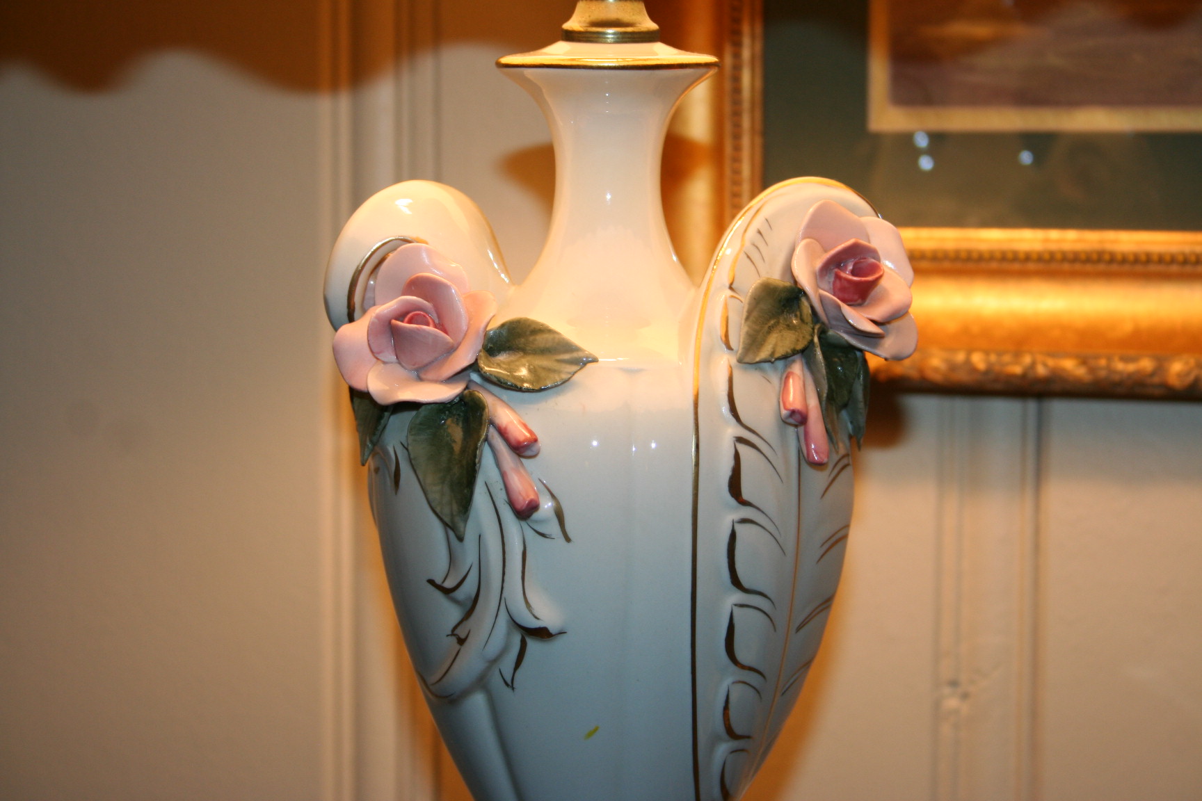 This Cordey Lamp has several Pink flowers accentuated by delicate leaves all set in a gracious flowing pattern in the lamps architecture. All the detail of the flowers and leaves is attached and not missing with no chips or cracks. The decorative base is in excellent condition. It has felt like material on the bottom of the base. Part of this felt like material has lost contact with the base. Still functional and not visible obtrusive. The Lamp has not been rewired and The Cordey marking is attached. From the bottom base of the Lamp to the start of the socket it measures about 17 1/4" high. Measurements may be off a hair or two, but not much. I would like help pricing this. Thank you!