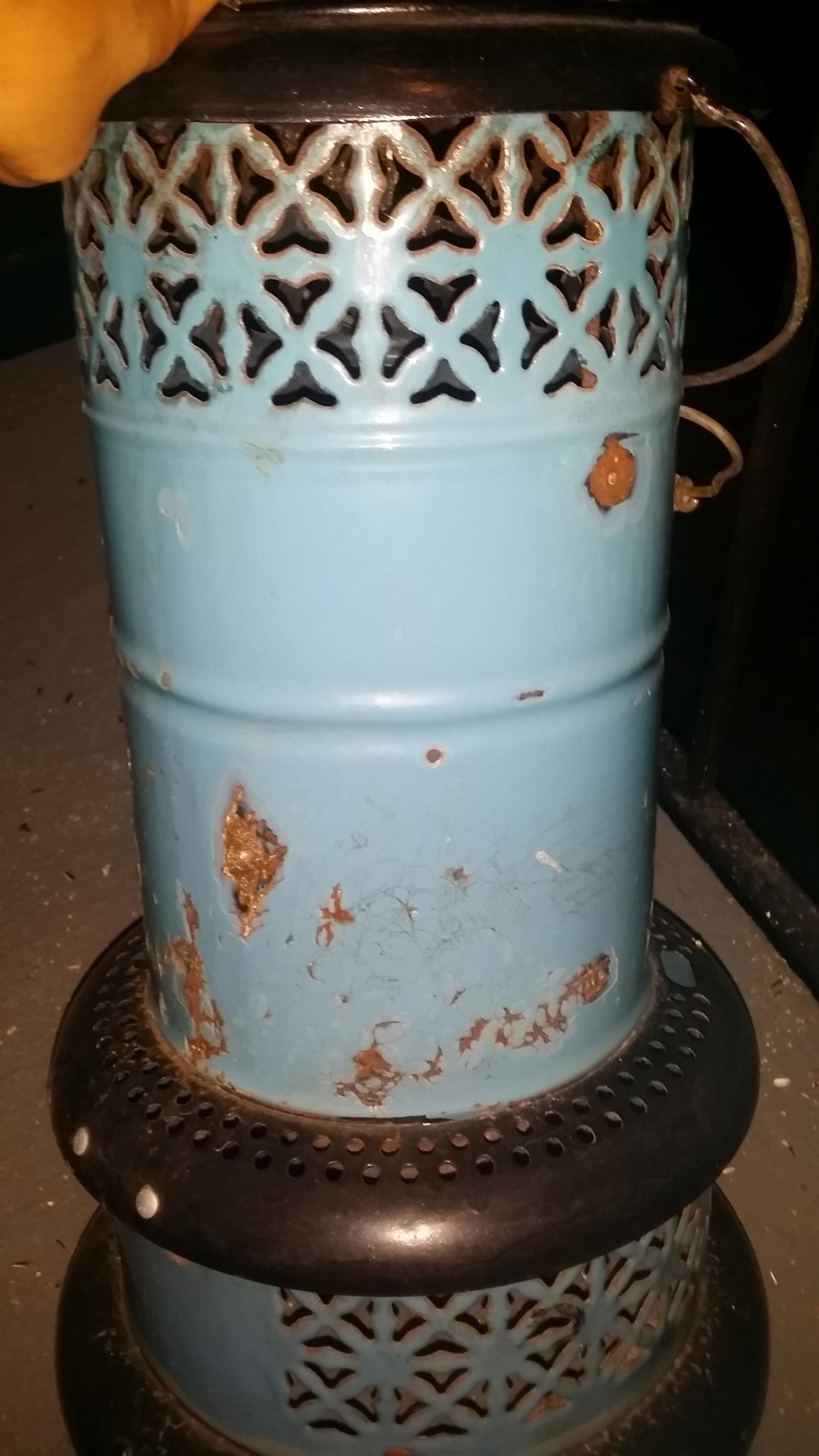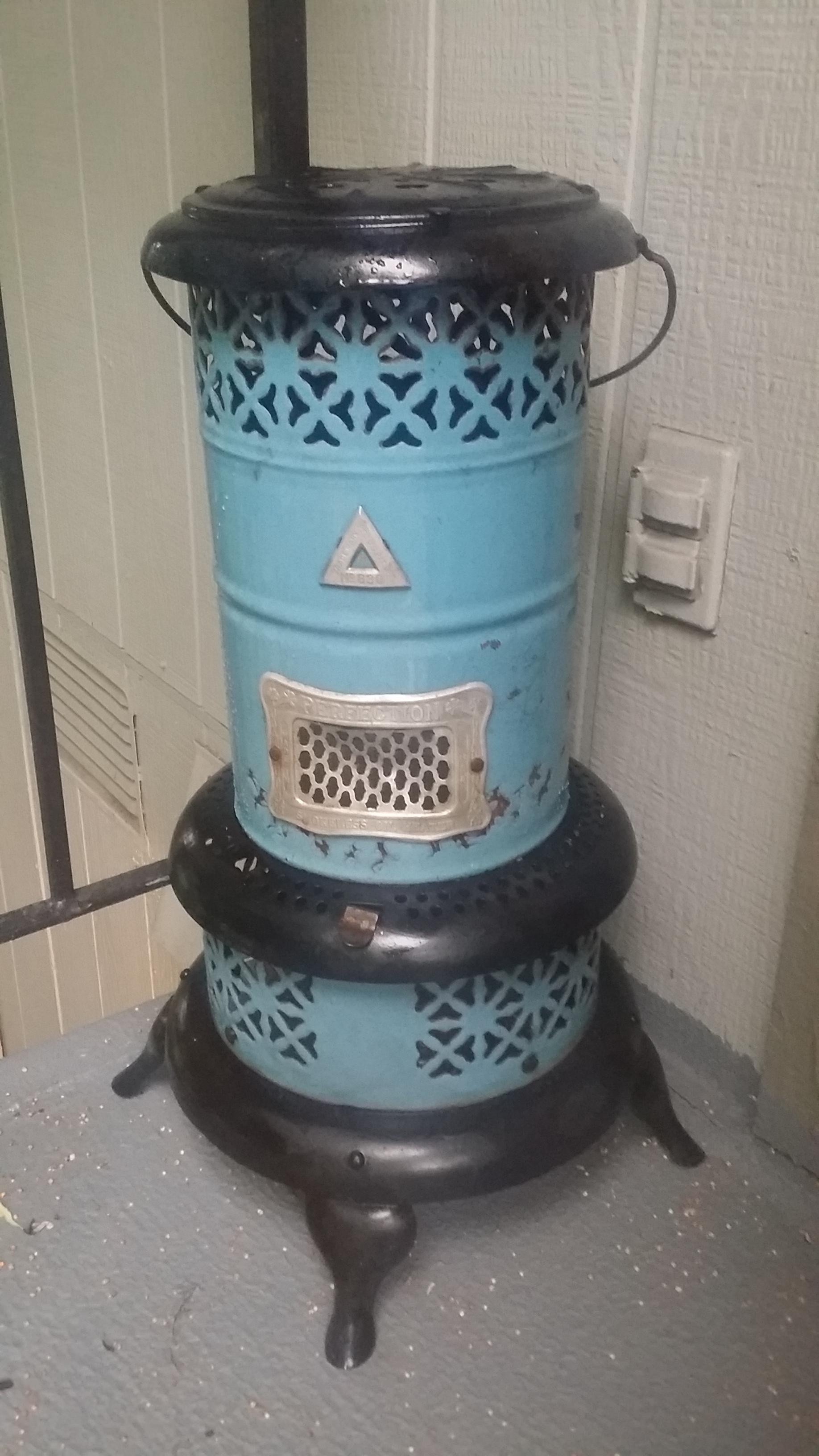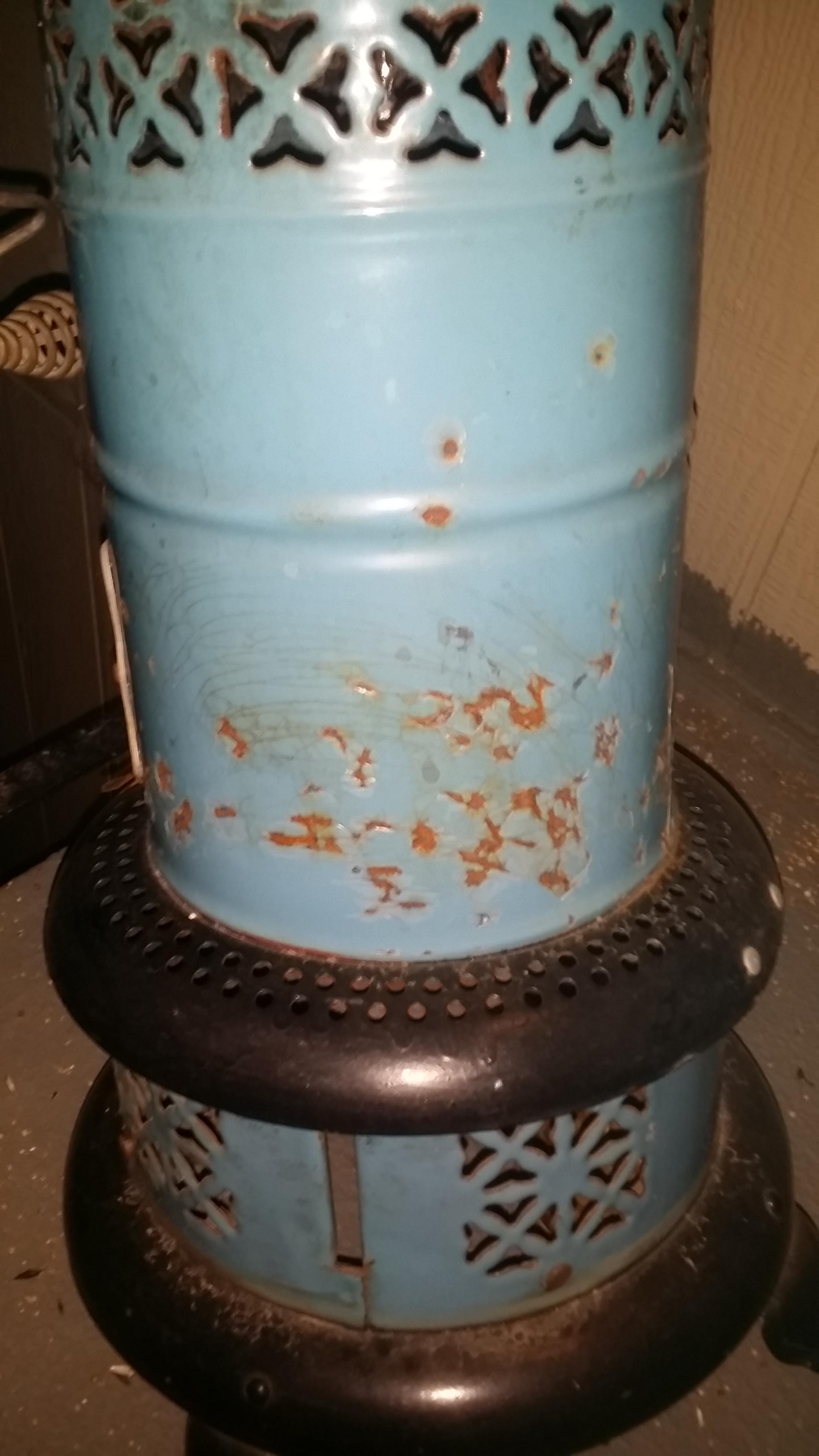 It's the shell of a Perfection Smokeless oil heater No.630. It has some rust on it but not much. It is missing the kerosene tank but it's in sturdy condition. It doesn't wobble and all the other parts function just fine.