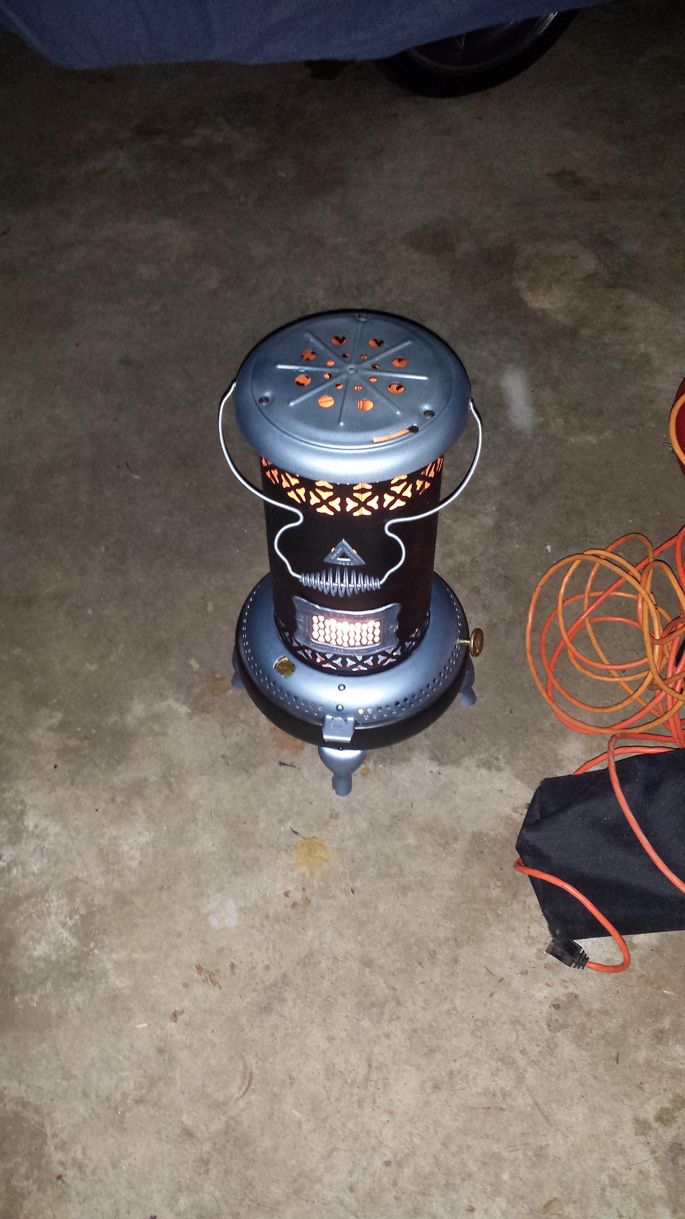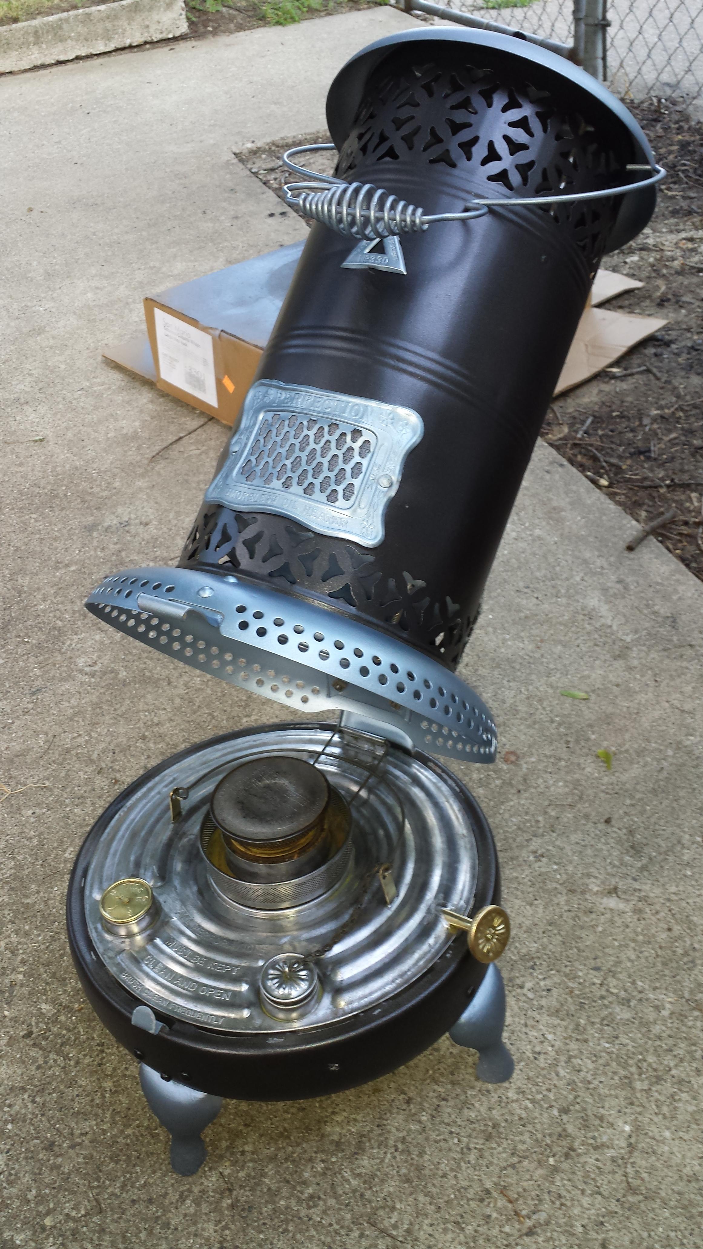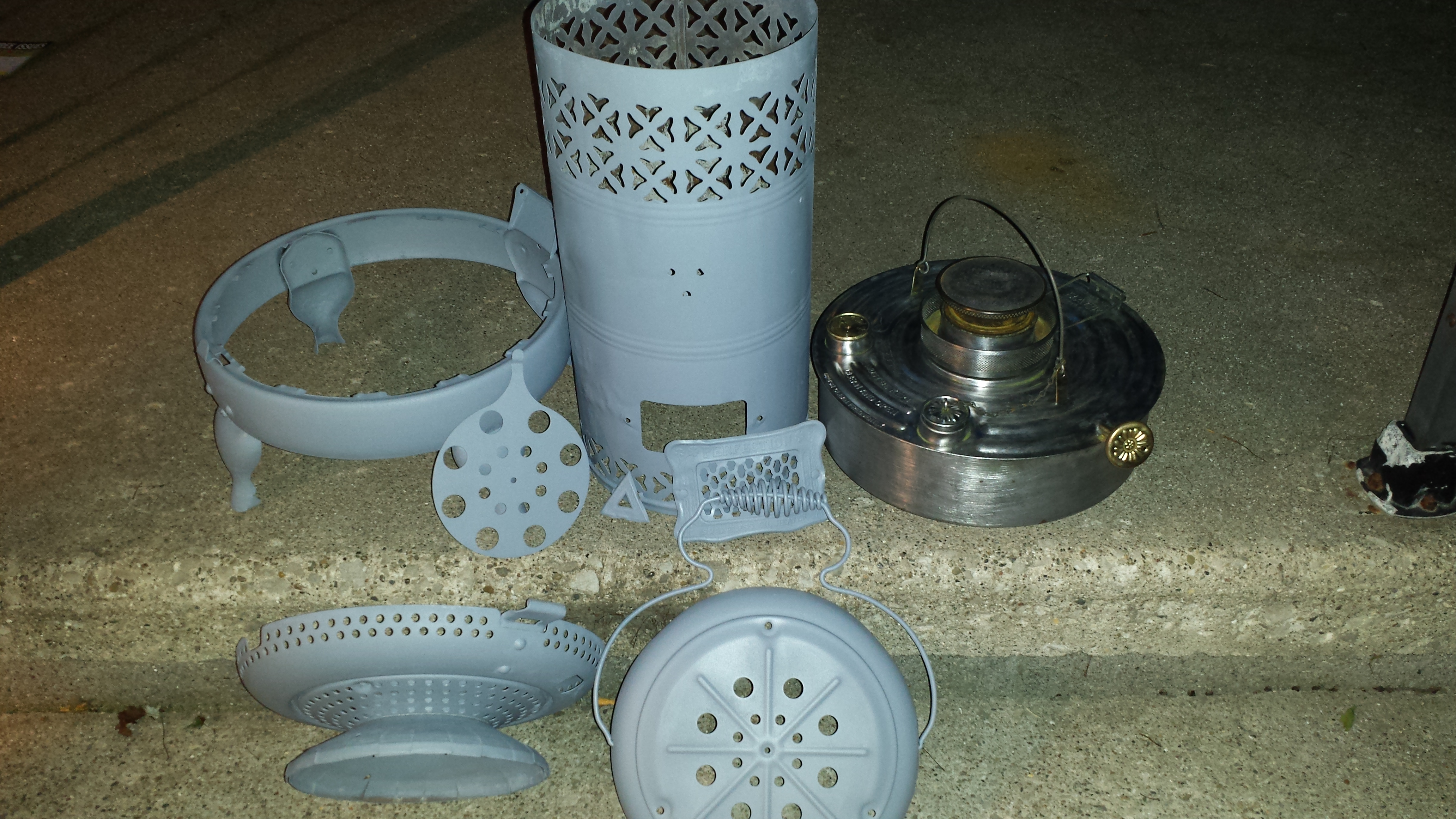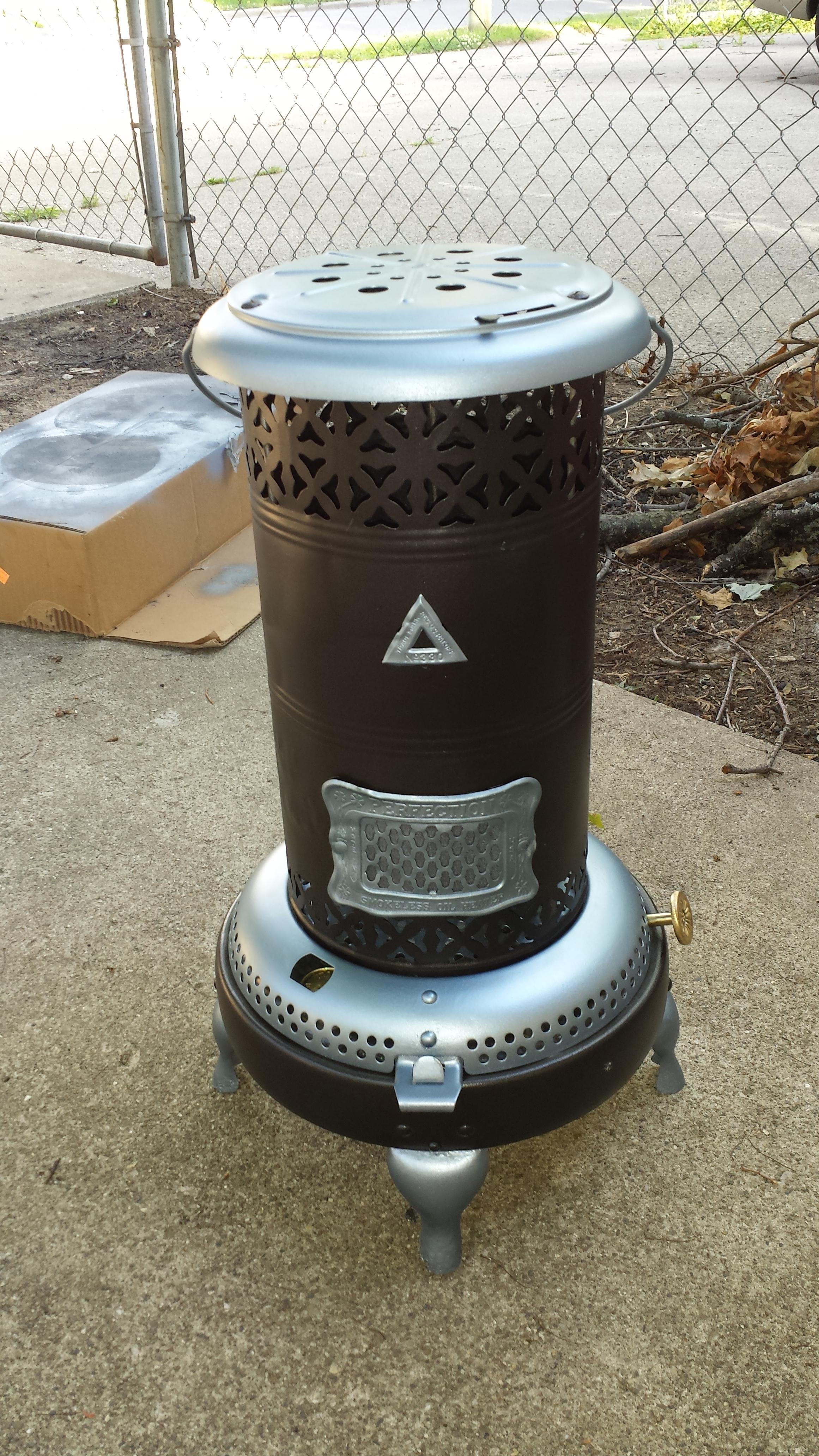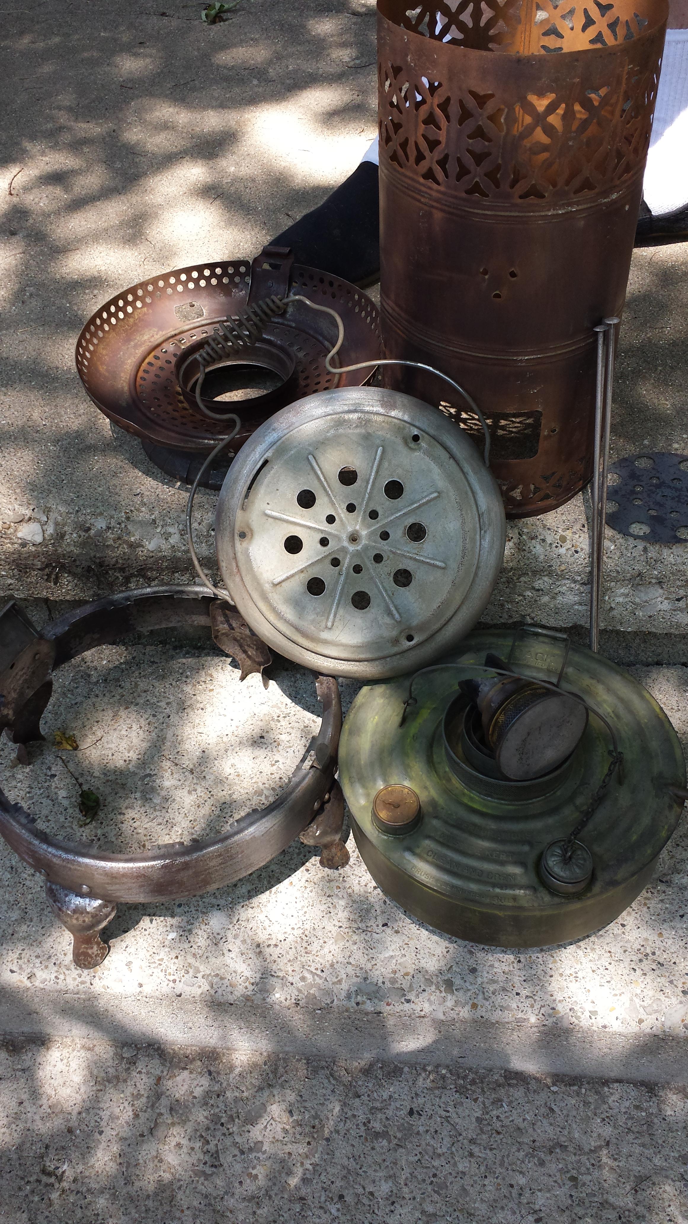 I derusted to bare metal. Painted with heat proof primer and paint. All original parts including original wick and carrier. Small dings in main body. Four legs had a lot of wear at the bottom. Welded small hole in fuel tank. No leaks.