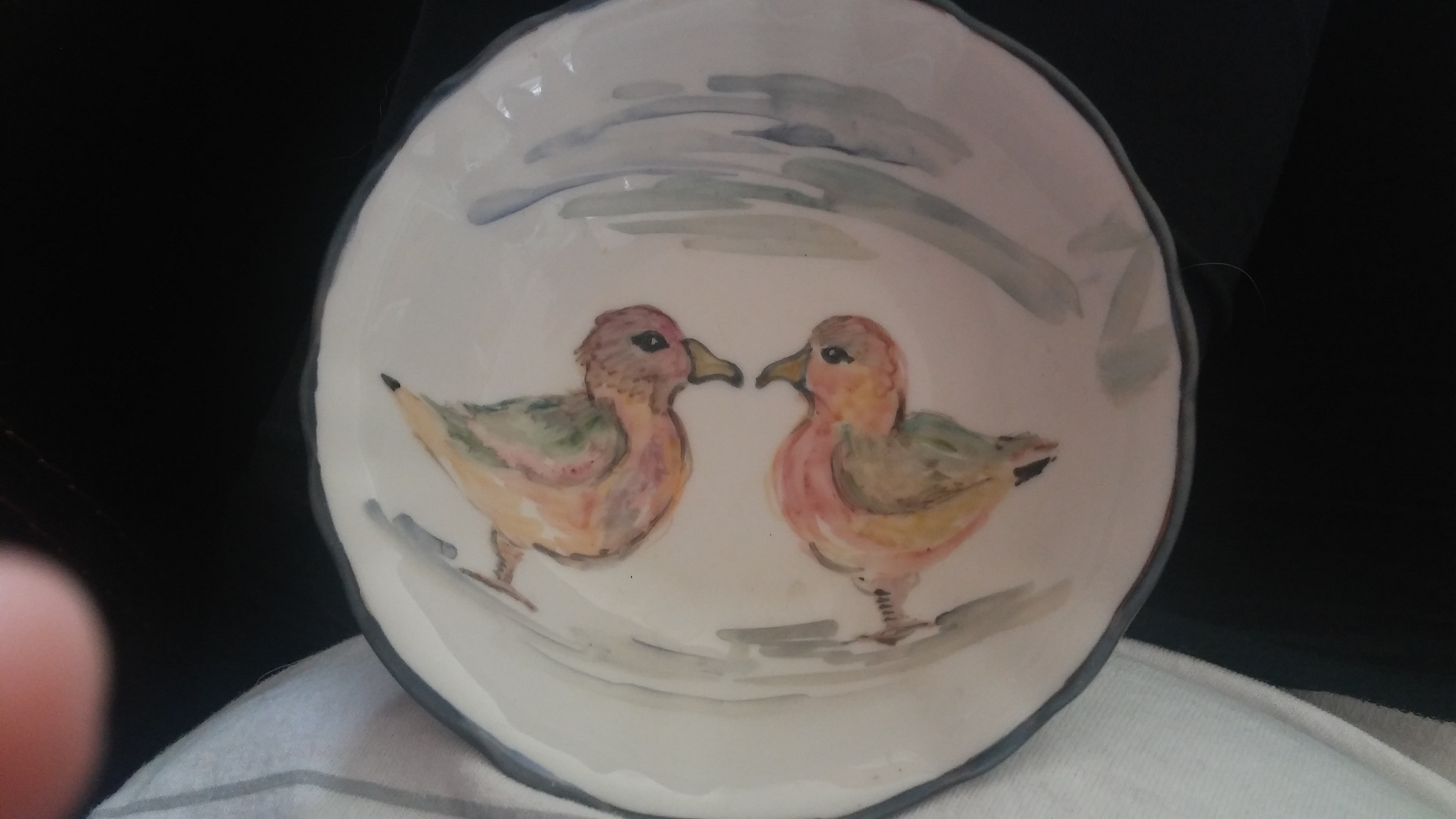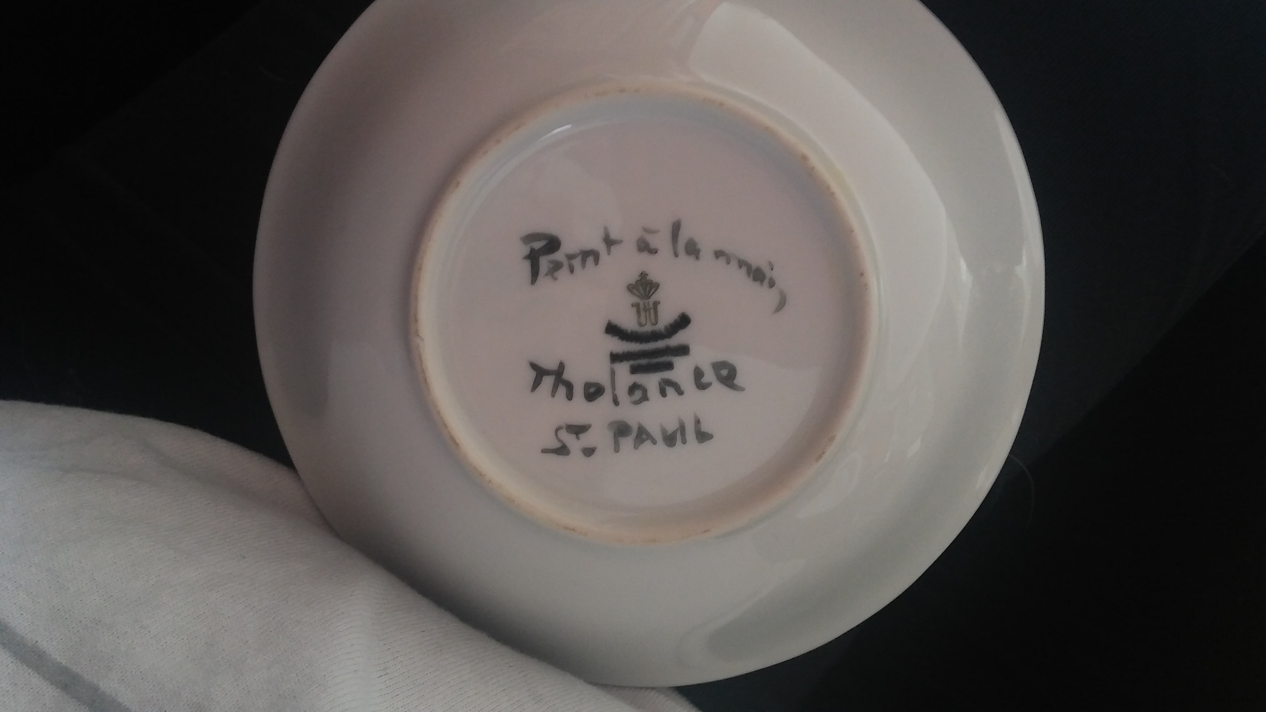 A small bowl w 2 ducks. Tha back is signed pernt a la main and the rest i cant really make out. Tholaner? St paul?