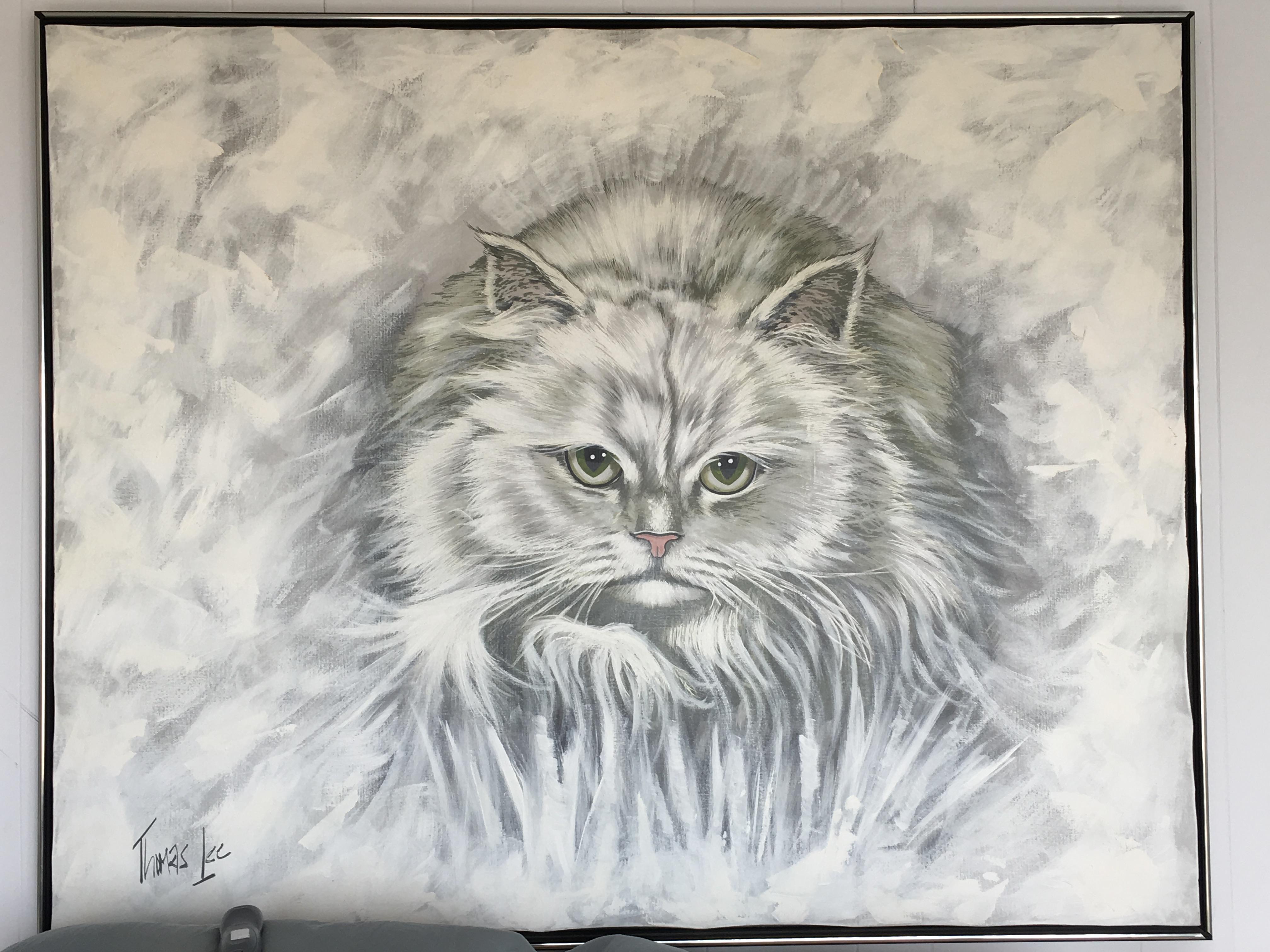 Over 5’ x 4’ oil painting of a Persian cat. Signed Thomas Lee. Easily over 40 years old. Hanging in the condo we recently purchase with various vintage 70’s memorabilia.