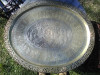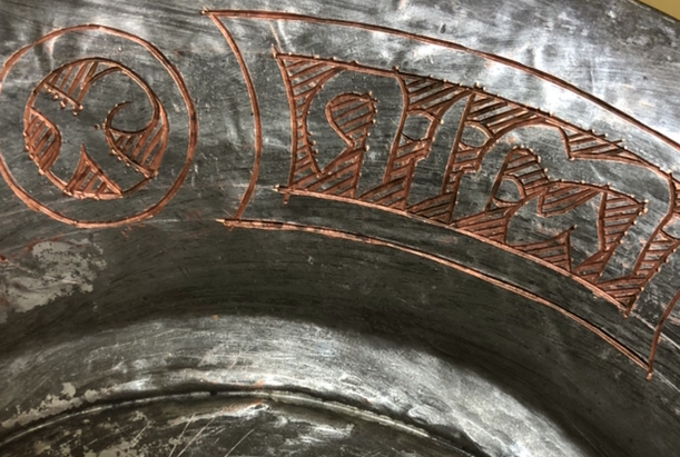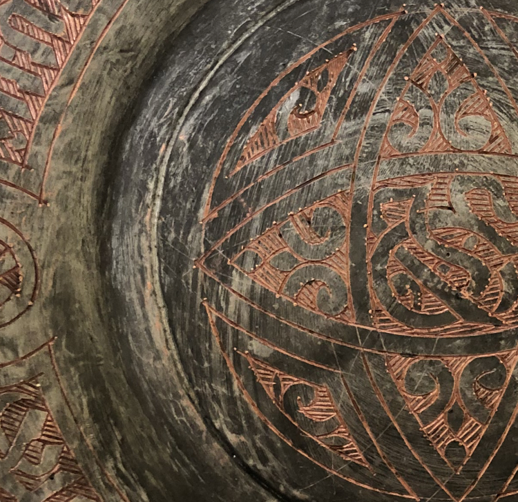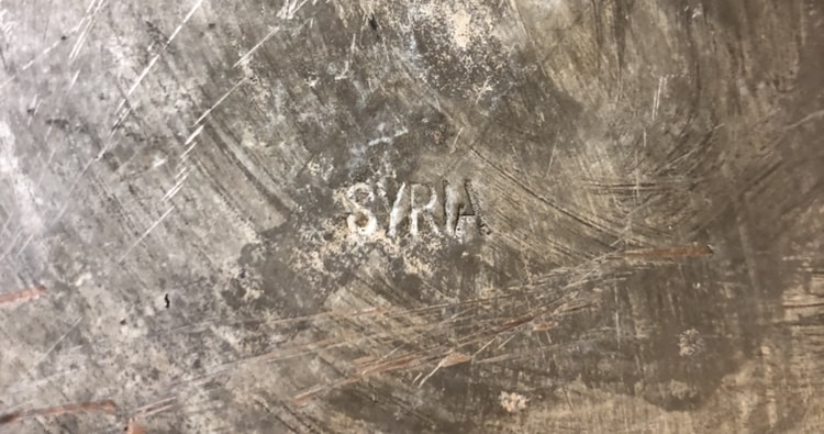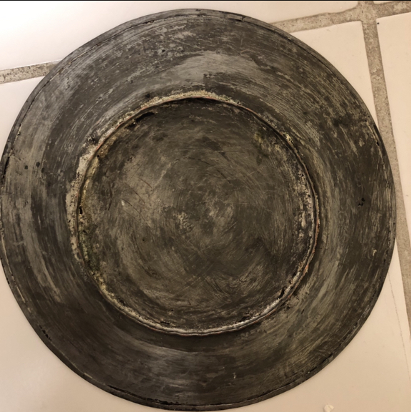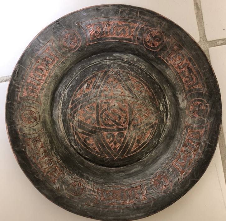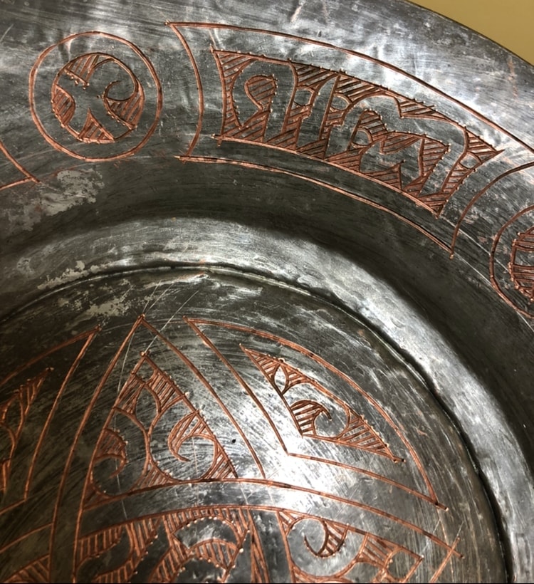 Crudely etched designs by hand. Could be letters/words etched along the outer rim of the plate. On the bottom of the plate it is stamped or etched the word “SYRIA”. The plate is clearly copper but I am unsure what other metals it may contain.