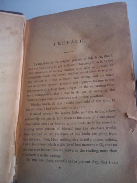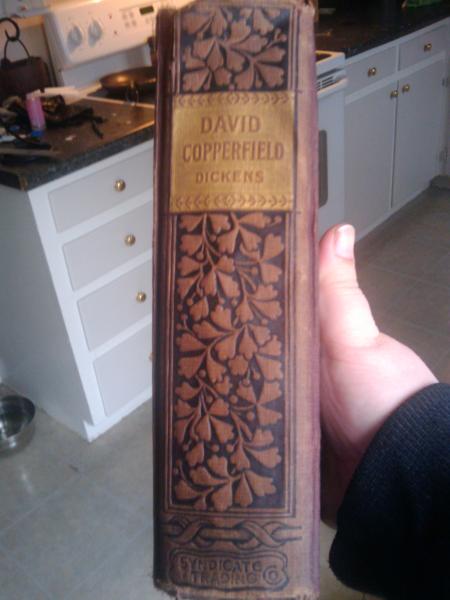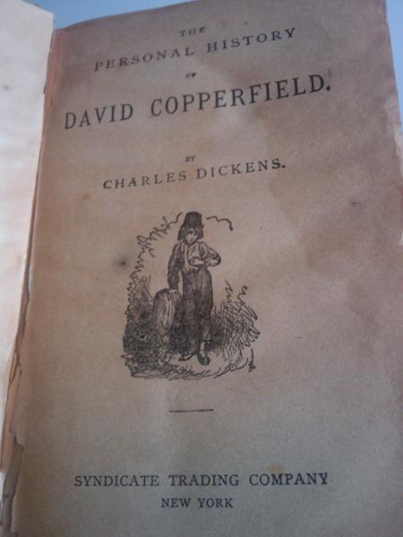 The book is titled The Personal History of David Copperfield by Dickens, the paper feels like a combination of parchment/trace paper, has writing in the front of the book " WM. L Carlton from Aunt Caroline August 10, 1889" papers are turning rust colored from aging.