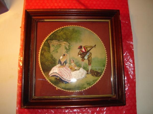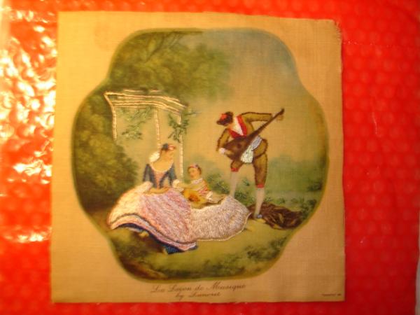 8" x 8" petitpoint and painted ( interlock?)mono(48ct) canvas of La Lecon De Musique by Lancret (HIAWATHA 68)in a wood frame
