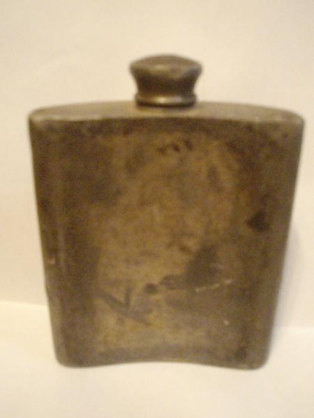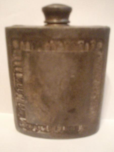 It is obviously used. (scratchs, worn areas, dirt, nicks, etc.) The sides meet along the top and bottom edges and curl over them slightly and appear to be fused (welded?). There is a repeating pattern in a large rectangle on the front. The repeating shapes are somewhat like an arrowhead or half of a link of a chain. The cap is threaded.