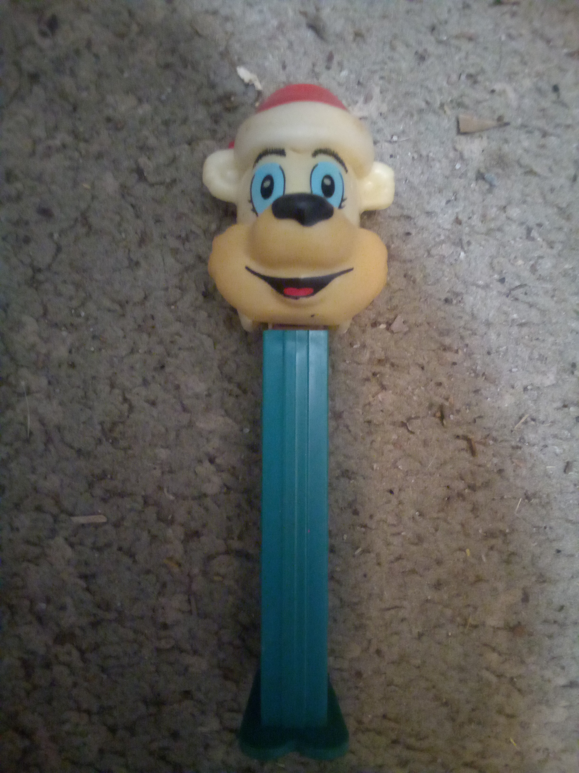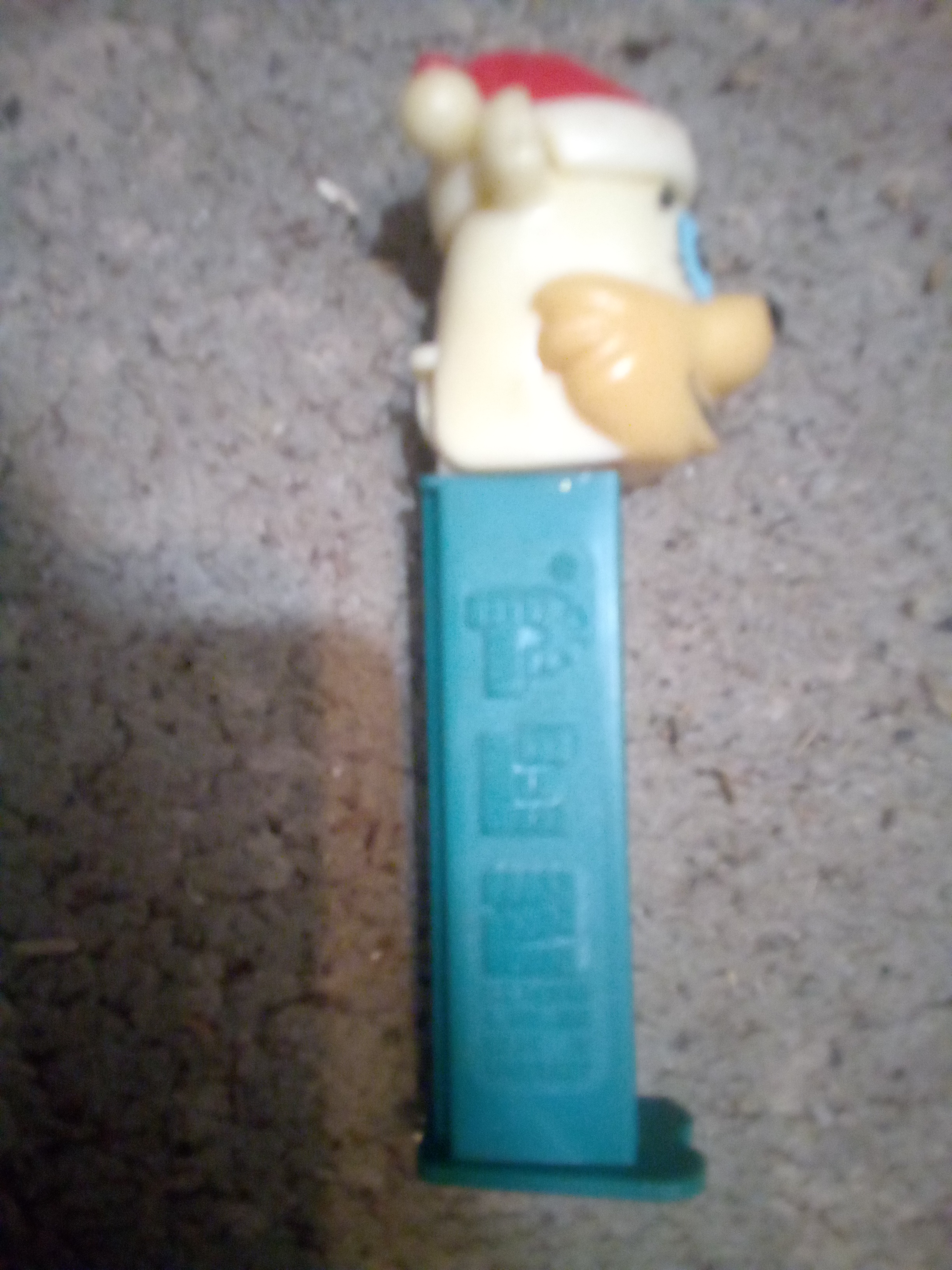 Description: This Pez dispenser features a Christmas bear character with a festive red Santa hat. The bear's face is cheerful, showcasing bright blue eyes and a wide smile, making it an appealing collectible for fans of Pez dispensers and holiday-themed items.