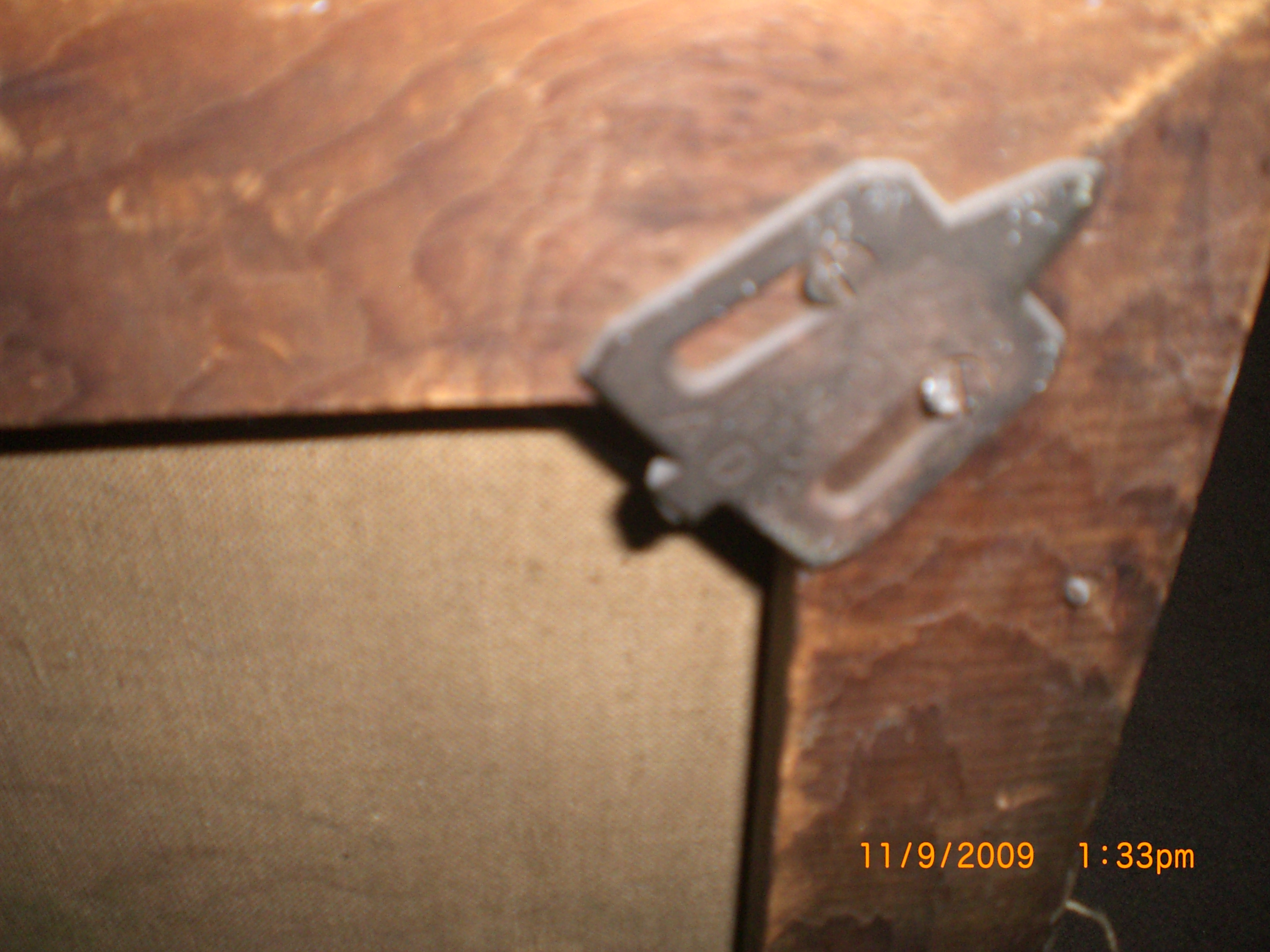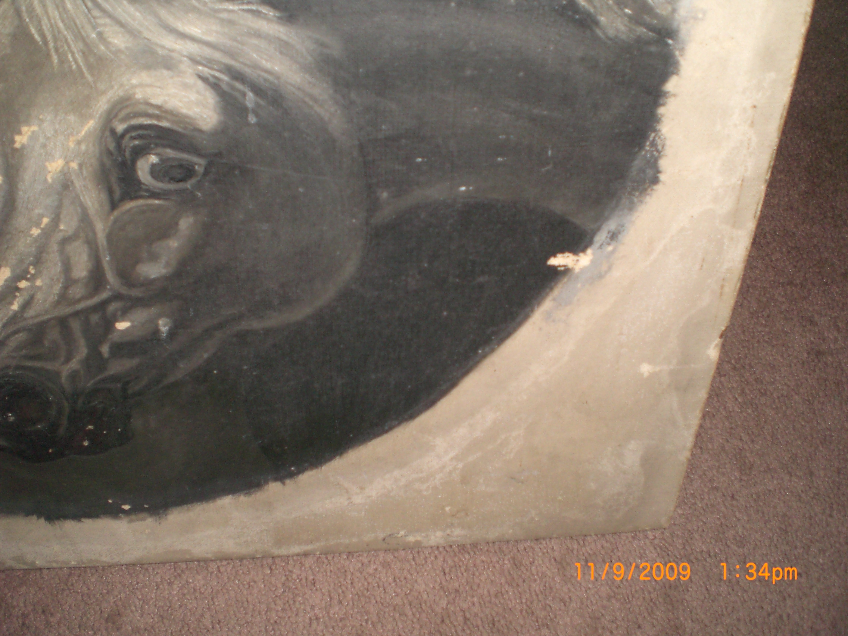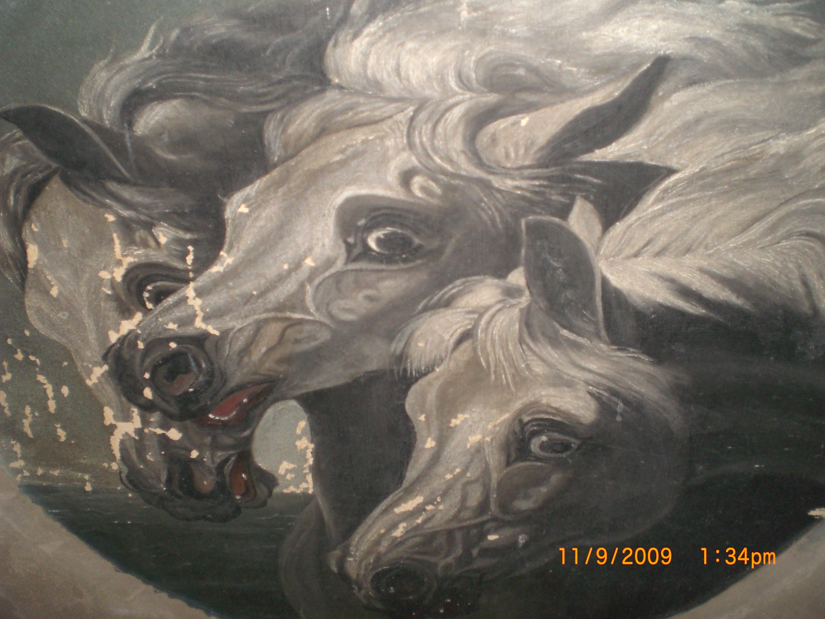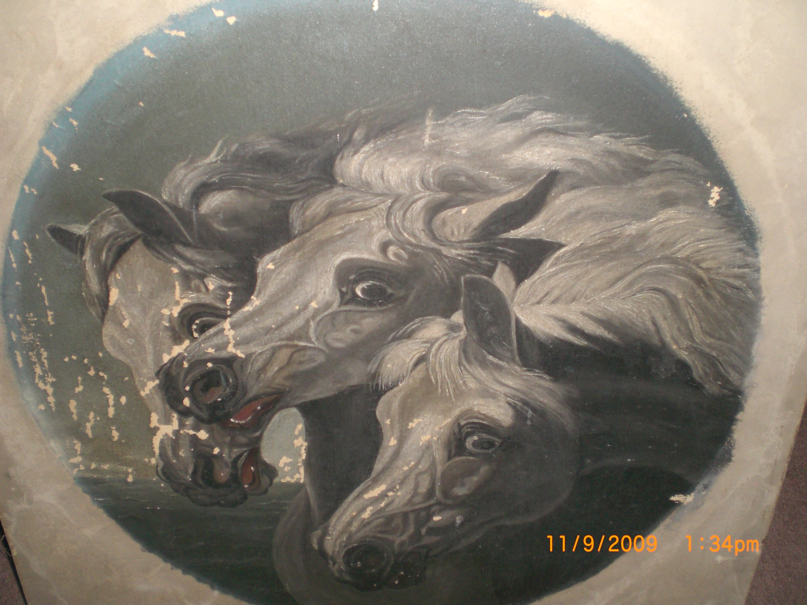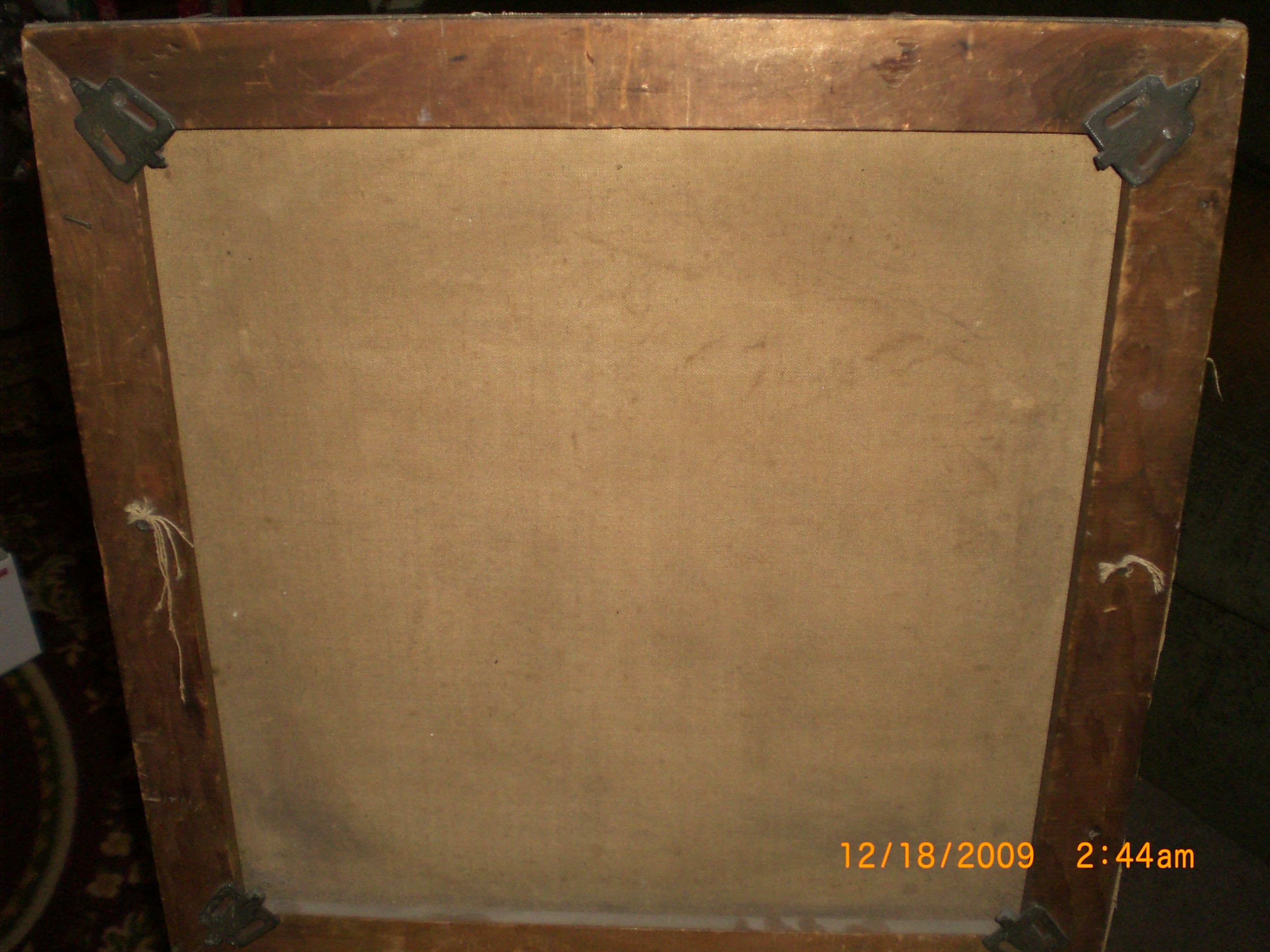 The painting is very old there is a lot of cracking and chipping of the paint, on the lower right corner there is a E or F, the canvas is nailed to the frame, the stretcher brackets have pat.d feb 13, 1883-june16, 1885, ADS. The frame is made out of some very light (in weight) wood the color of the frame is kind of dark maybe from years of wear.