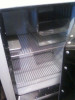 Horizontal handle on left of door. White w light green freezer. Bottom glass shelf has a crack and missing door accessories.