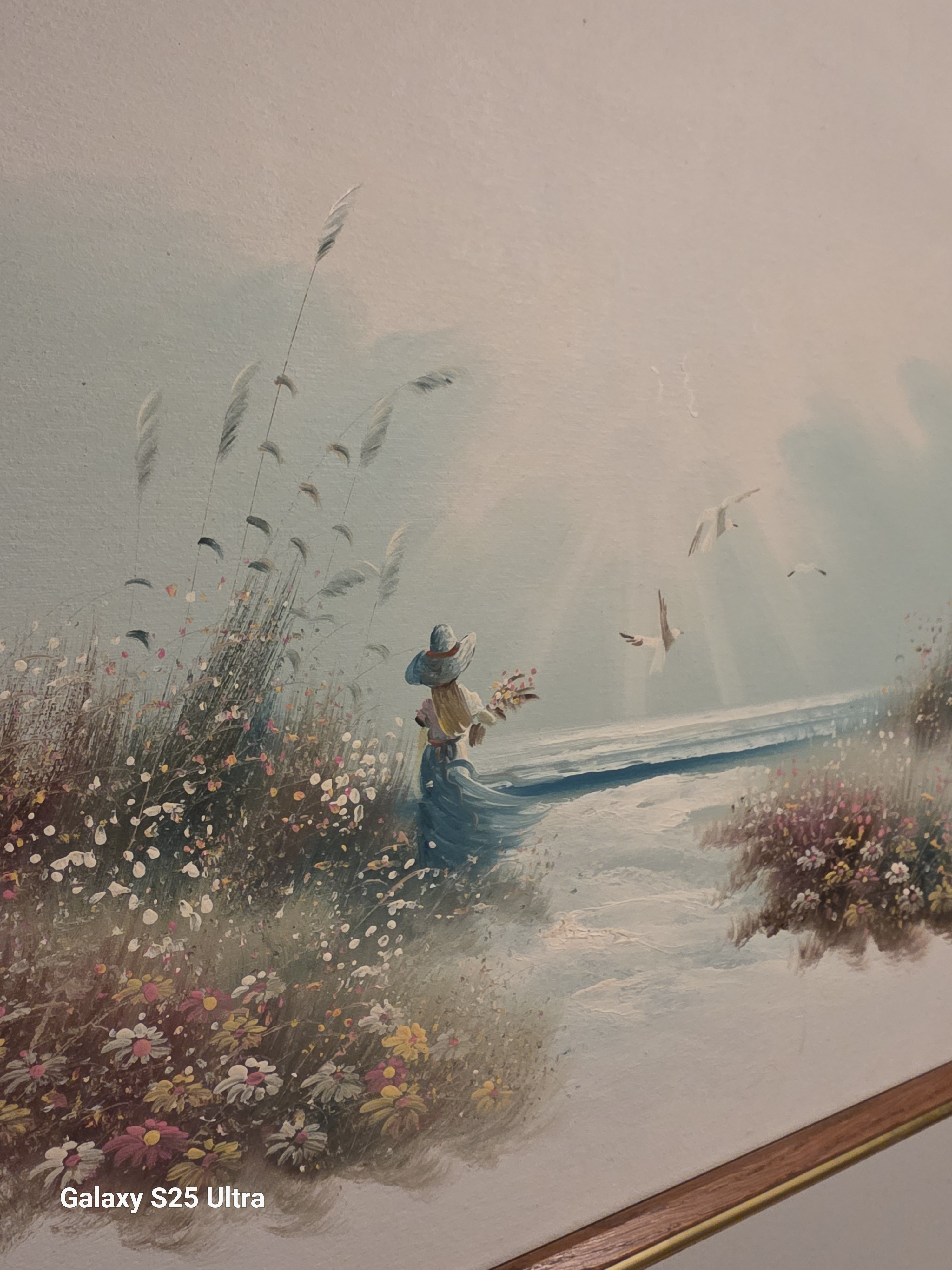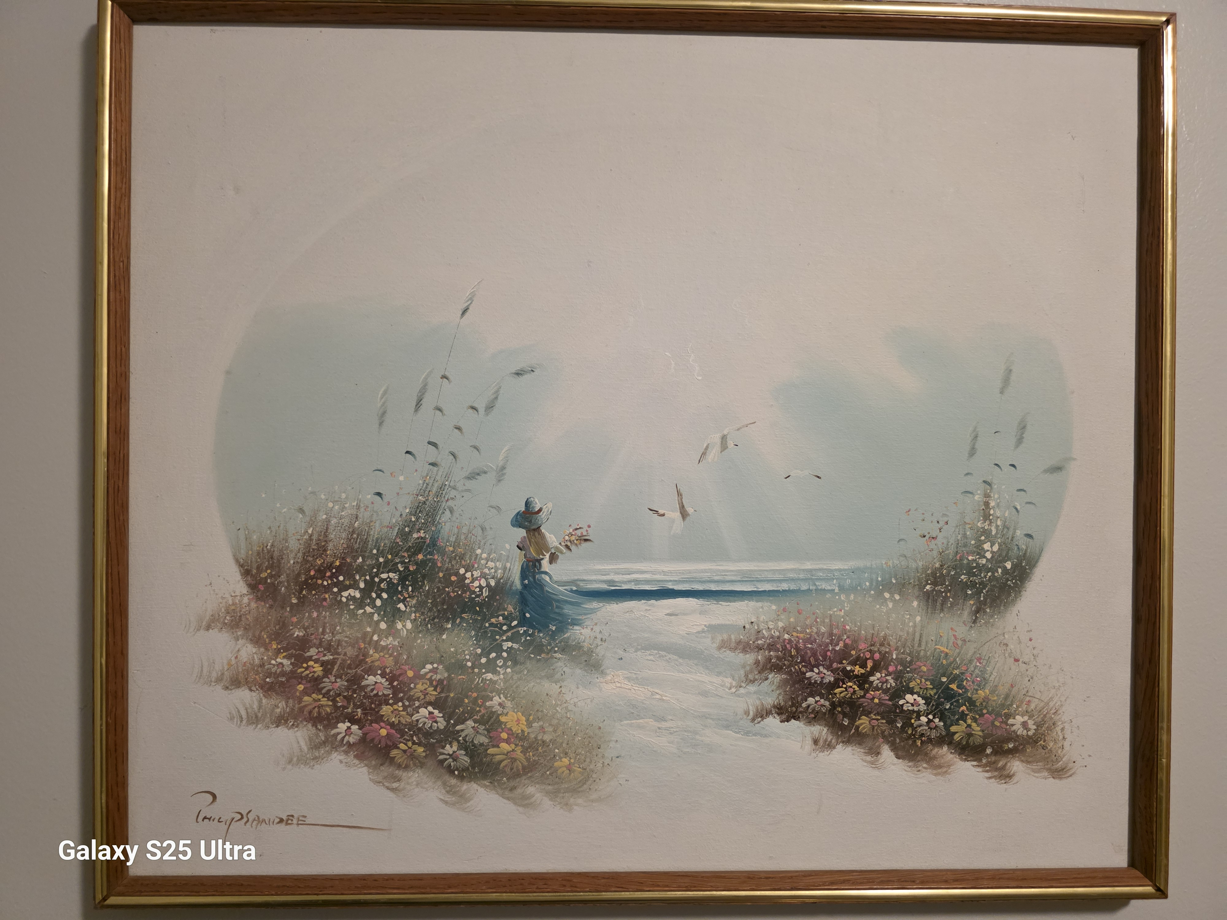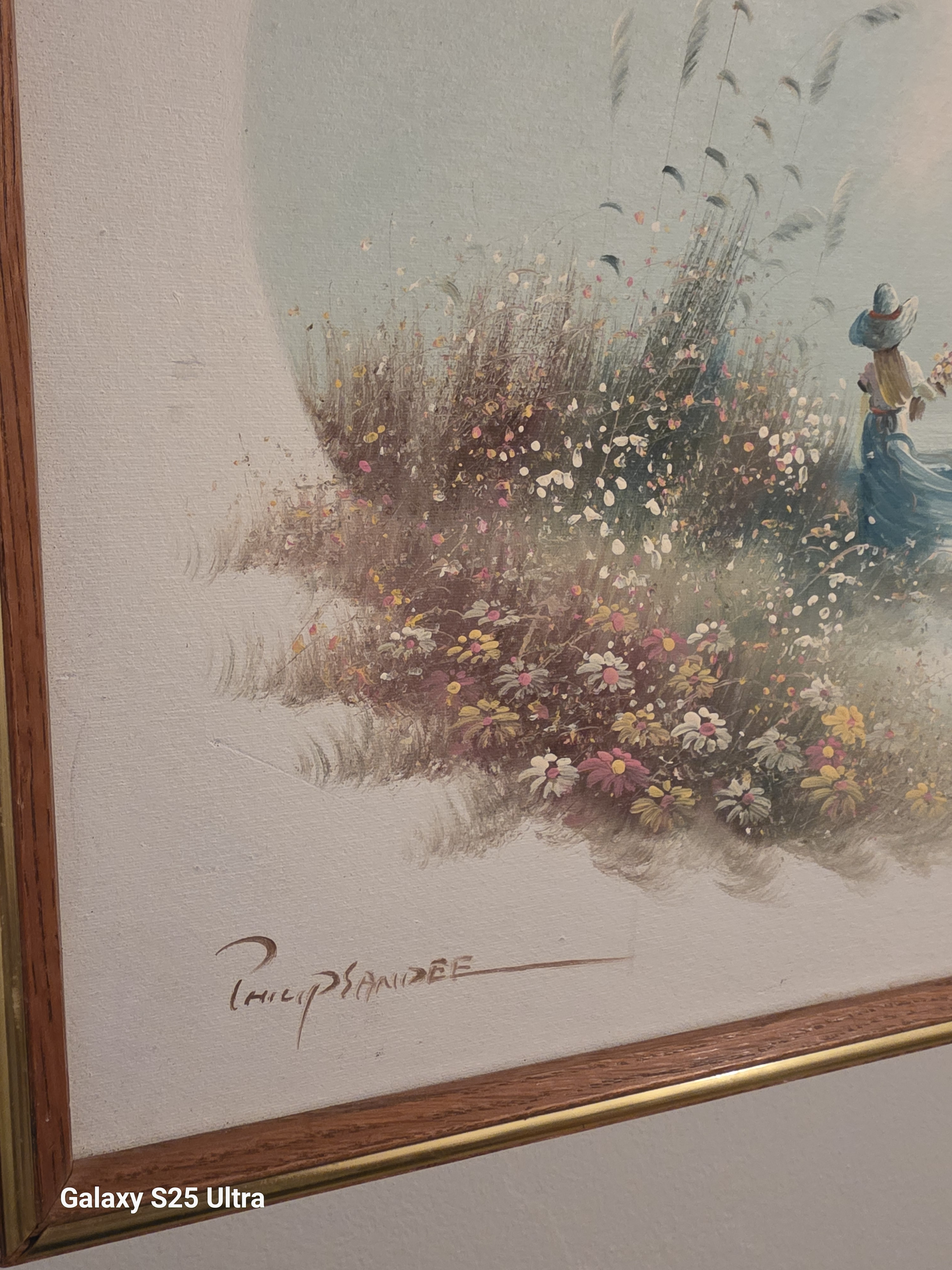 Physical Description: This original oil painting by Philip Sandee features a serene landscape scene. The artwork depicts a woman in a flowing blue dress, holding flowers, standing by a waterway with lush floral surroundings. The painting is framed in a gold-tone frame, enhancing its aesthetic appeal. The signature 'Philip Sandee' is visible in the lower left corner.