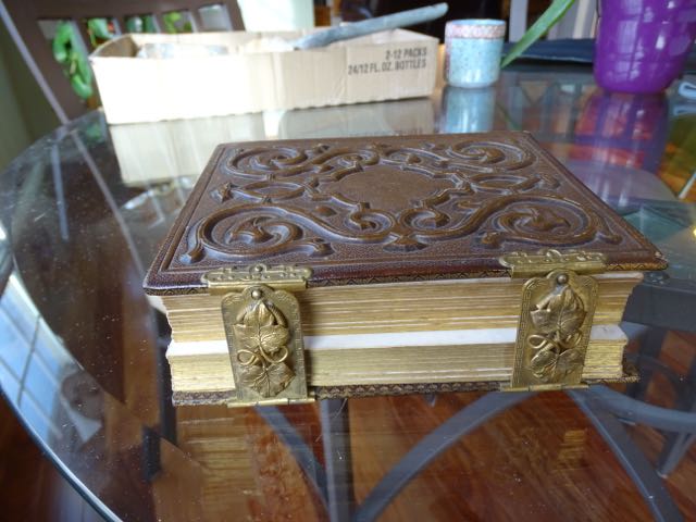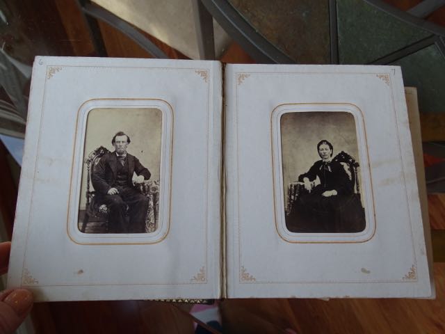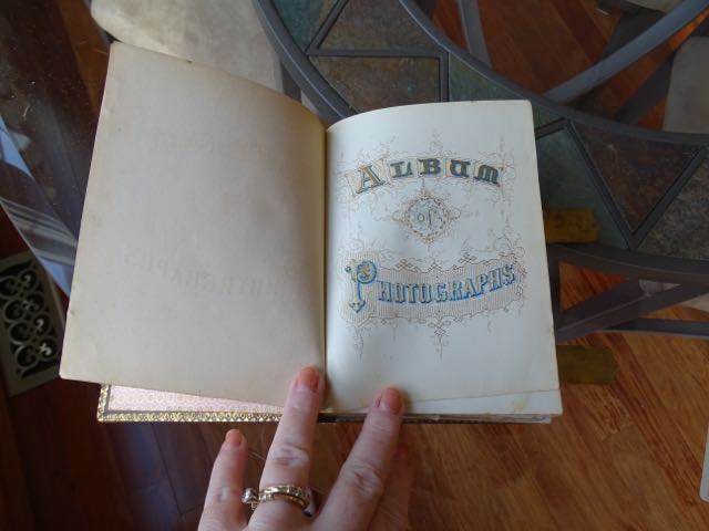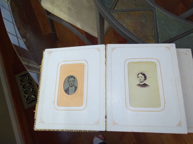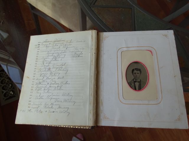 An antique family picture album. Brown appears to be leather with brass closures. There are a total of 51 pictures. The first page is labeled Eugiene Philips Album written in ink. All portraits are labeled. Portraid 22 is labeled as a soldier and a bugler. Picture 23 also appears to be some type of soldier??.
