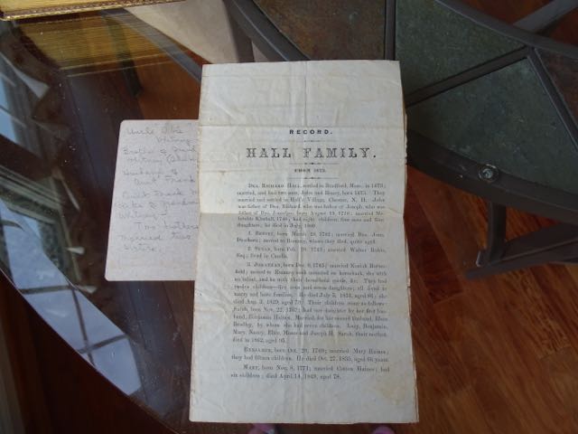 Inside is a printed sheet of a family record of the "Hall Family" from 1673 through 1760.