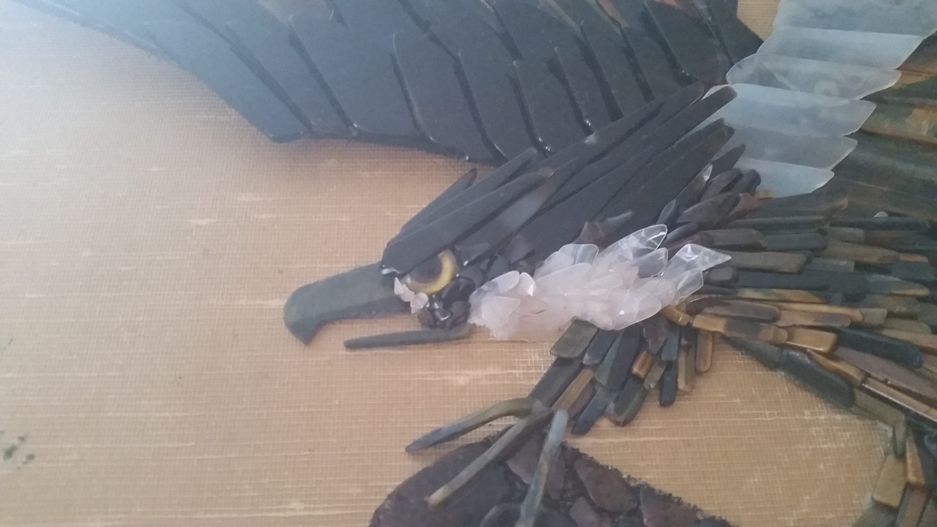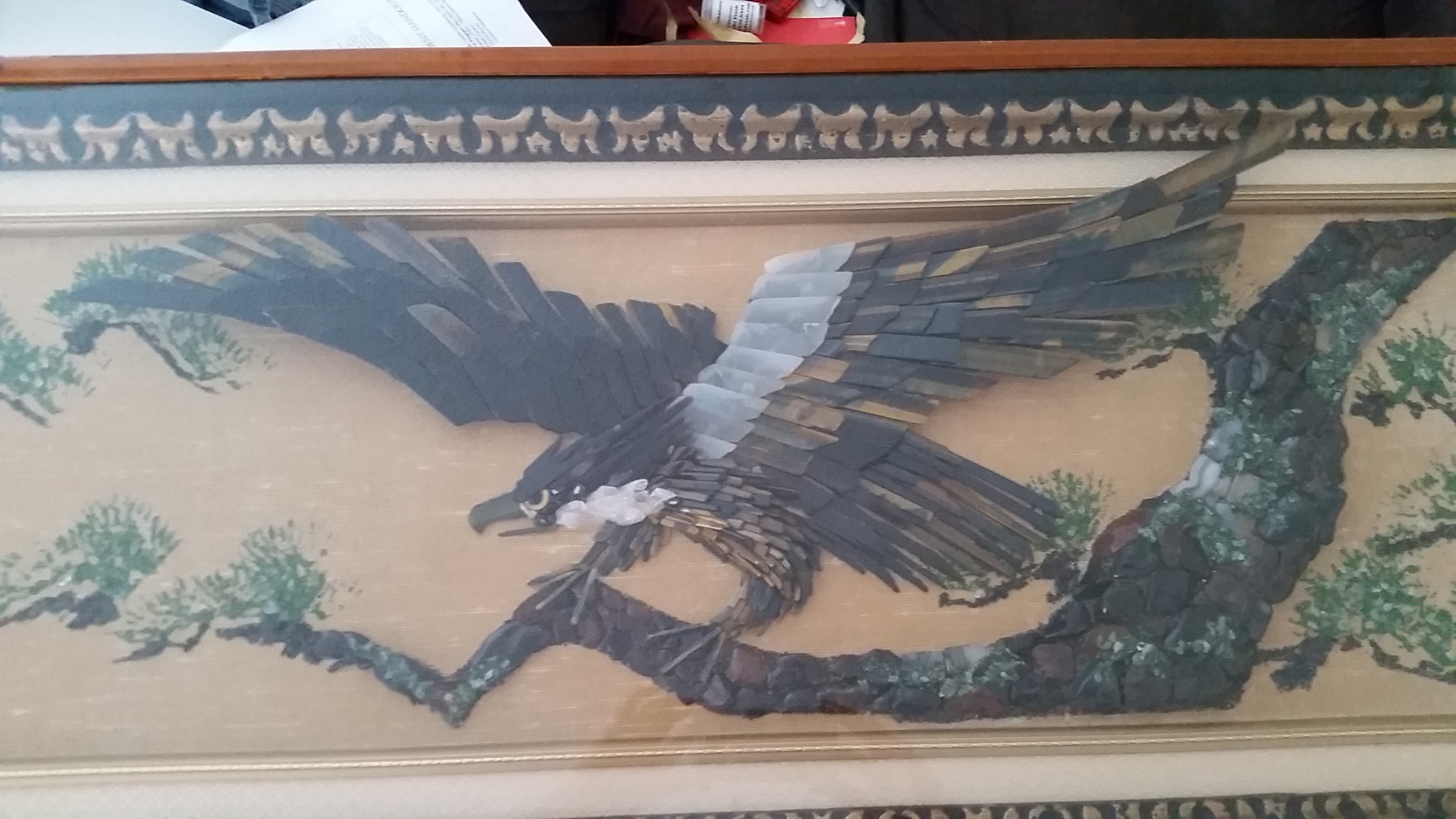 It's about 4ft long 2ft wide picture made of tigers eye stones and other stones. A eagle or hawk I'm not sure. I belive from Japan.