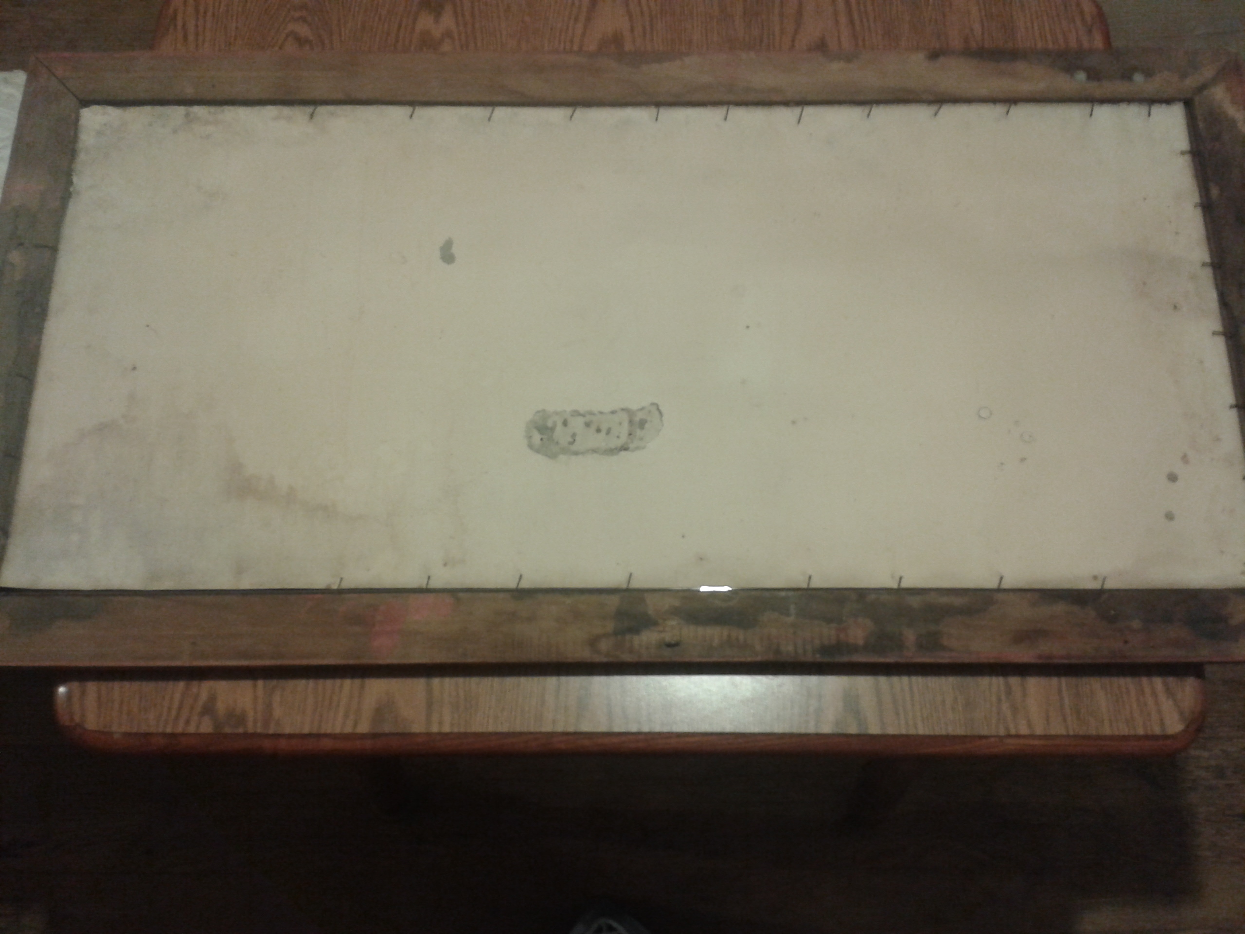 Frame is made out of solid wood with distinct pattern; Picture is on a thick-like paper of some kind and is held in by old thin nails; Glass in frame is fairly aged. The whole picture is heavy to lift.