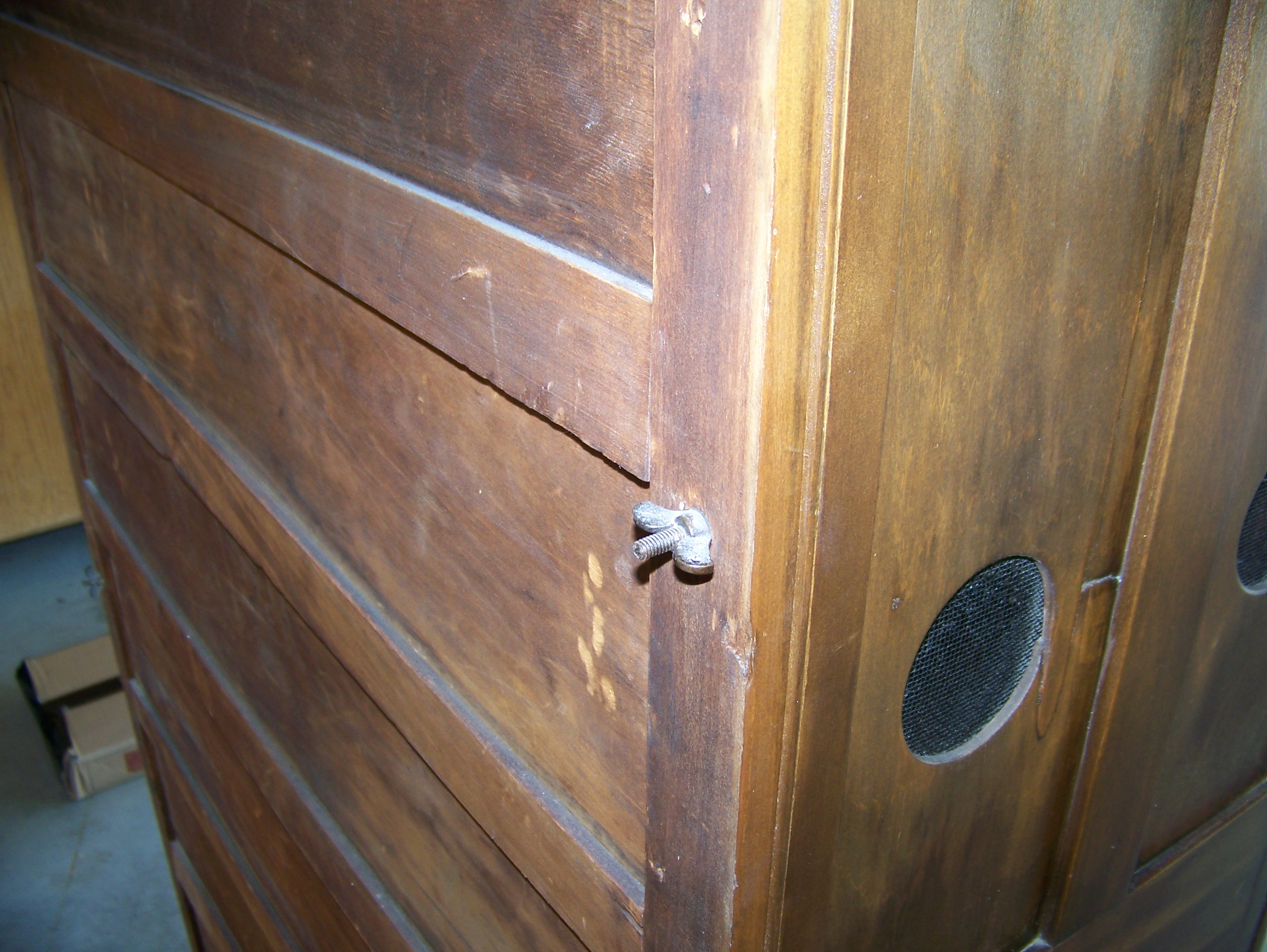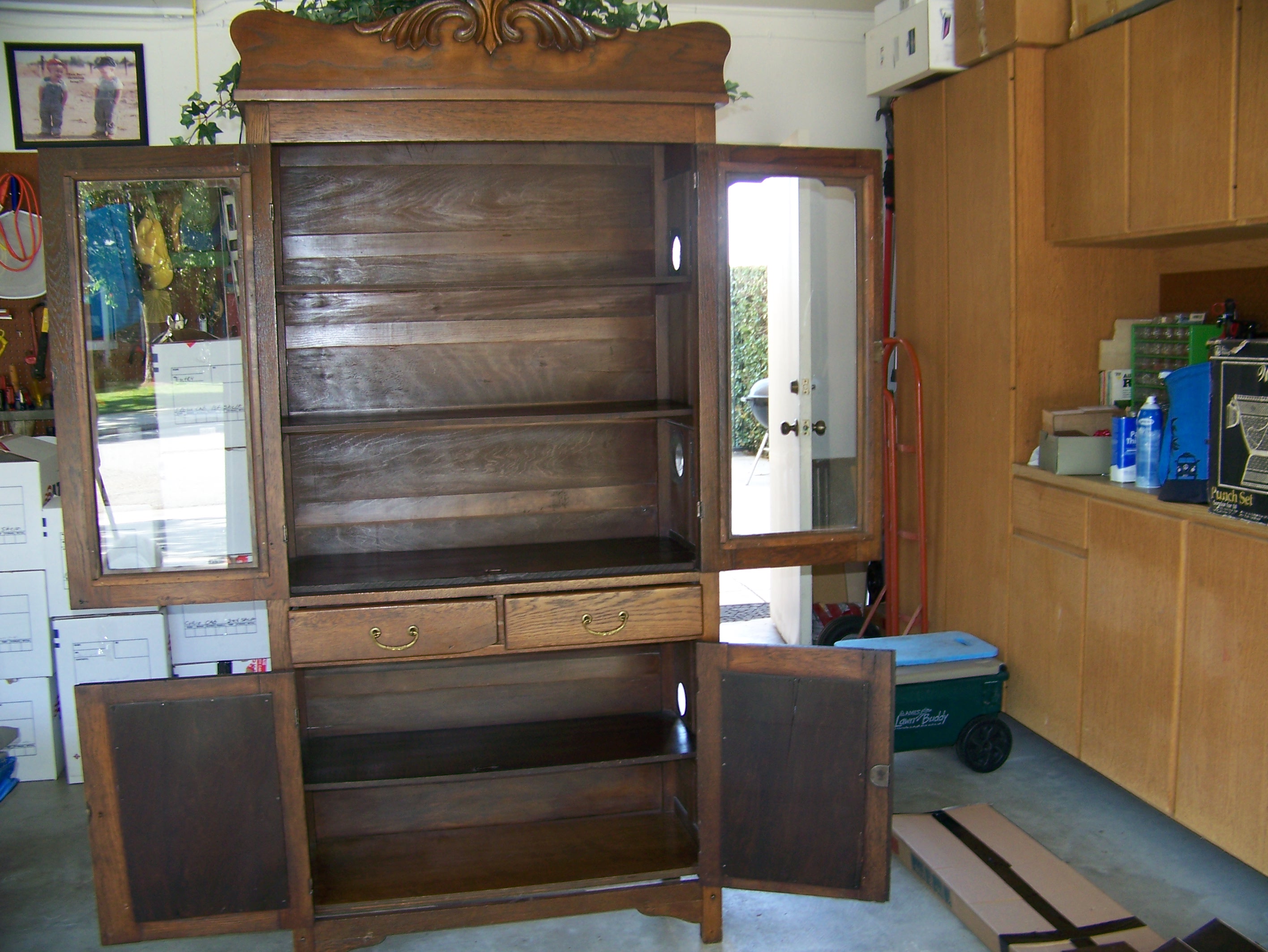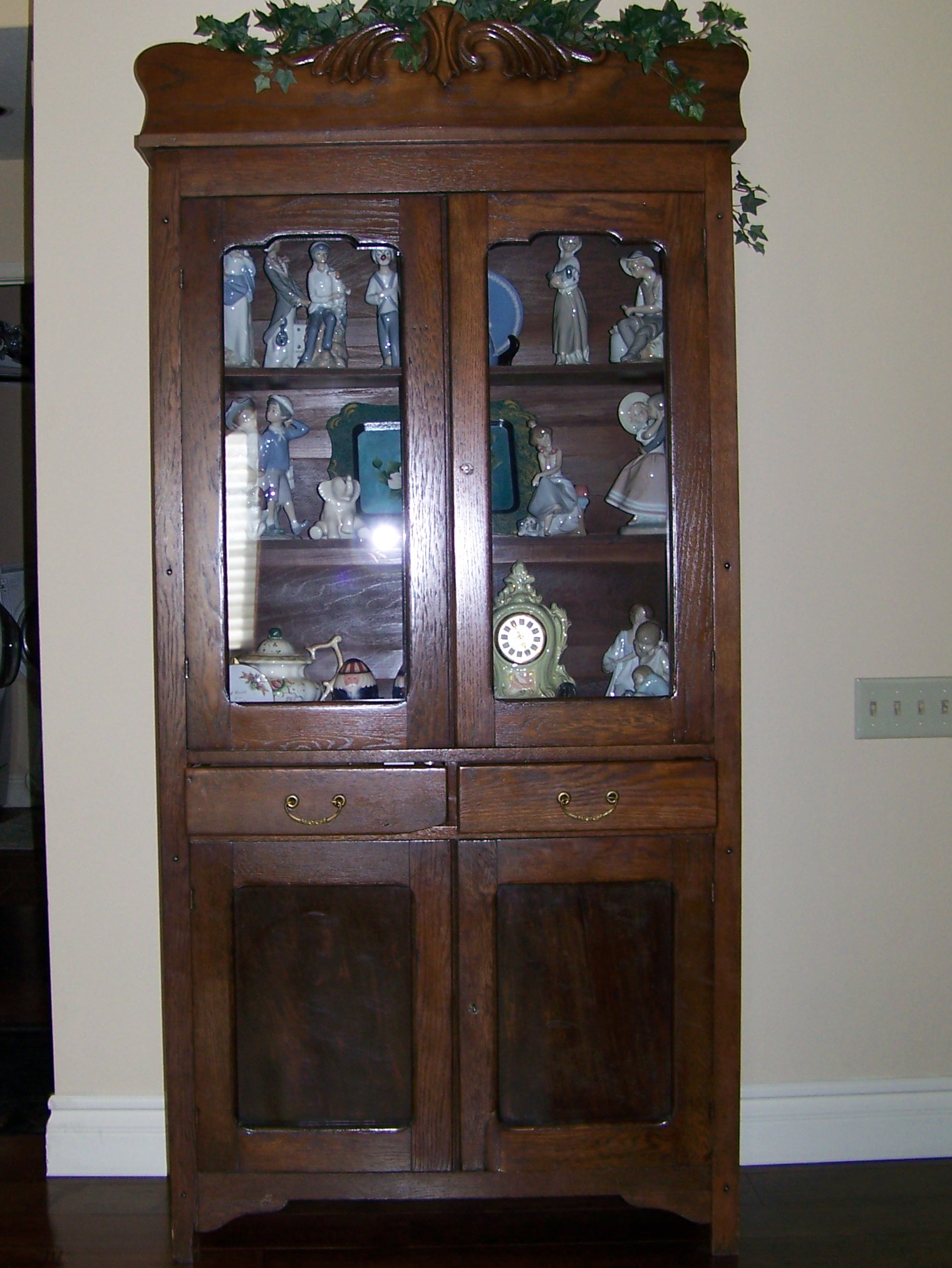 American Oak (front) and Pine side with five shelves and12 vent holes.  There are two drawers and in the center, one on each side. The top, glass doors and the bottem wood doors have a key lock. There is a beautiful carved  decorative piece on the top. In excellent condition for how old the piece is.