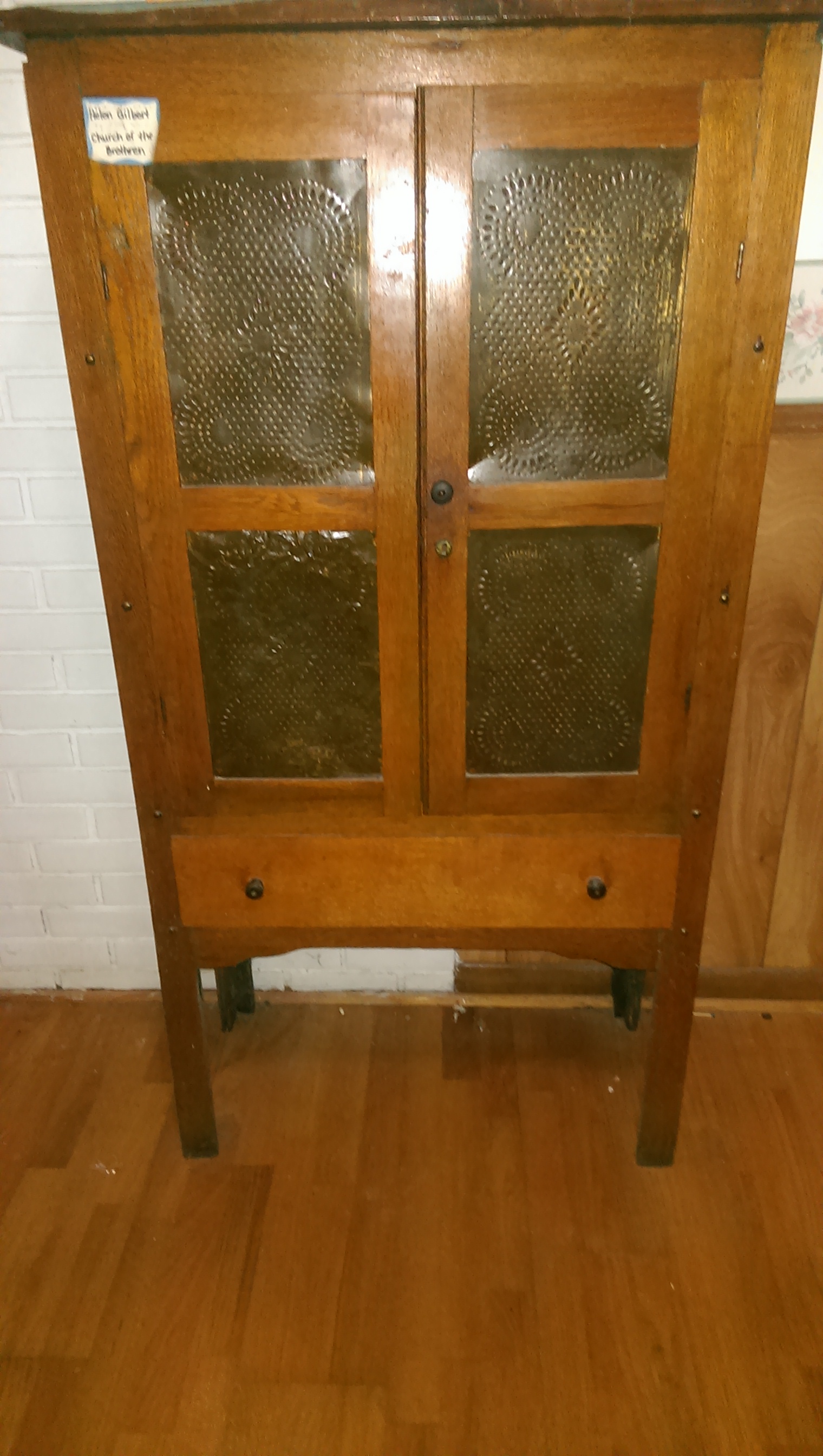 the safe stands about 6' tall and is about 4' wide. it has two doors with hammered tin inserts and 1 drawer at the bottom. it appears to be made of solid oak in a light oak finish. it has long rectanguler legs. it has 3 shelves inside.