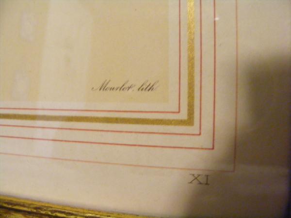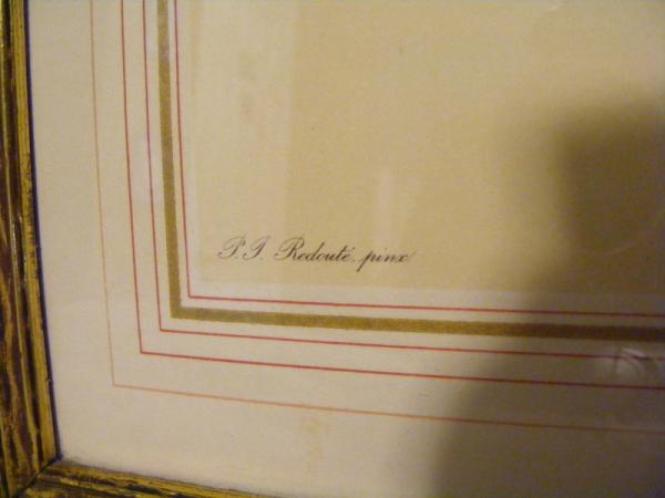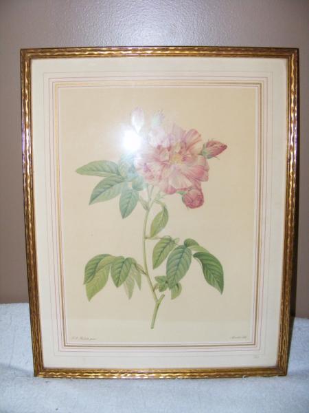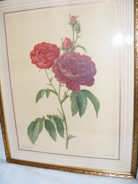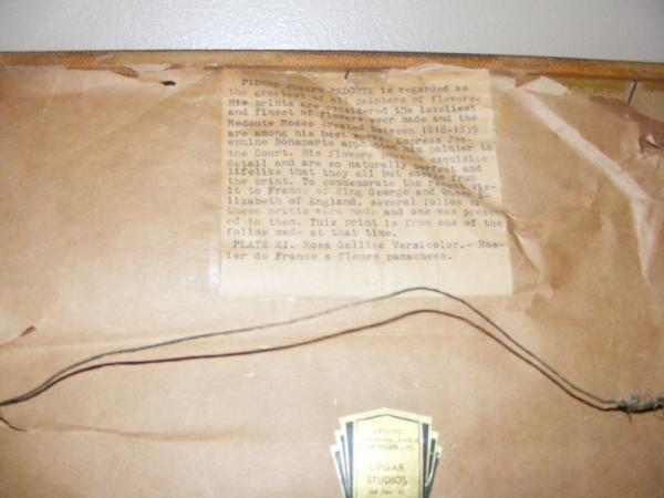 On the back it reads in typed print by the framing studio studio "Pierre Joseph Redoute is regarded as the greatest of all painters of flowers. His prints are considered the loveliest and finest flowers ever made and the Redoute Roses created between 1818-1835 are among his best works. Empress Josephine Bonaparte appointed him painter to the Court. His flowers possess exquisite detail and are naturally perfect and lifelike that they all but emerge from the print. To commemorate the recent visit to France of King George and Queen Elizabeth of England, several folios of these prints were made and one was presented to them. This print is from one of the folios made at that time. Plate 7. Rosa Gallica (purpuro- violacea magna)- Rosier eveque. "