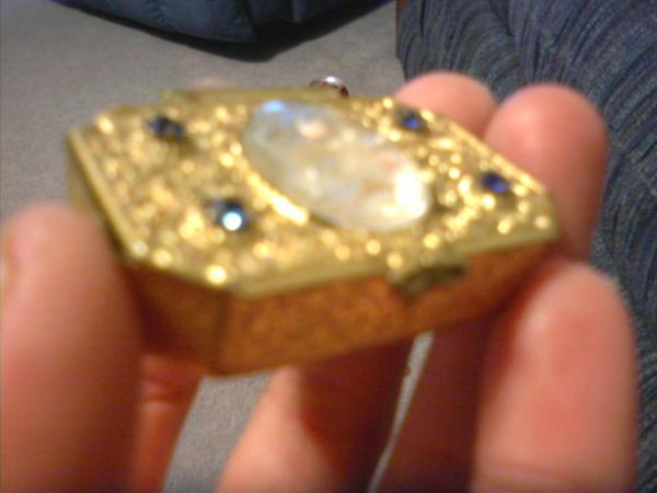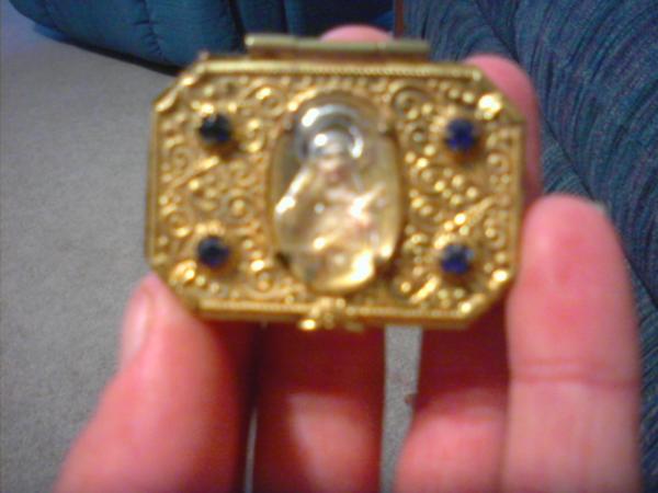 We have had this box for years & have wondered about it. It is made of a copper color metal so I guess either copper or brass. The top of the lid has a glass dome and under the dome looks to be a biblical figure maybe Mary. She has a halo around her head & is holding a cross. On the 4 corners of the lid are blue stones.