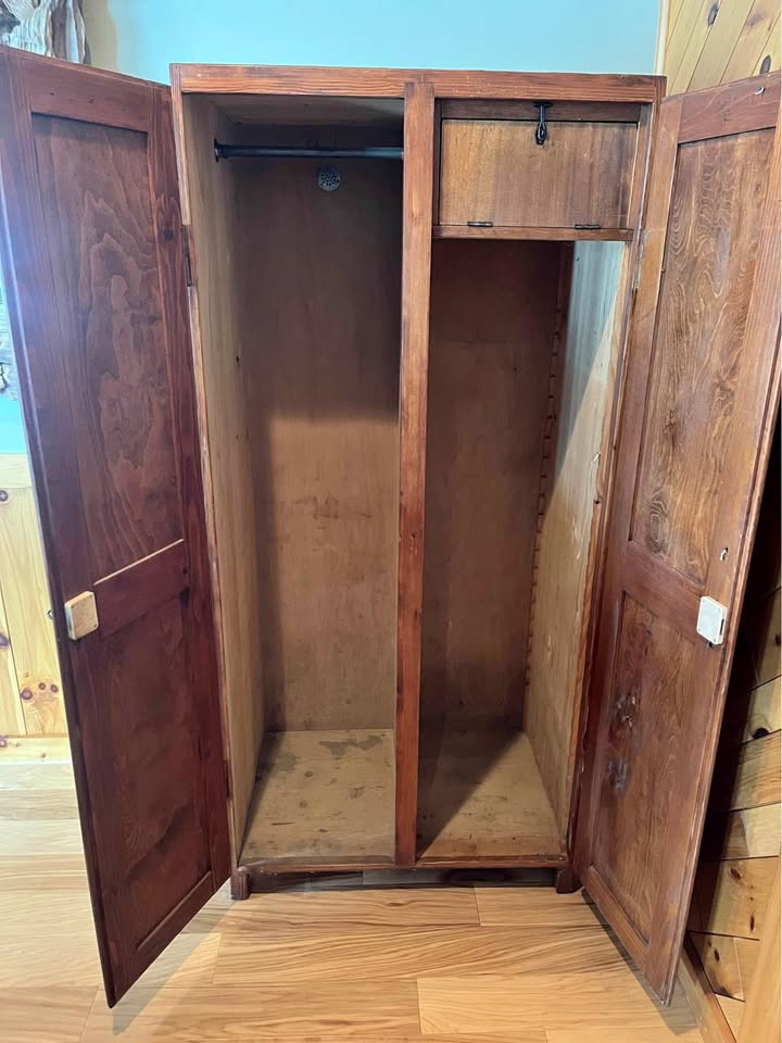 Cabinet has vents in it on the back. It has a mark stamped on it that we cannot identify. The wood appears to be pine. It has lock on the doors, a small area with a door that appears to be for a "hat" maybe. It's in great condition. We just were wondering about the value. We paid $50.