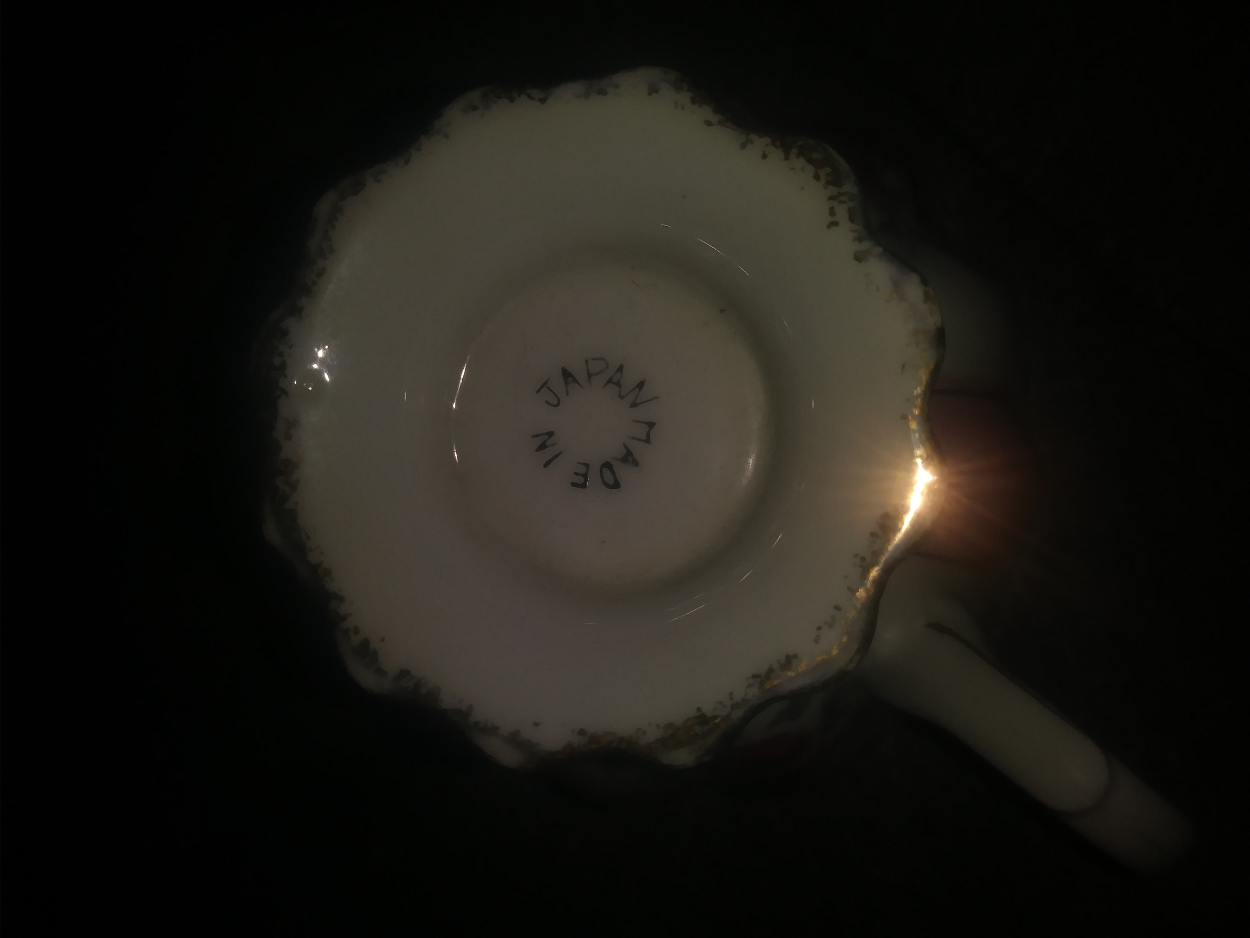 White and pink teacup and saucer with red roses. Made in Japan