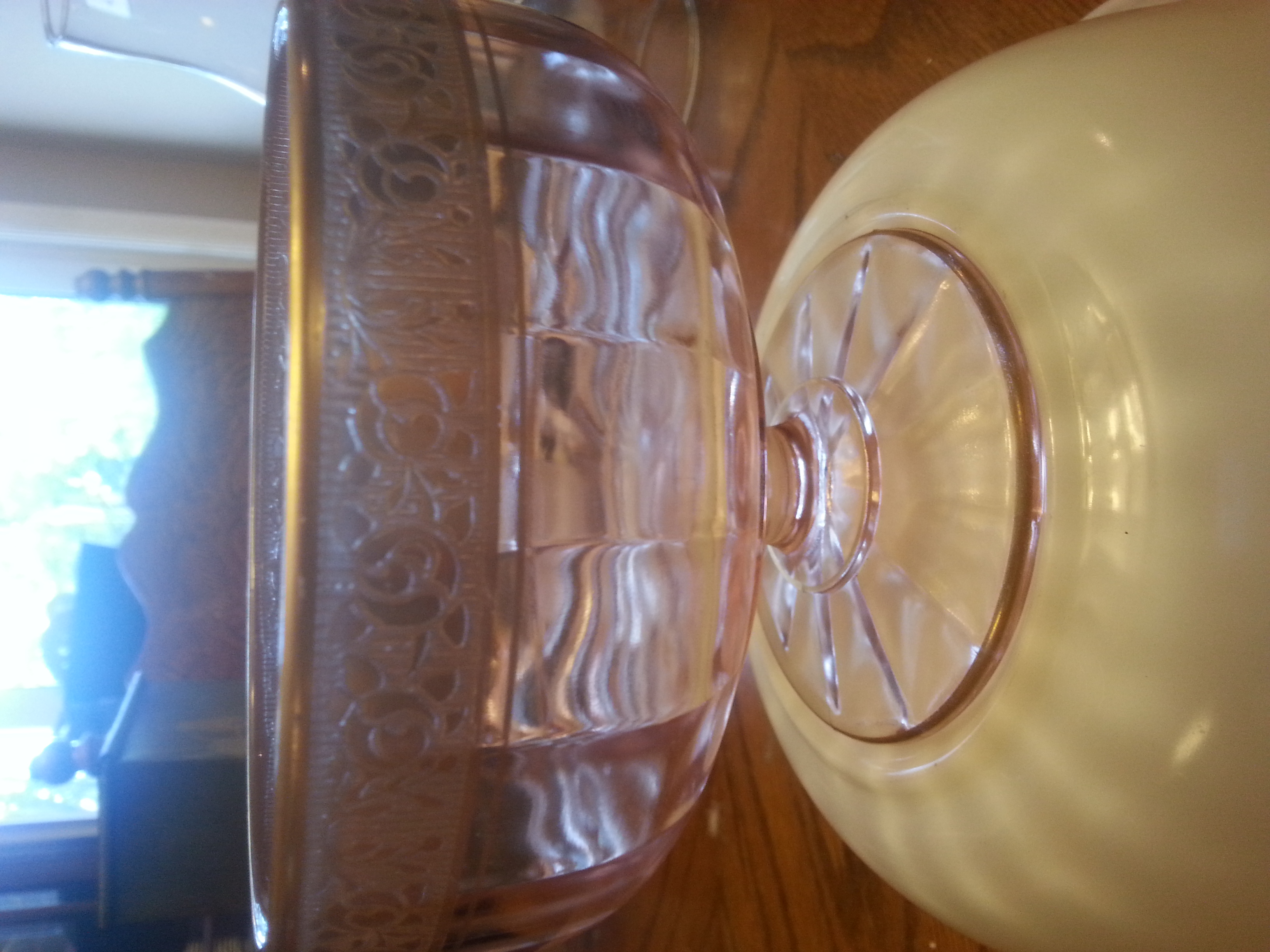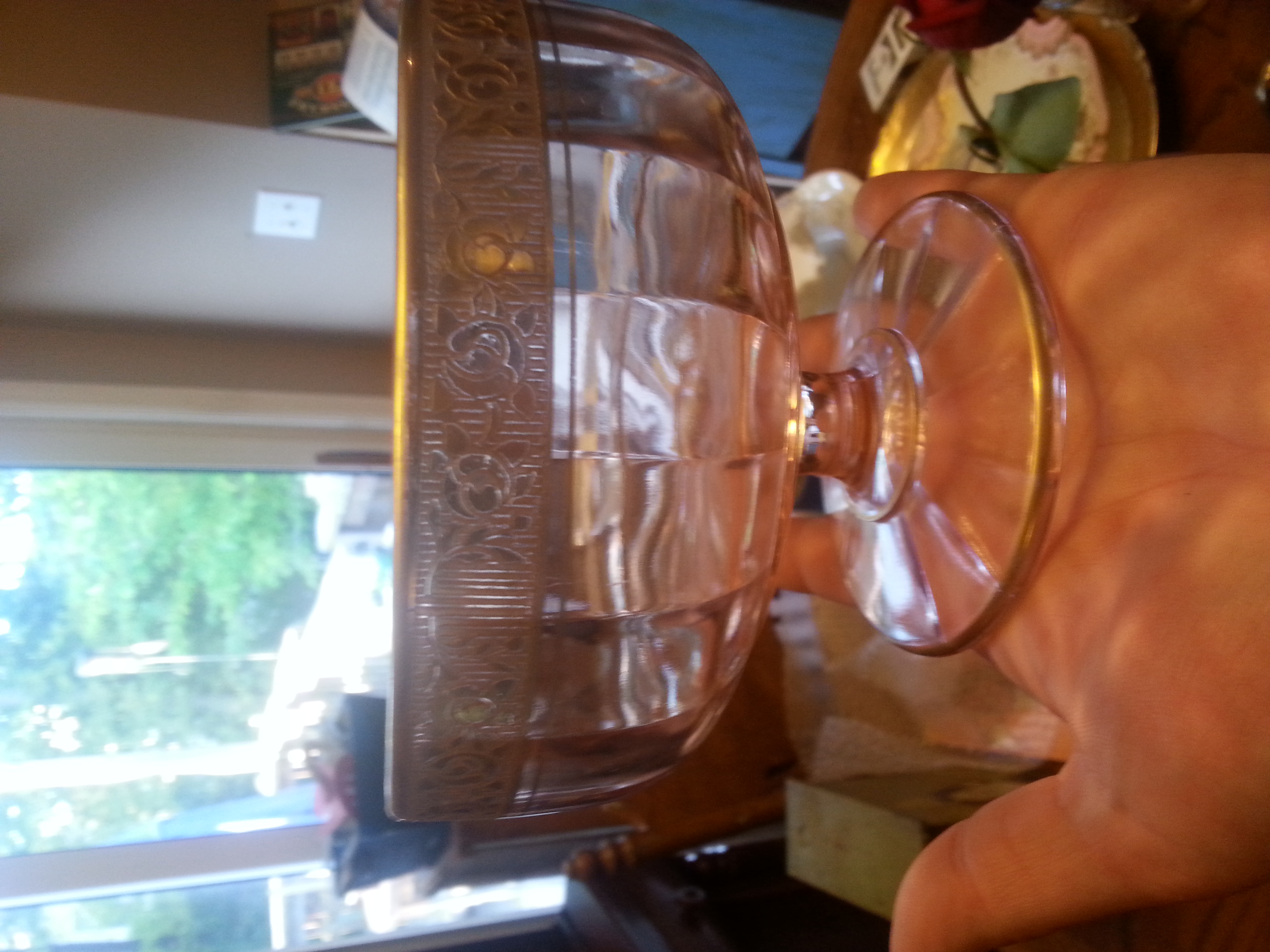 I bought several lots of pink depression glass at an estate sale of a antique store owner. I have several books on depression glass and antique and vintage glass but I can't find this 5" wide from rim to rim 4" tall footed comport with 1" wide gold embossed with flowers and small stripes block optic pattern and the base has a gold trim also but thin and no design the base bottom is 3 1/2" wide. It has all the markings depression glass typically has like "straw marks" but I can't find this piece anywhere. I know there are very rare pieces in this pattern and im hoping this one is also!