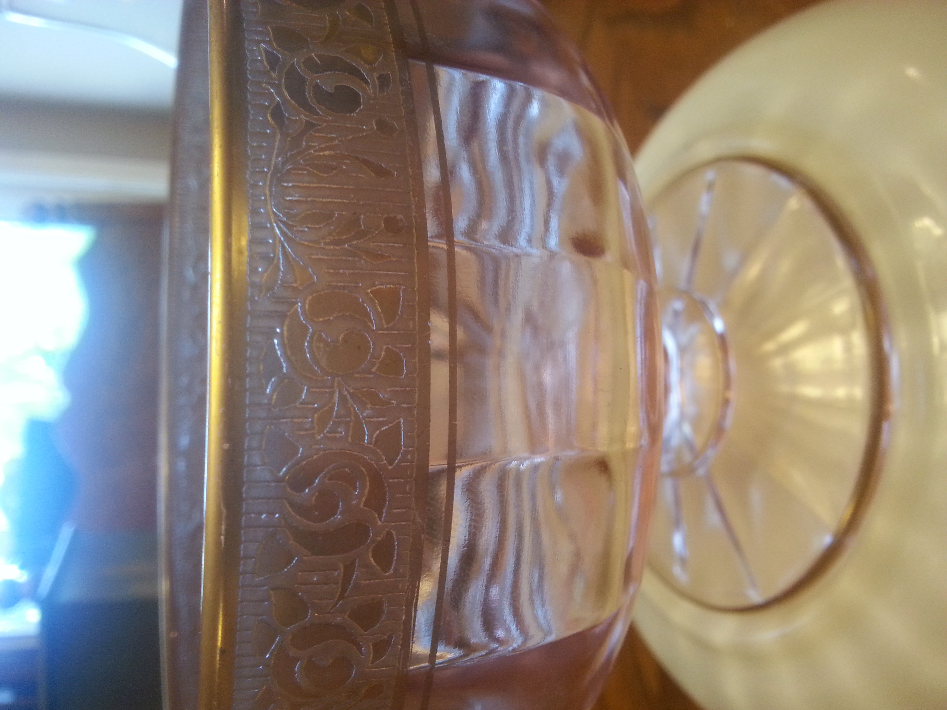 It has a 1" gold trim with flowers and small stripes on the rim and a thin gold plate trim on the base edge it has molding marks,straw marks ,some scratches but the condition is good I think it's a block optic pattern by Hocking Glass Company in pink depression glass