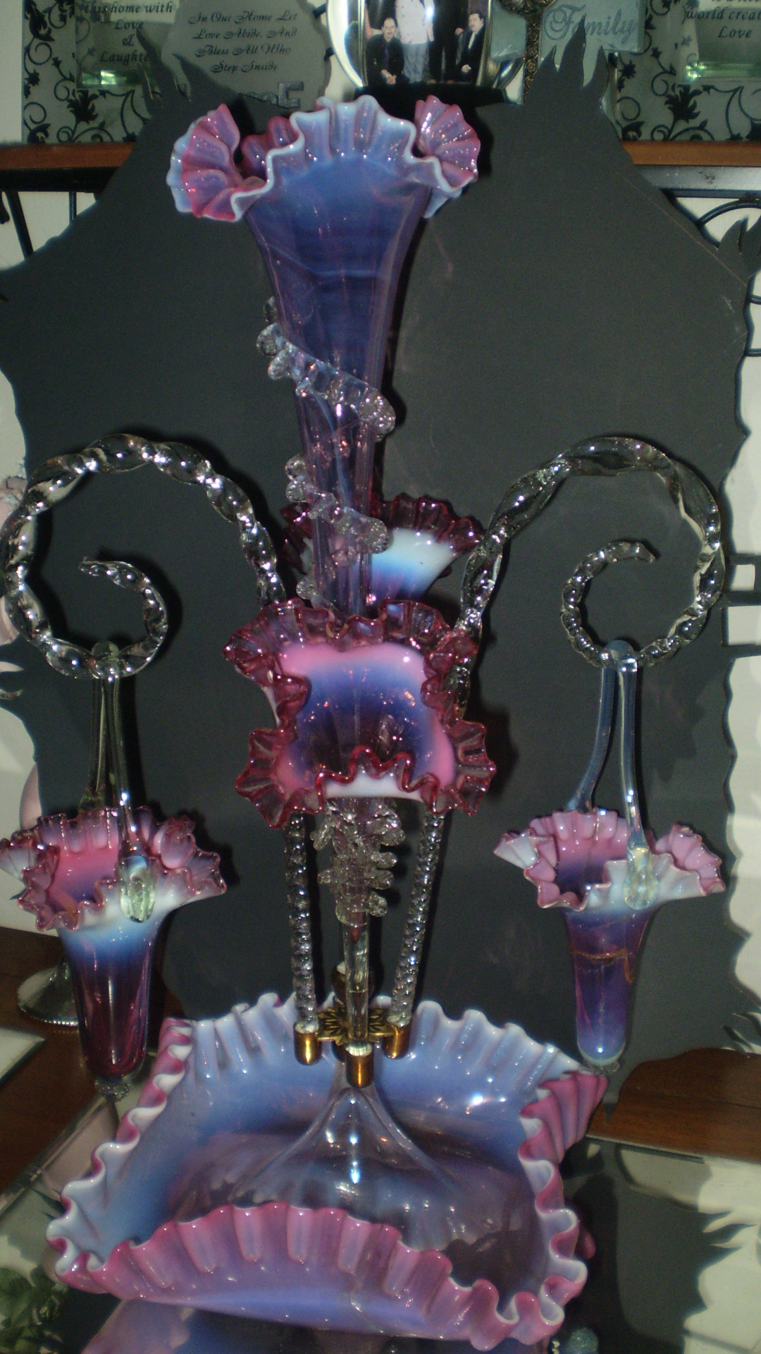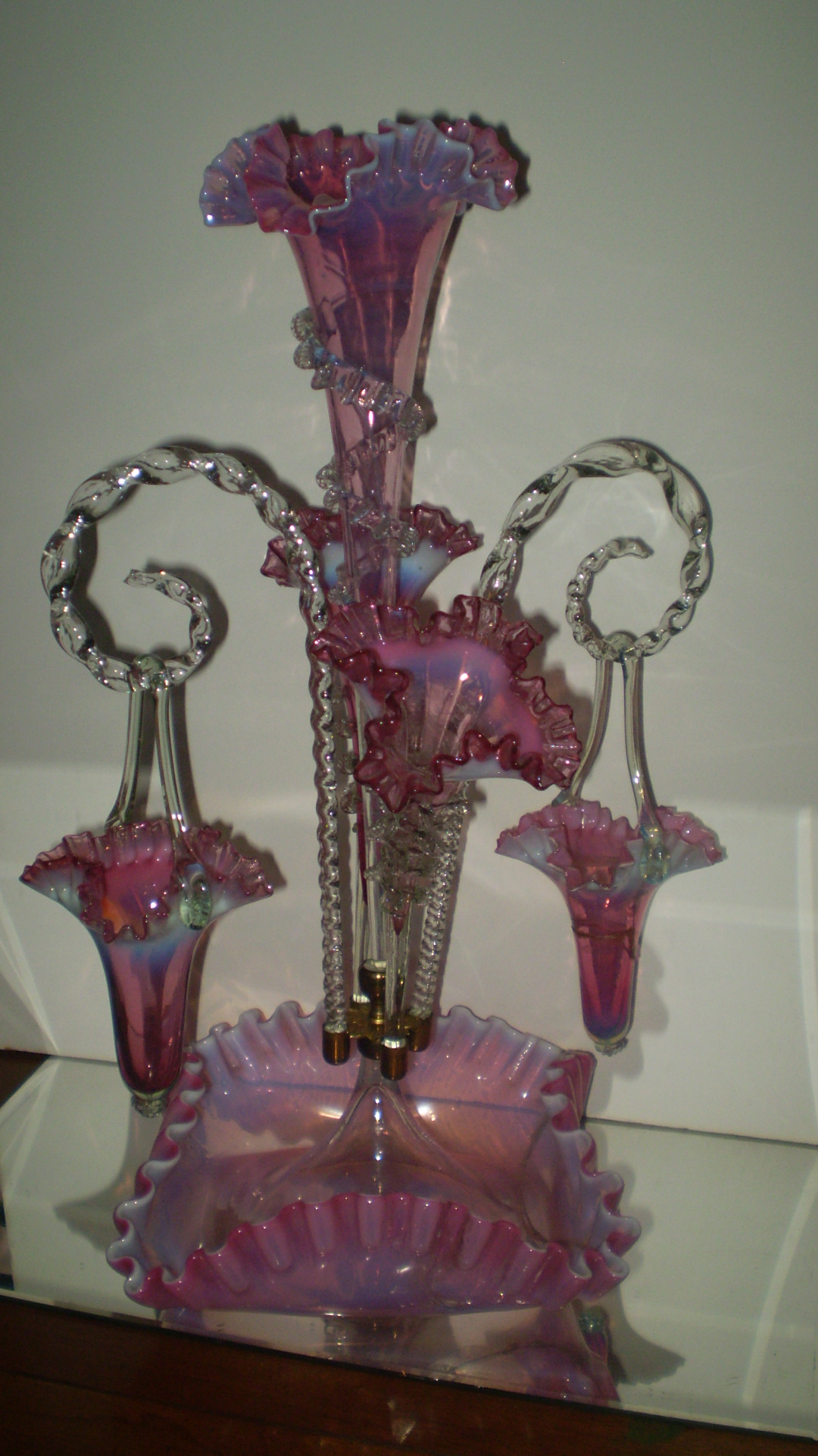 This Epergene has been in my family for 3 generations I don't know anything about it would love to know the history and vaule of this piece of my family history.. I do know that my family has roots in Ireland .. Would appricate any information.. It is 22" wide at the base and 33" tall Pink or crandberry glass hand blown .. from the looks of it .. Comes apart .. all the stems fit into brass hinge.. that holds all the stems.. No markings on the brass or on the glass Thank you for all your help..
