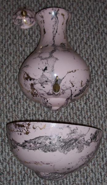 Pink faux marble wall mount lavabo. Good condition. Stickers are Charleton Hand Decorated and hand numbered 1898X.