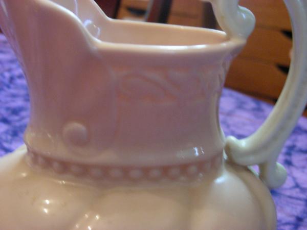 This is a wedding present my parents received in 1959. It is a dusty pink color with a white handle. No chips or cracks.