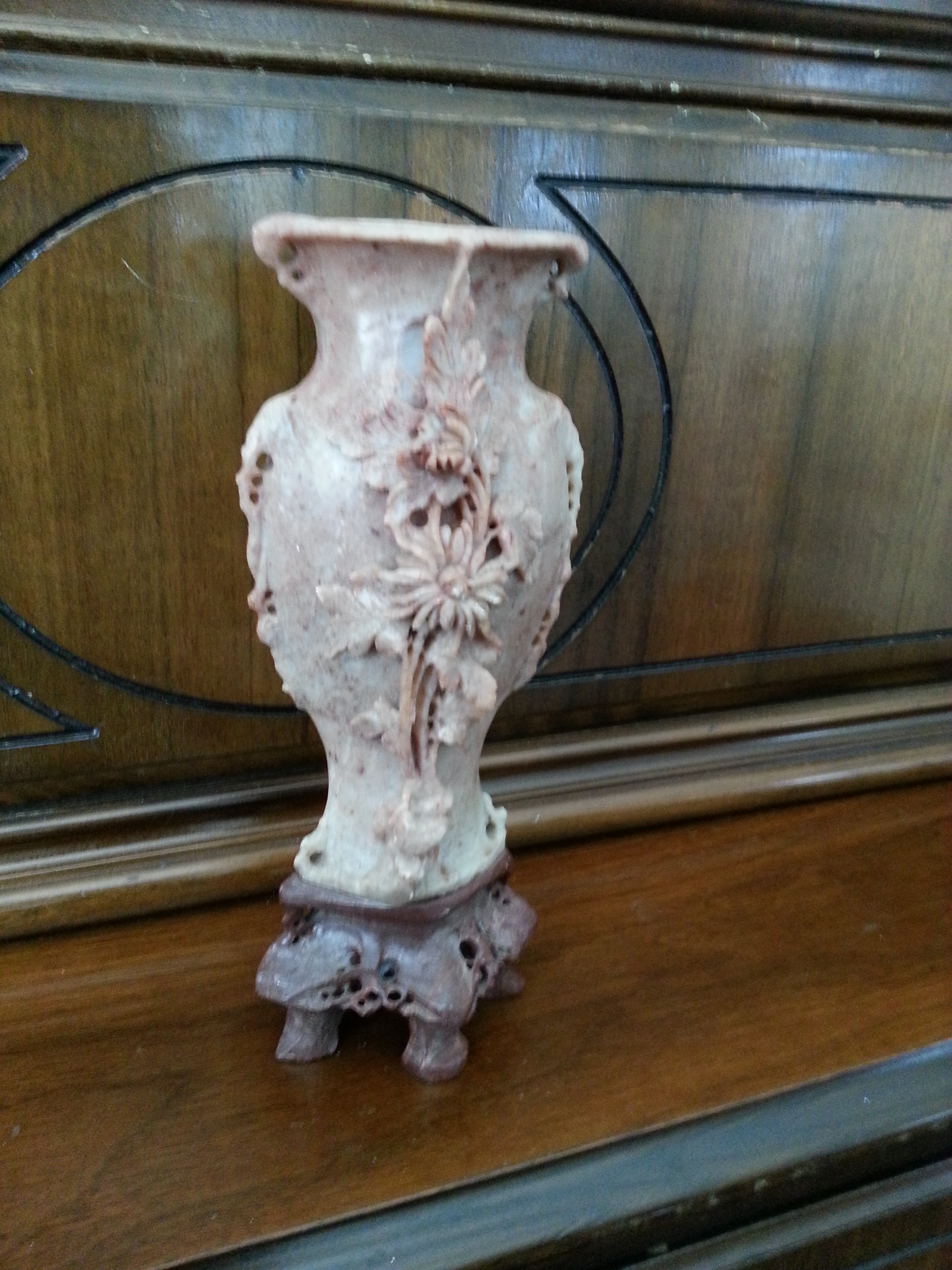 This vase measures 8 inches with the pedestal.  The vase is pink marble, the marble pedestal s darker.  There is carving on the front of the vase and entire pedestal. Picture is light and does not show true pinkish colour.