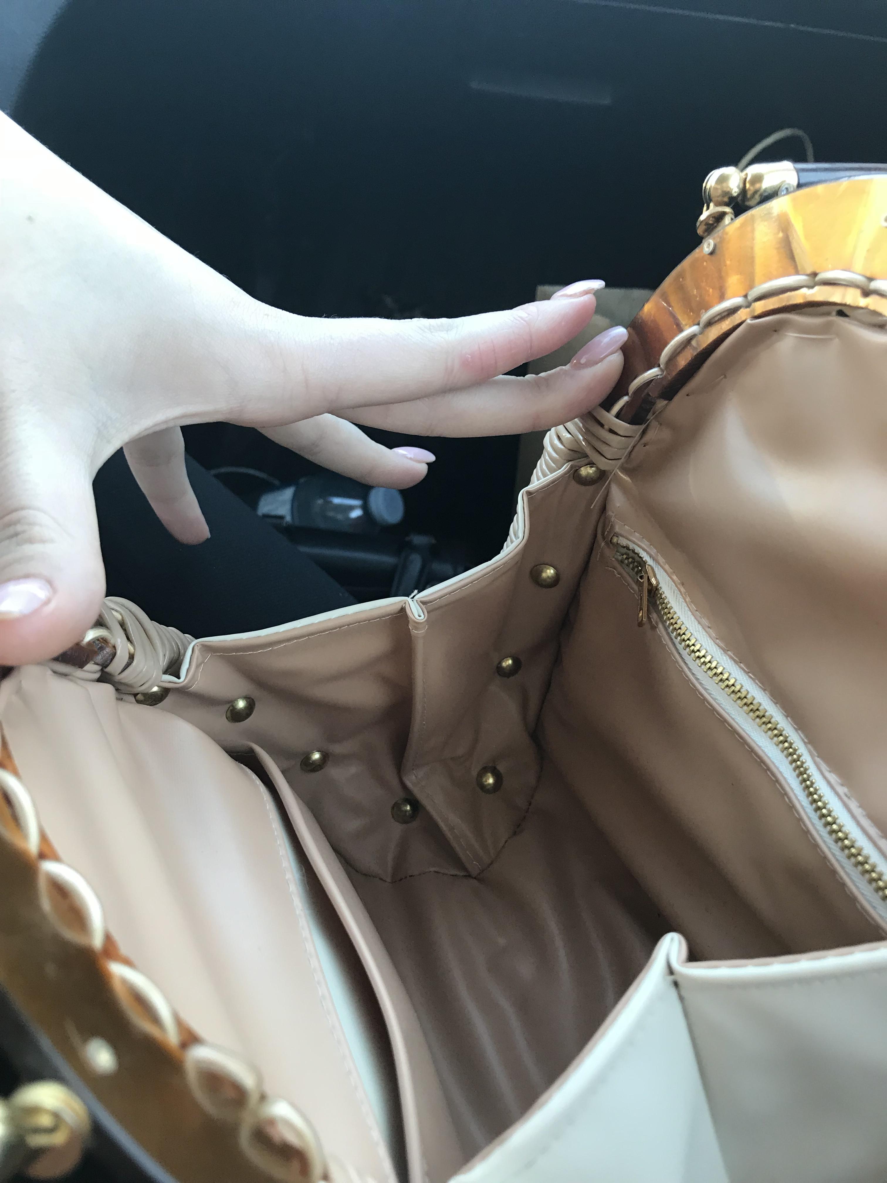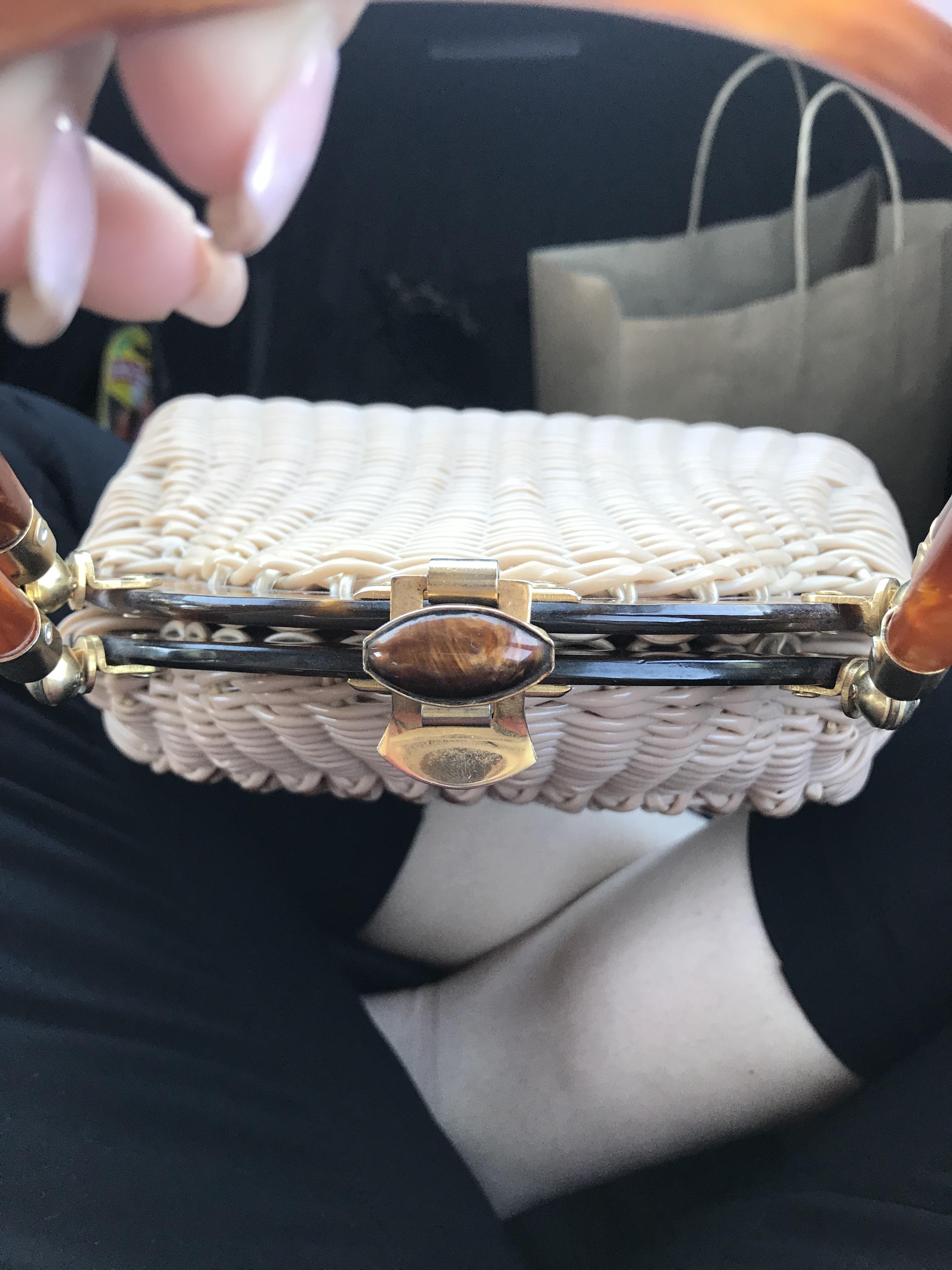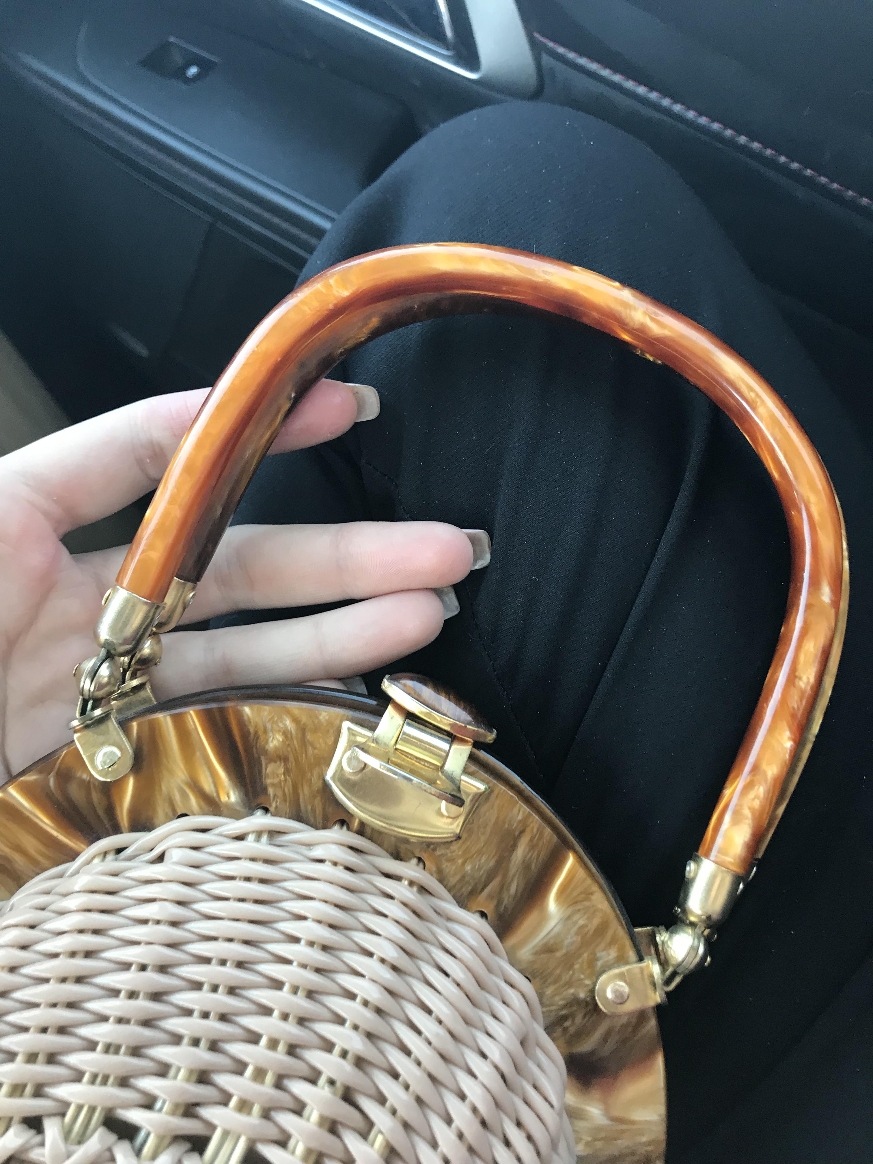 The weaving feels plastic and the ‘wood’ handles and top are smooth and feel almost like they are coated with resin
