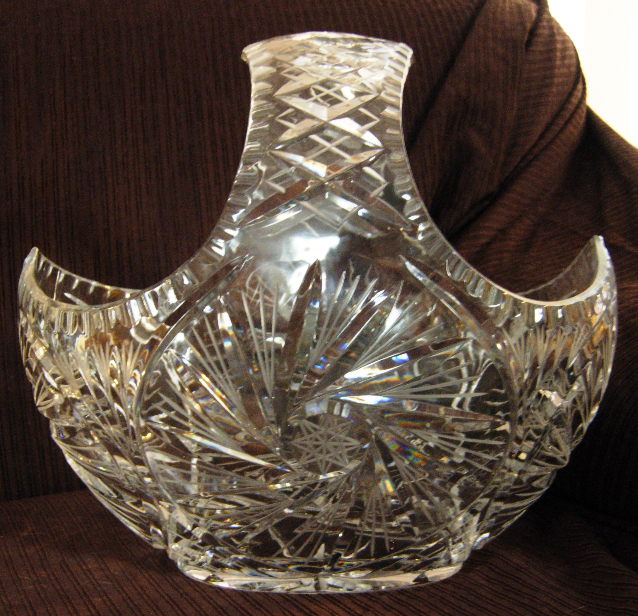 PINWHEEL CRYSTAL LARGE BASKET & BUTTER DISH & PICKLE DISH & VASE.