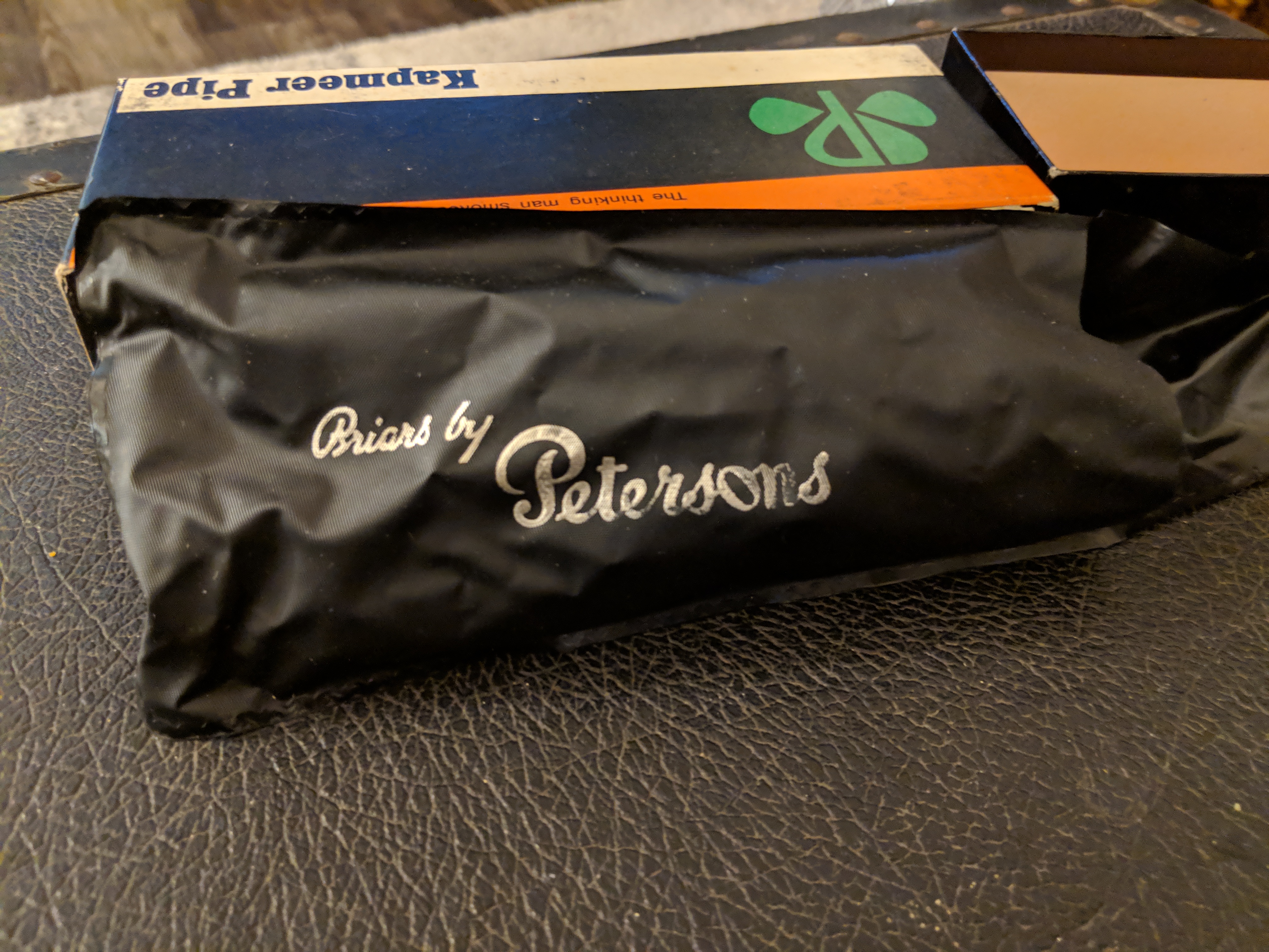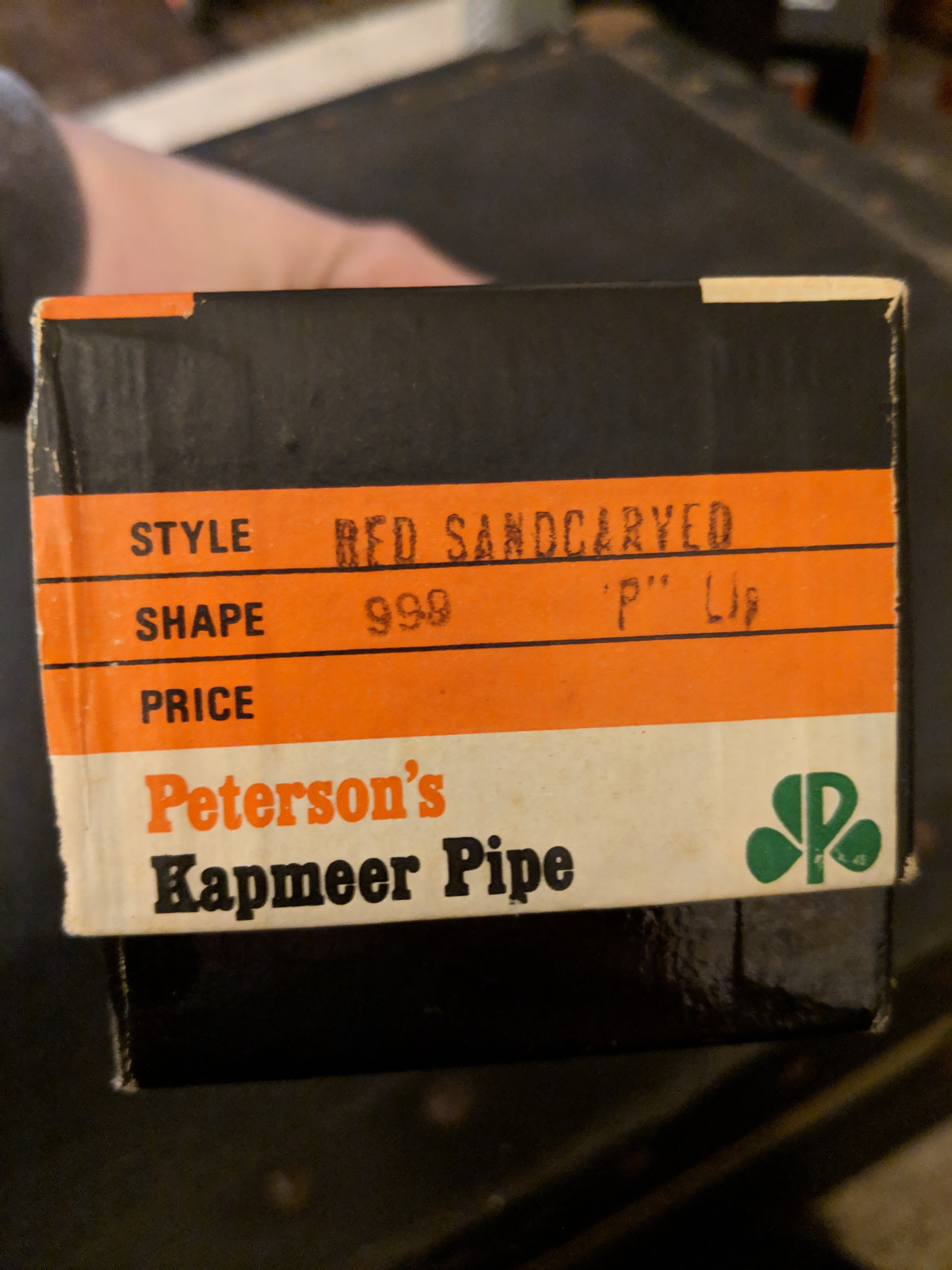 Peterson's pipe from Kapmeer with box and sleeve. 999 p"lip red sandcarved