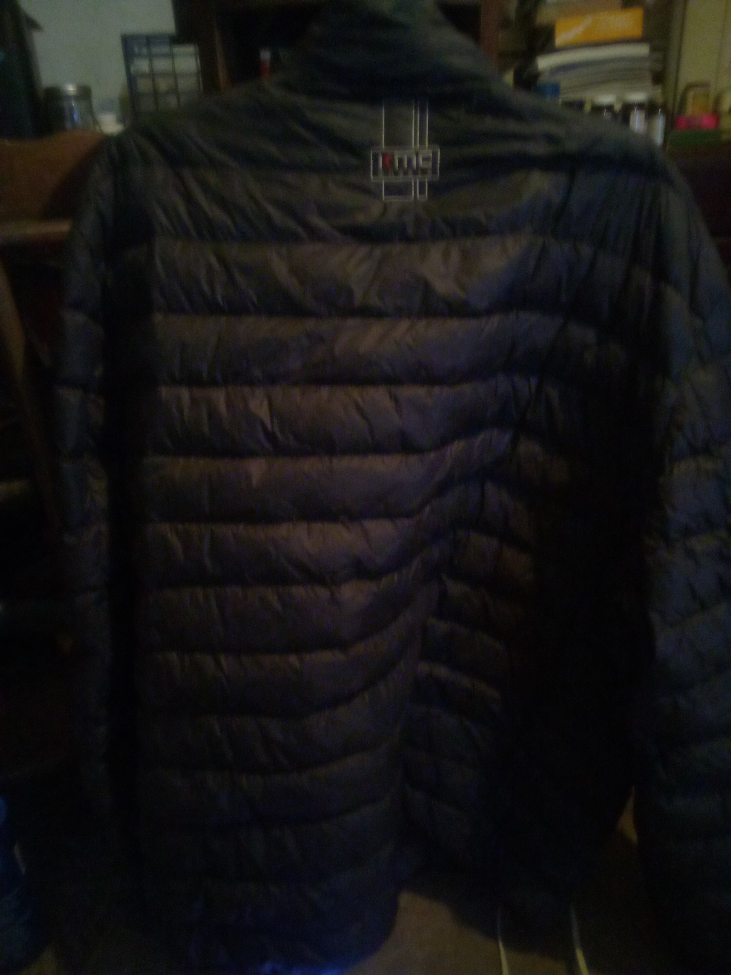 I've got a Large Down Feather Jacket. Brand unknown because the KMC Wheels People just got their KMC logo right on top of the Maker to the Jacket. Hoodless,2 KMC Wheels logos stitched to the jacket for advertising reasons. One inside pocket on the Left side,if your looking directly at the Jacket. The other two pockets are sealed up with Zippers.
