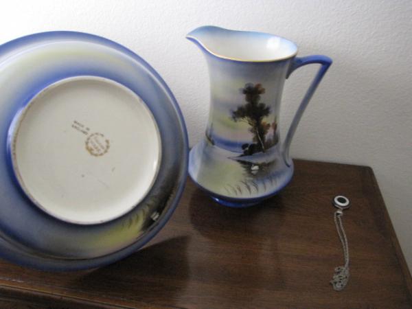 The pitcher and bowl are a light color with highlights of blues. Although it is large, the pitcher has a delicate shape. The pictures are the best description.