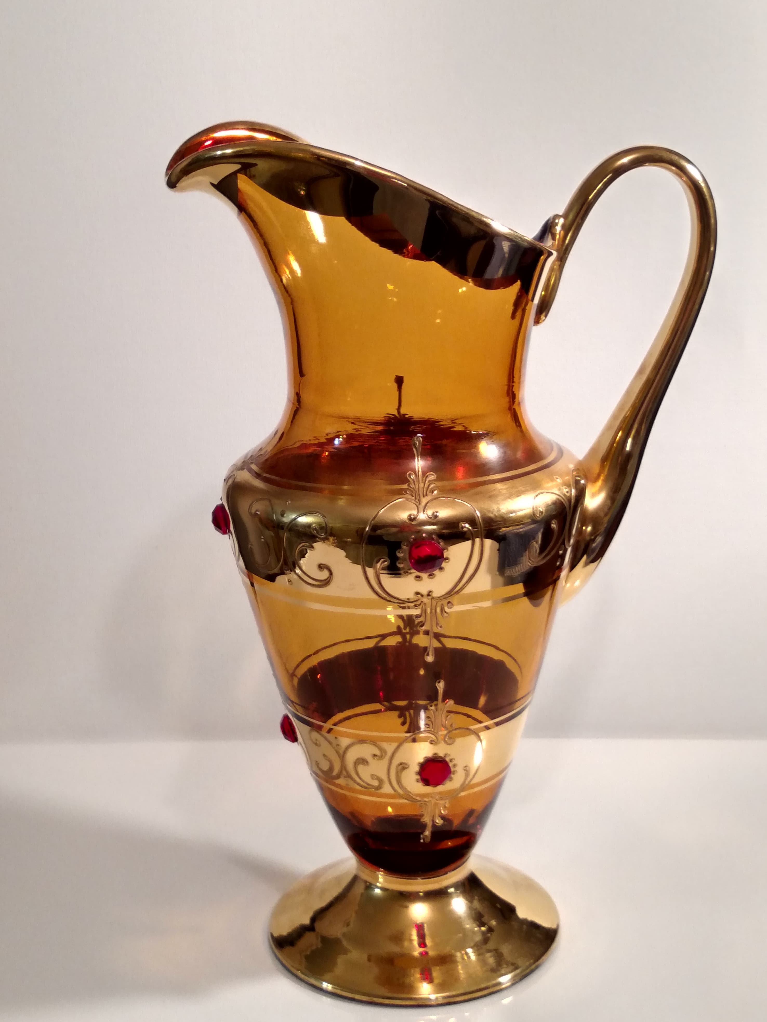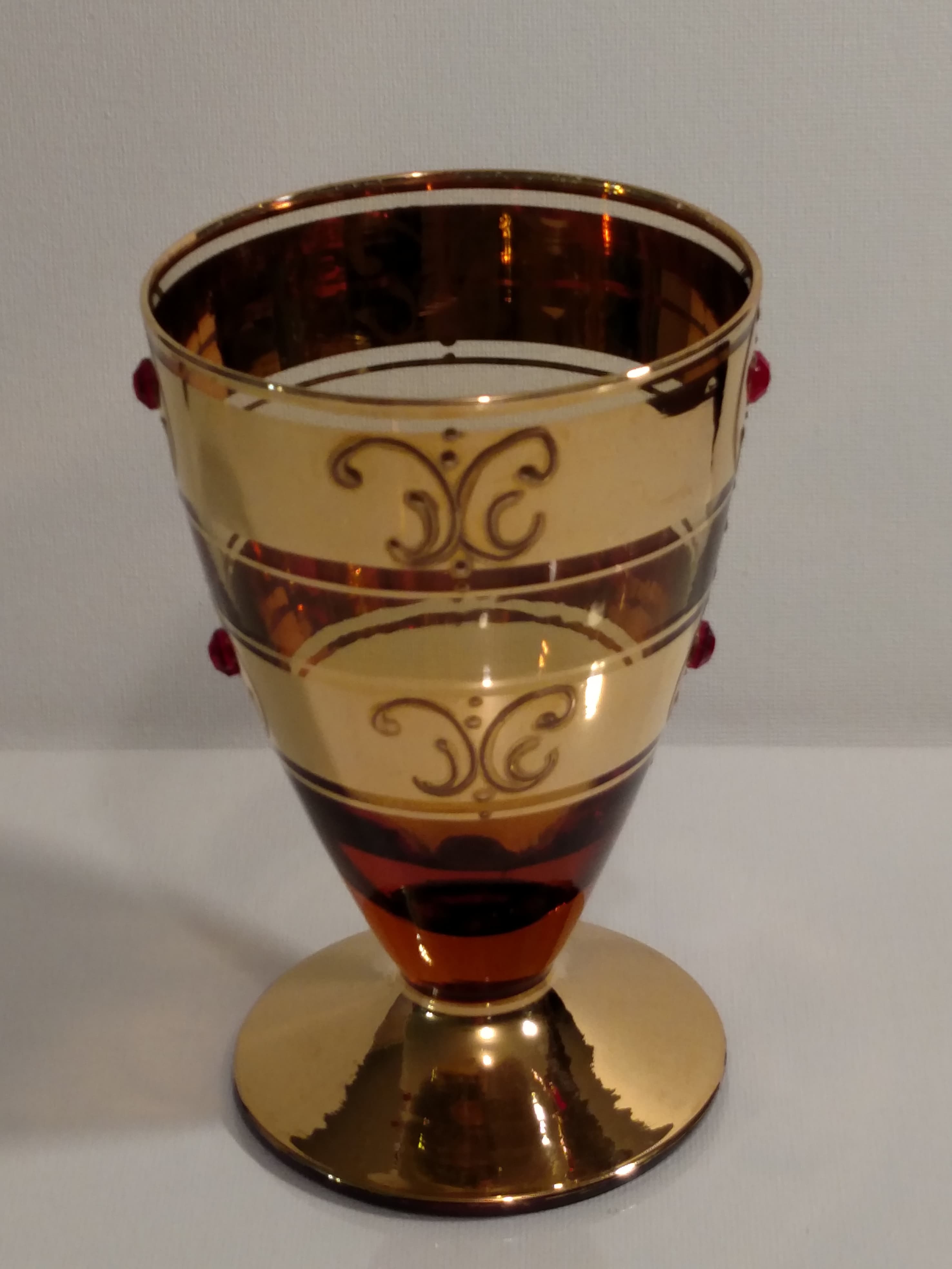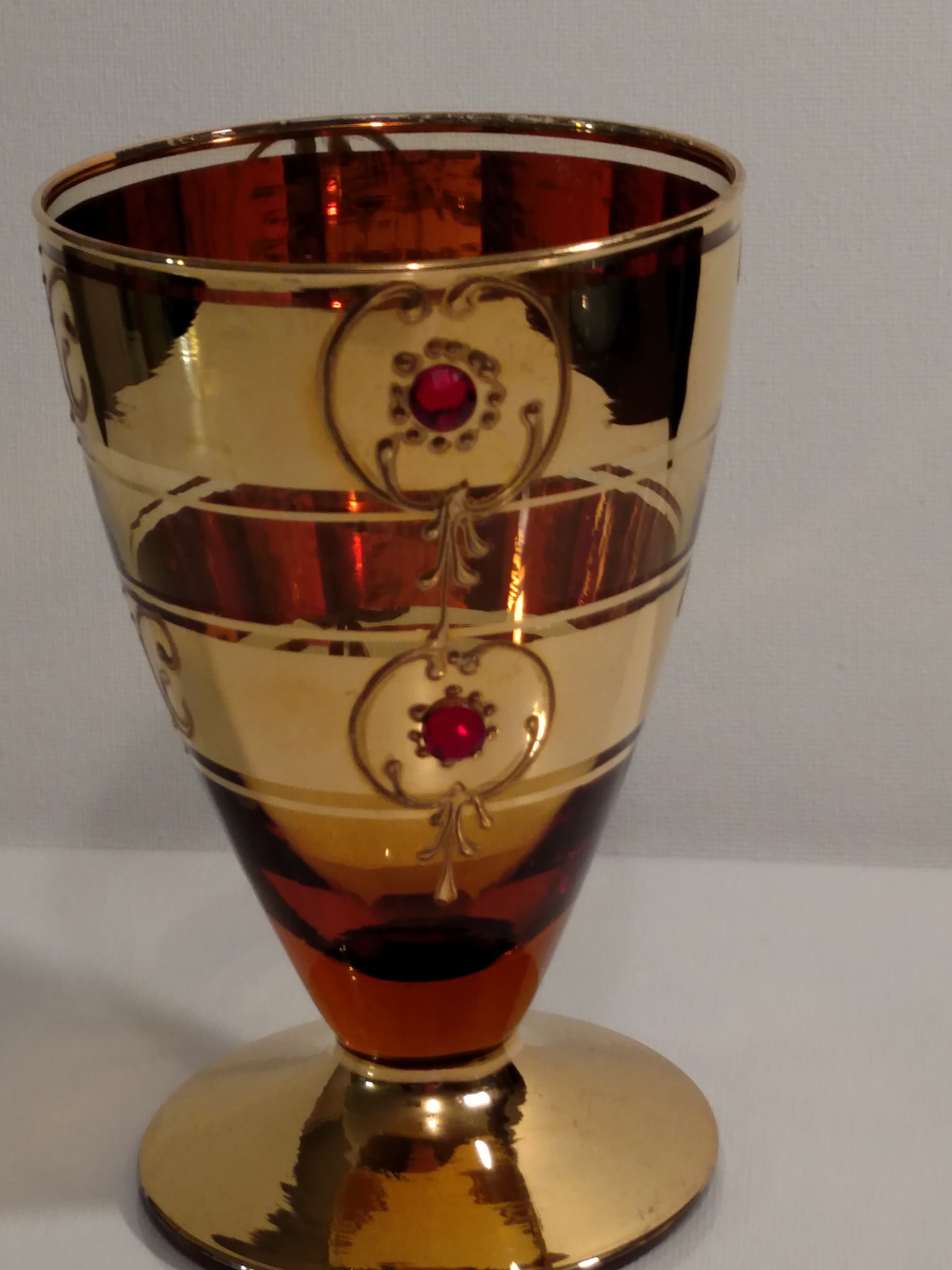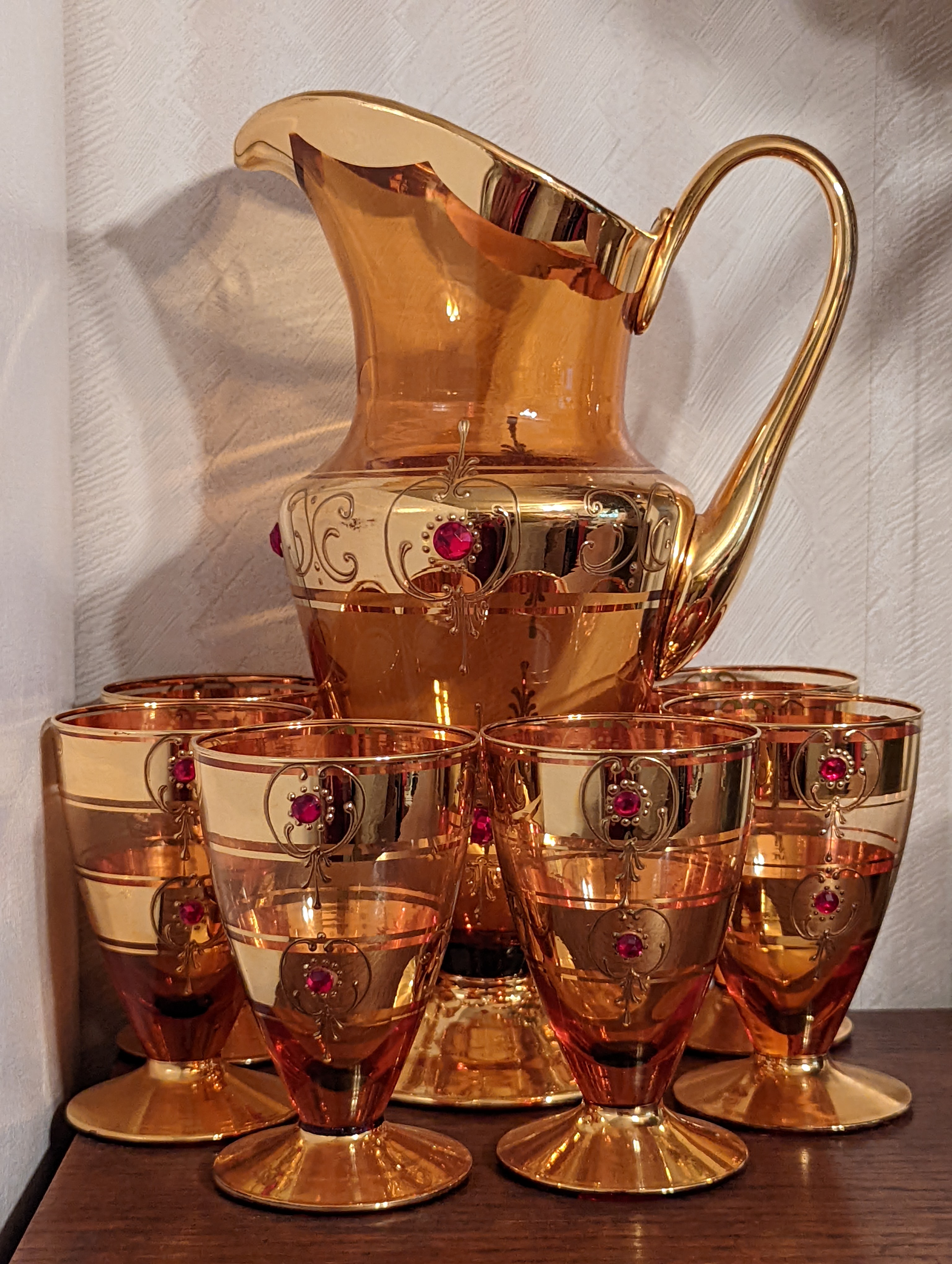 This set likely dates back to the mid-20th century, a period known for vibrant glassware designs. While the maker is not specified, similar styles were produced by companies like Fostoria and West Virginia Glass, known for their decorative glassware featuring gold embellishments.