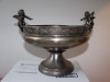 The spout of the pitcher has an intricate design under it. It appears to be the image of an angry bearded man, reminiscent of Posiedon. It is embossed and surrounded with scrolls and leafy background swirls. The image is also in an oval shape and about 3.5 inches long.