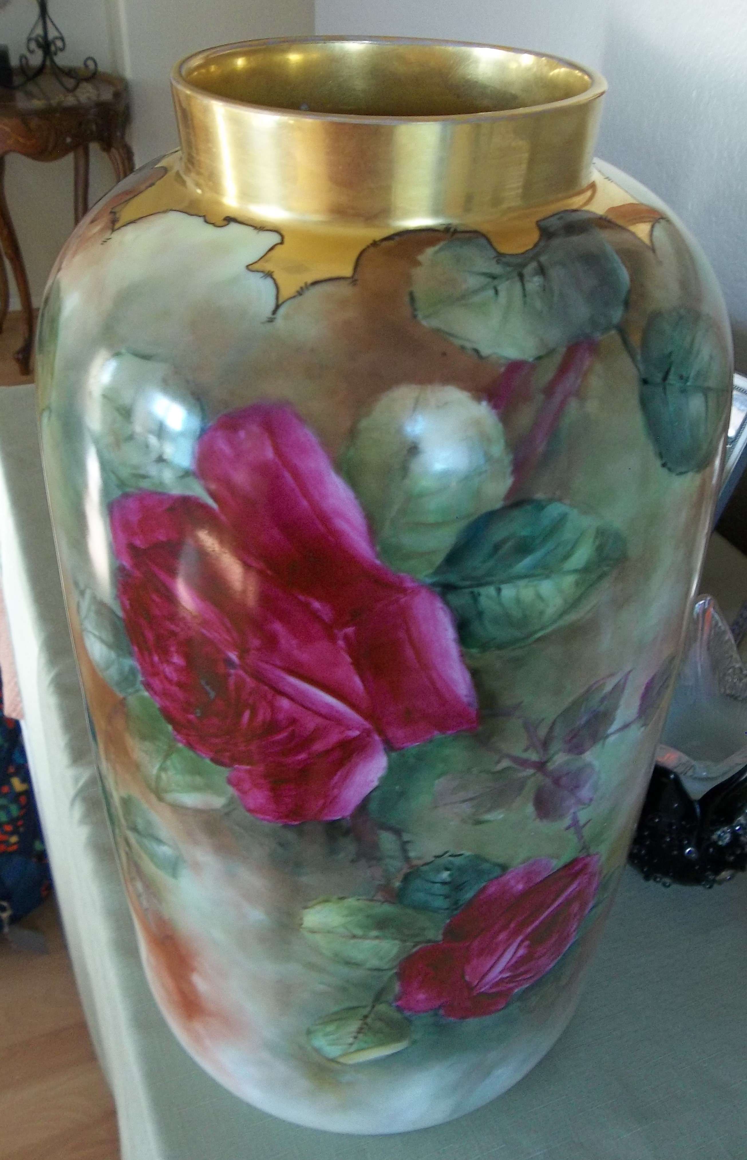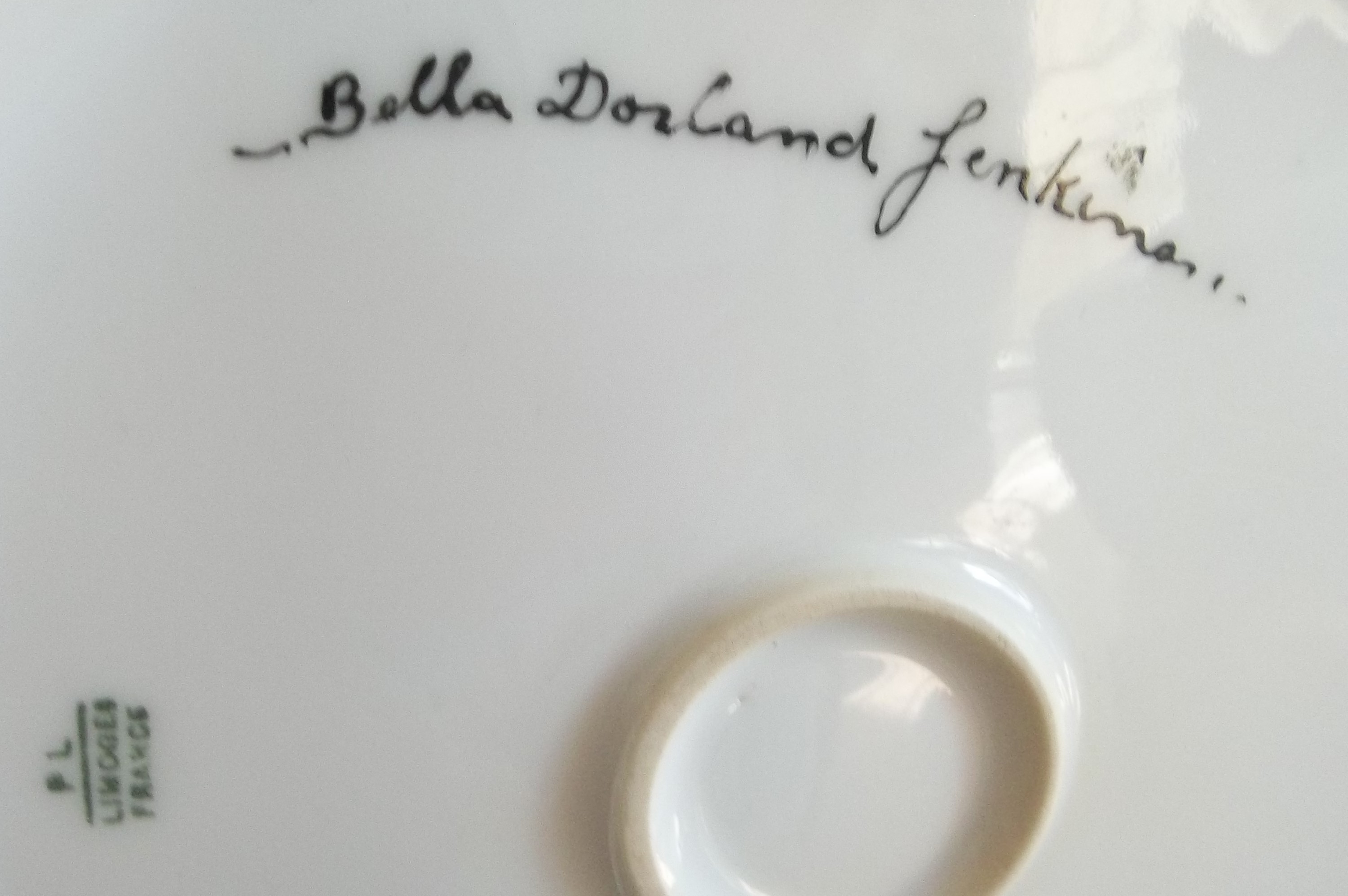 This PL Limoges France vase or jar is 15" tall and covered with deep magenta roses and leaves with sort of a beige background toward the bottom. It is signed by artist Bella Dorland Jenkins which I researched as a ceramic shop owner in San Francisco in the early 1900s. She was born in 1864 and died 1940. She gave china painting lessons in her shop. This piece is in very good condition with no chips or cracks and just a few surface scratches. What would it be worth?