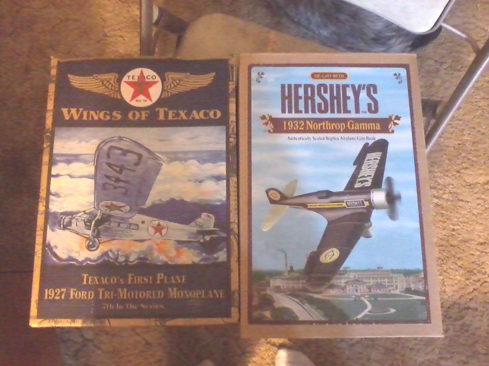 Collectible coin bank planes. One is Hershey's and other is Wings of Texaco. Both die cast metal with working parts and in original packaging.