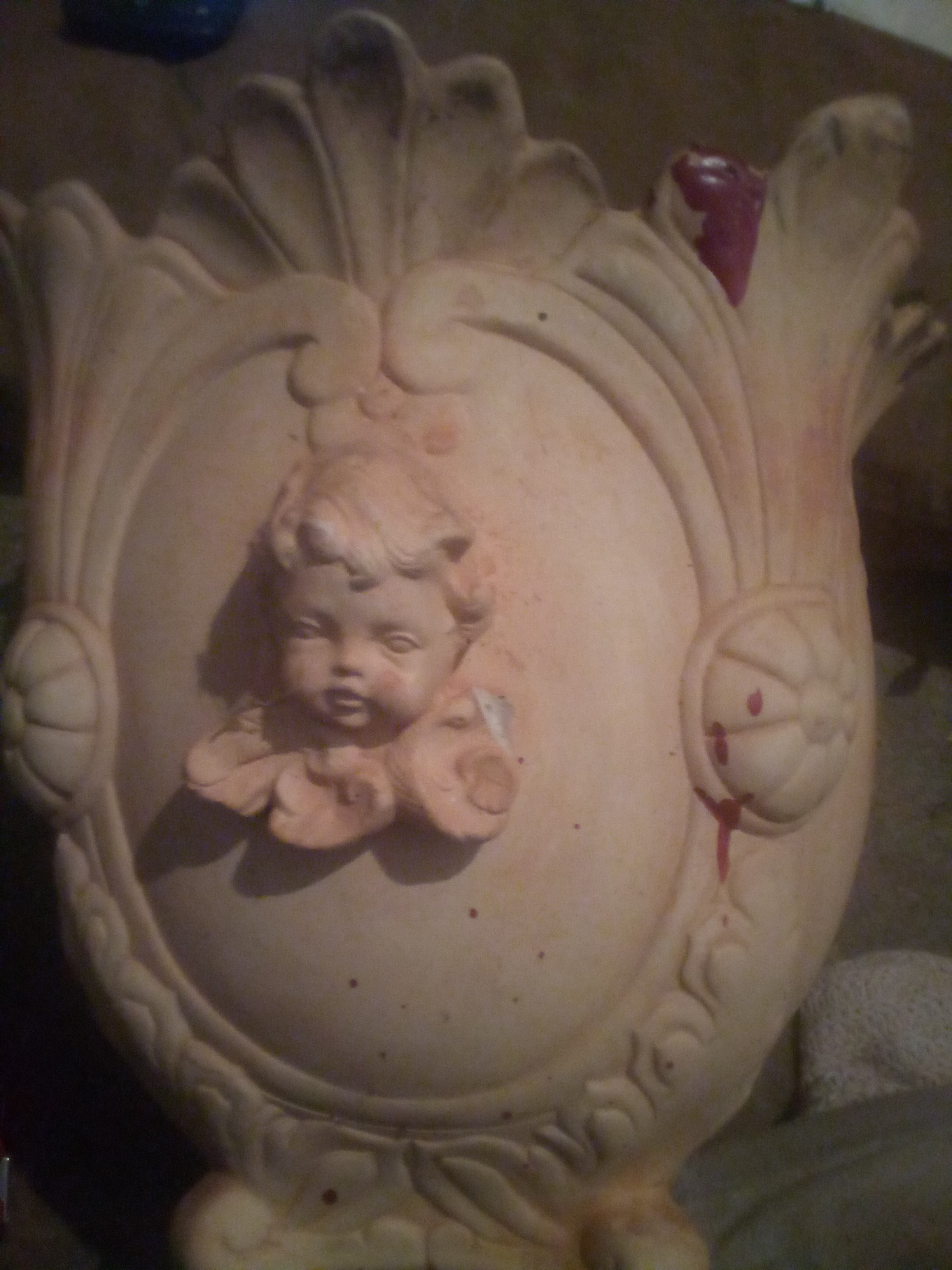 This planter pot is crafted from pottery, featuring a distinctive design that includes a head of a nymph and additional decorative elements. The dimensions are approximately 1 foot tall and 4 to 6 inches wide, making it a moderately sized decorative piece. The weight is about 5 pounds.