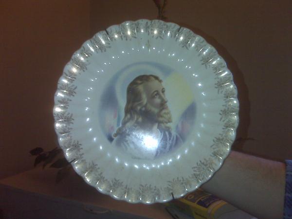 a white plate with a picture of jesus painted on it. it has a subscription on bottom of inspiration mcconnell . it has 28k gold leaves around the edges of plate.