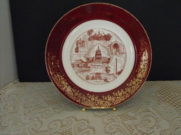 Deep Burgundy edging etched in Gold, White center with deep burgundy points of interest: Mt. Vernon, Tomb of Unknown Soldier, The White House, Thomas Jefferson Memorial, Abraham Lincoln Memorial, Washington, D.C.