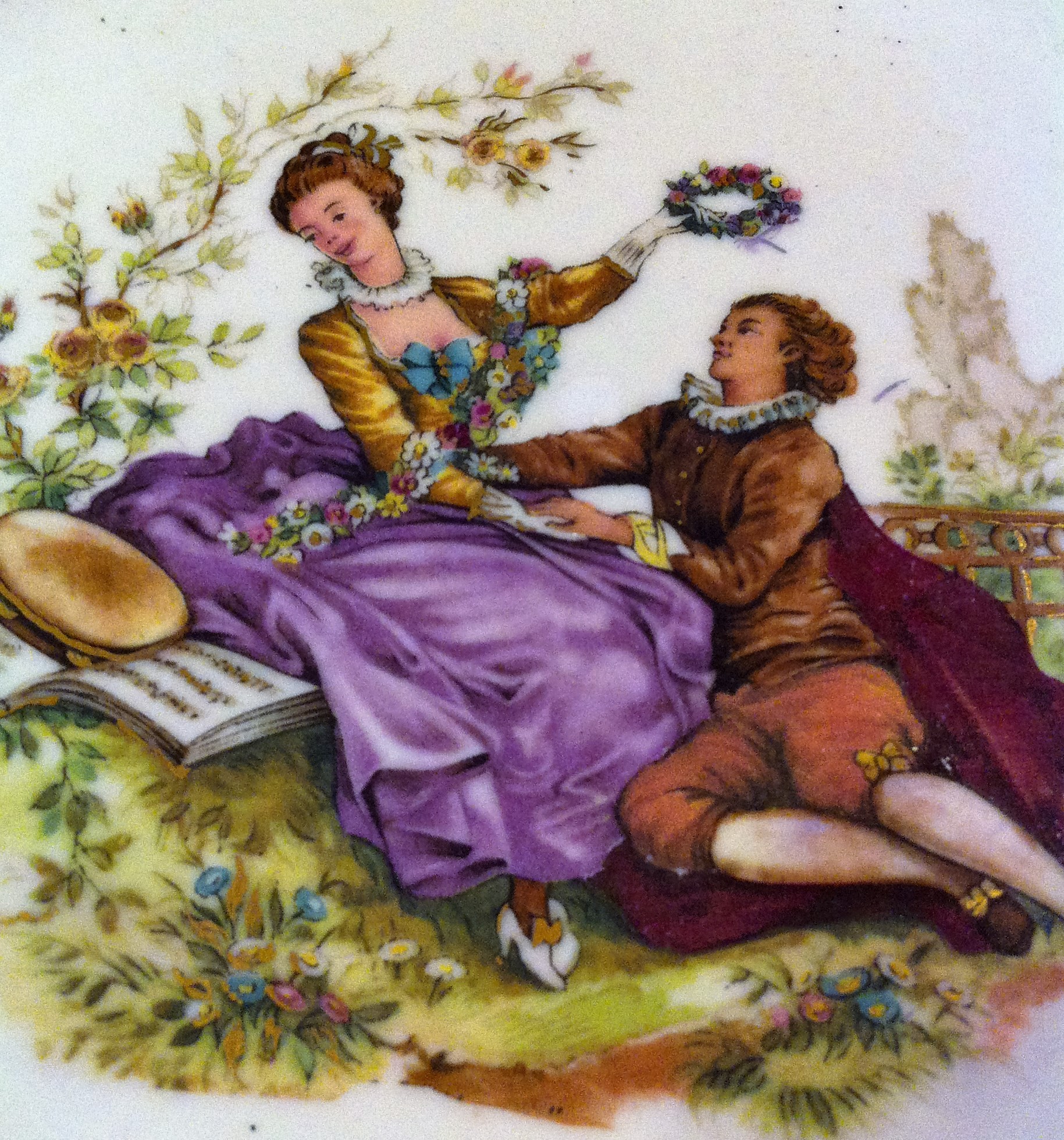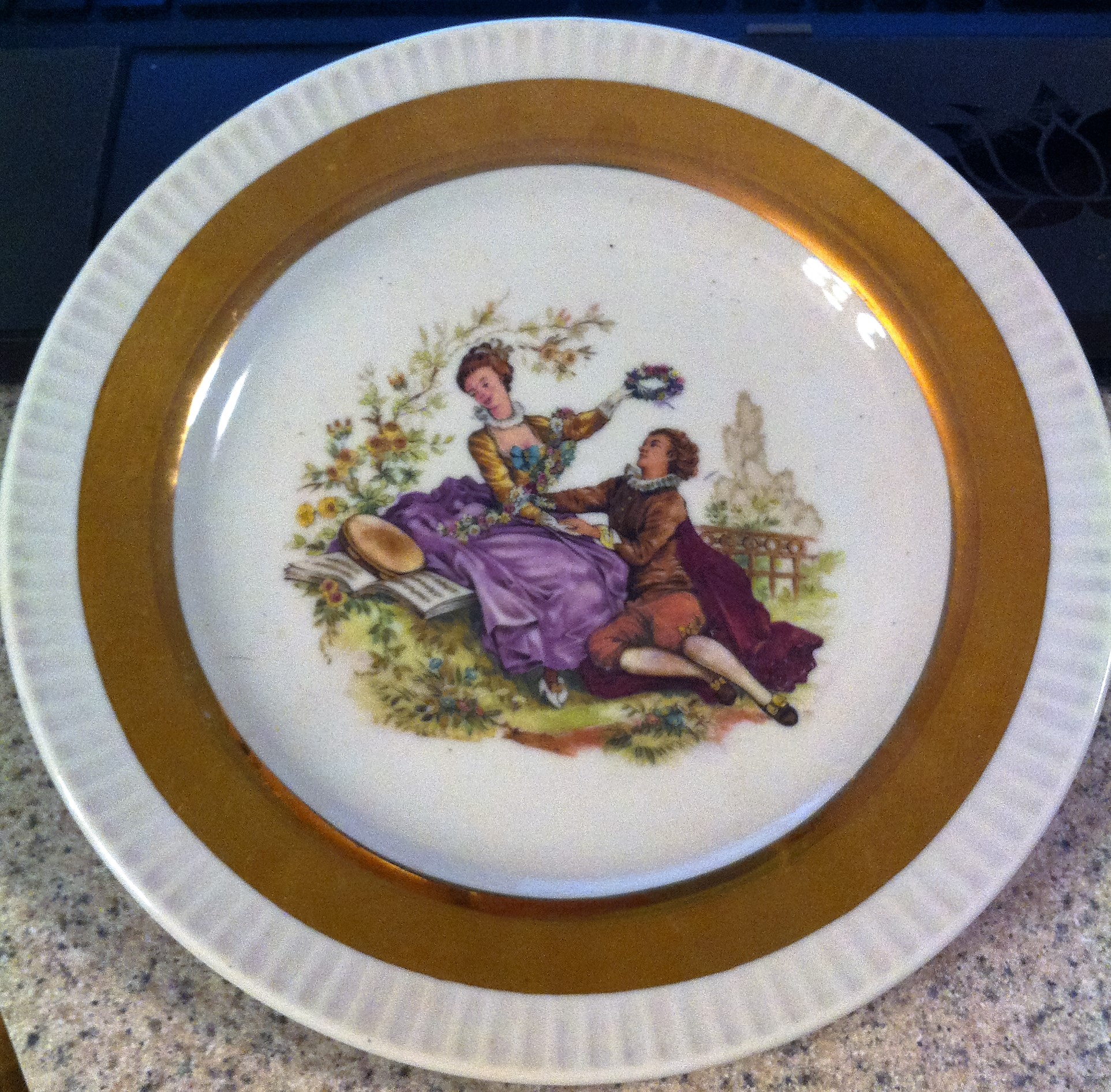 8 inches plate with a Victorian man and lady what looks like sitting in a field with delicate gold accents