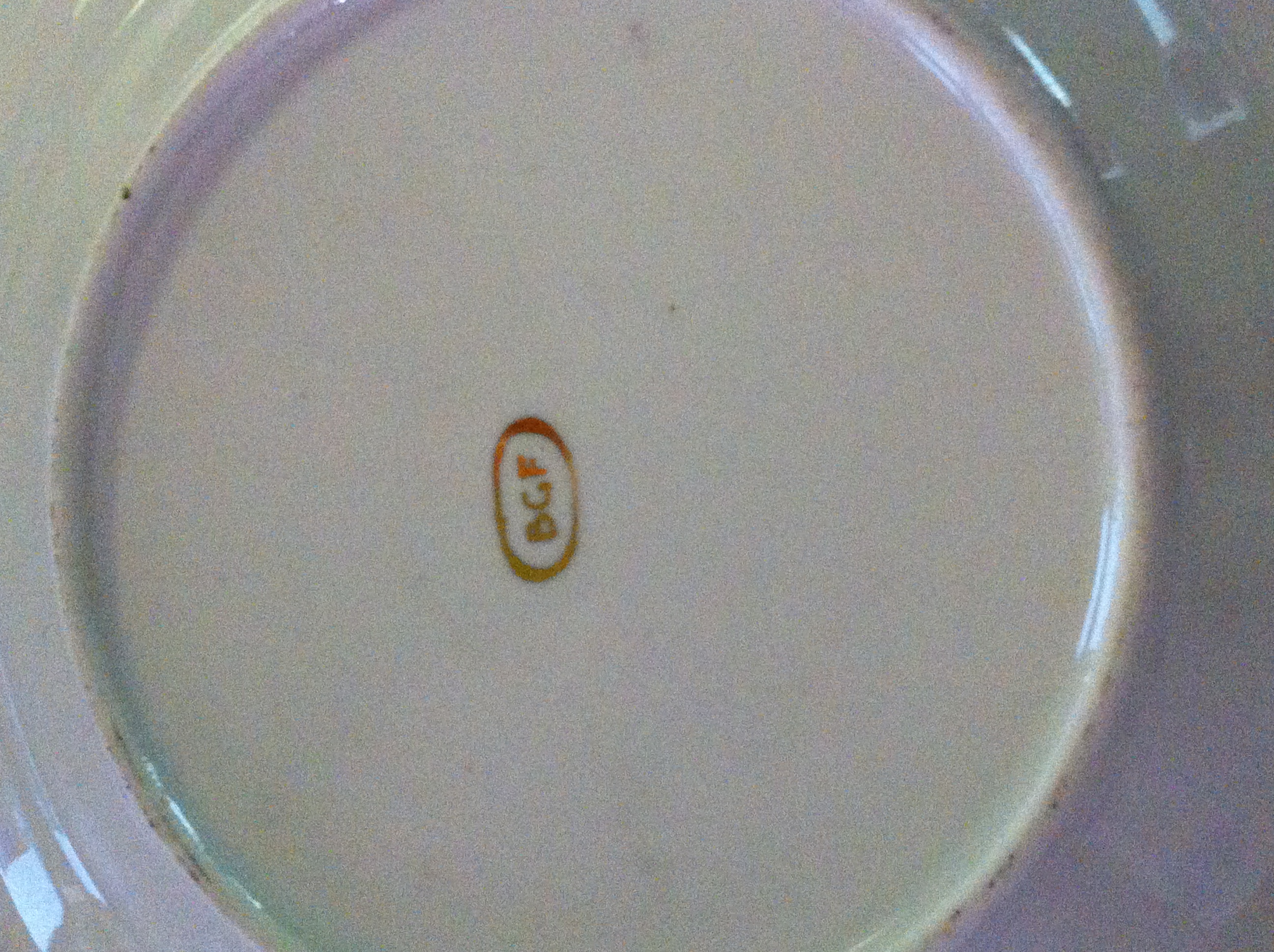 back of plate has in gold a oval circle with the letters BGF
