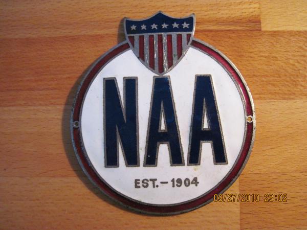 It is a red, white and blue steel enameled emblem made of steel or some other metal with the letters NAA Est.-1904. The NAA is in an oval with a crest above it. On the back of the emblem is a stamp in the metal that says "J.W. Colgan CO. Makers, Boston, Mass".